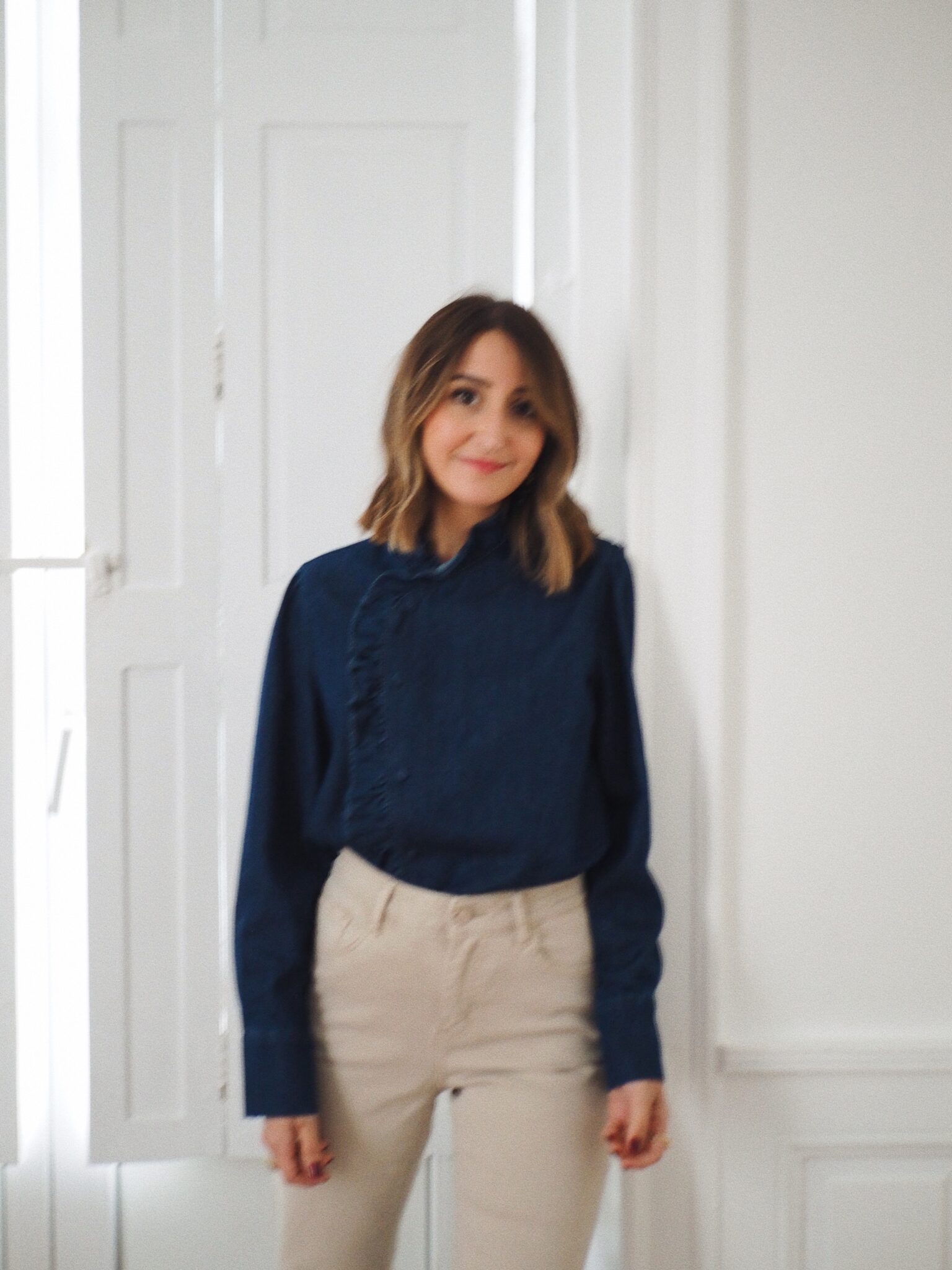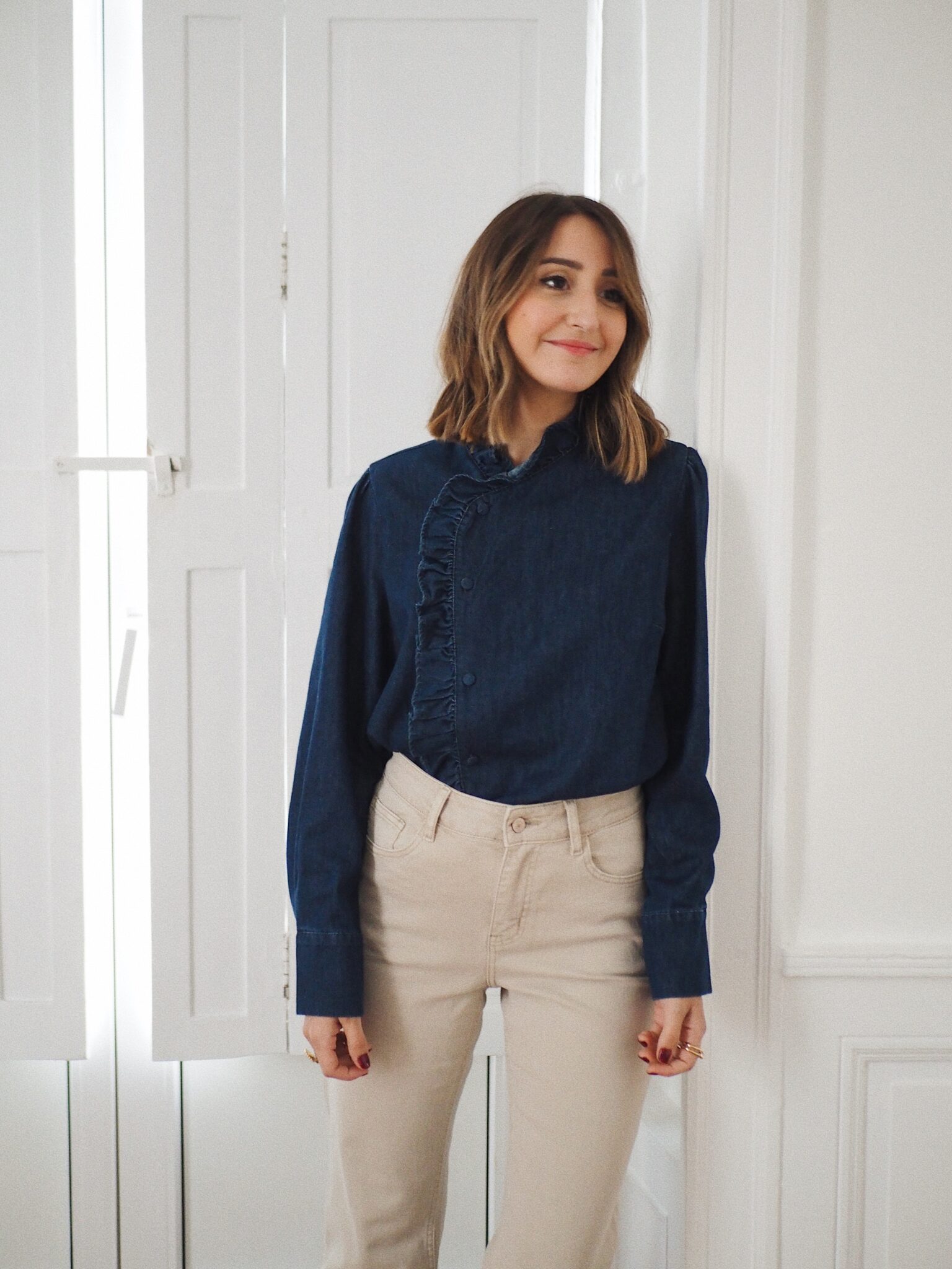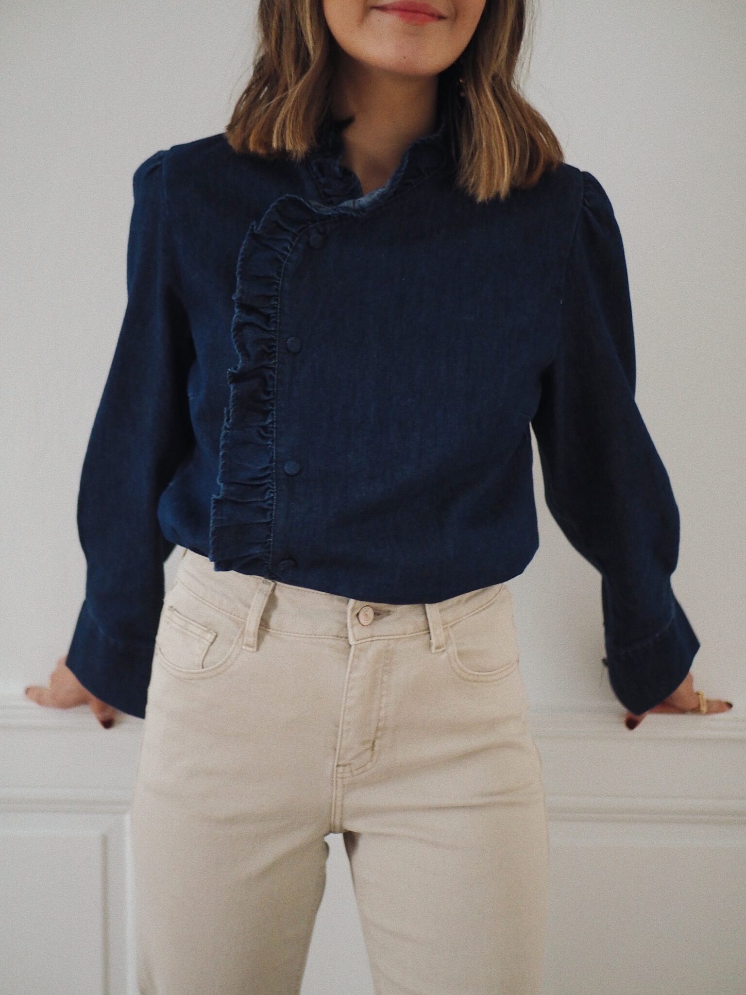 – Blouse en denim – Coloris bleu indigo – Coupe droite légèrement ample – Col montant avec petit volant délicat – Patte de boutonnage asymétrique orné d’un volant ton sur ton – Manches longues avec poignets boutonnés – L’élégance du denim revisitée dans une version féminine et raffinée