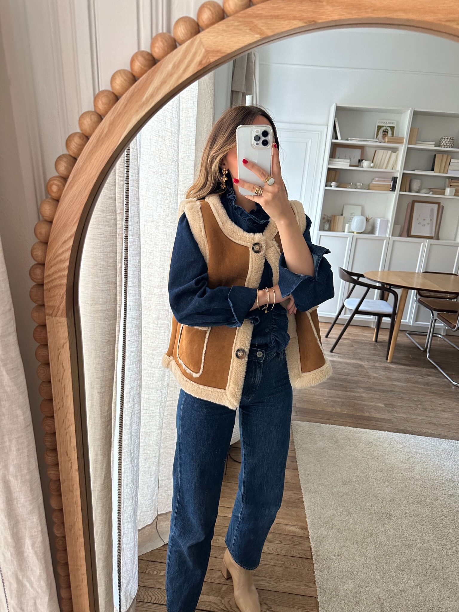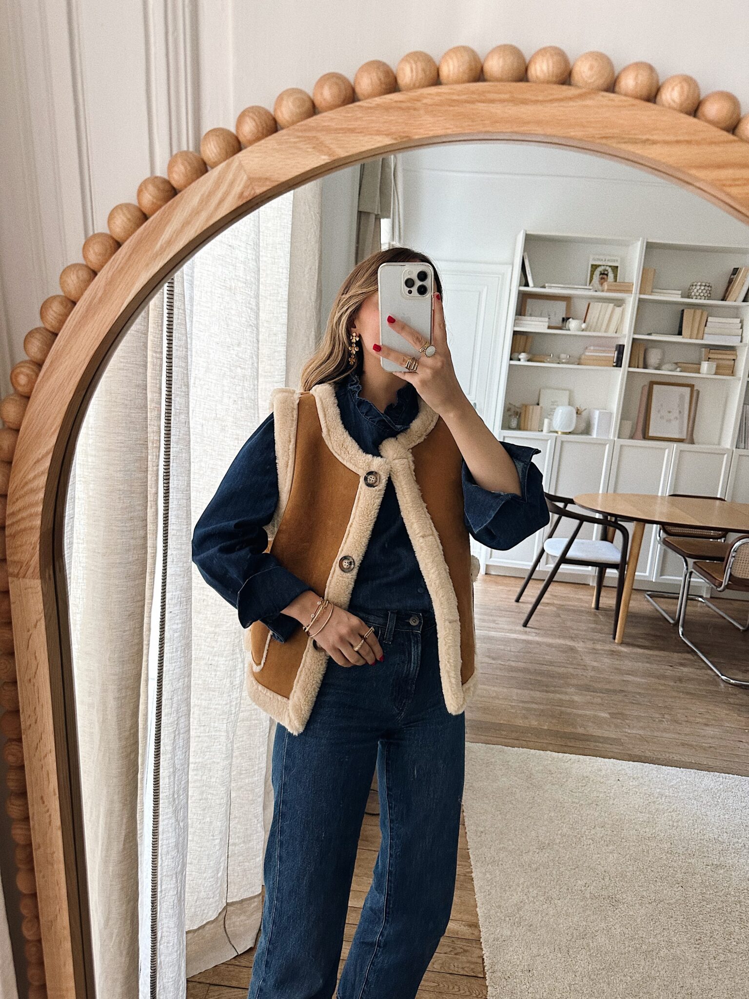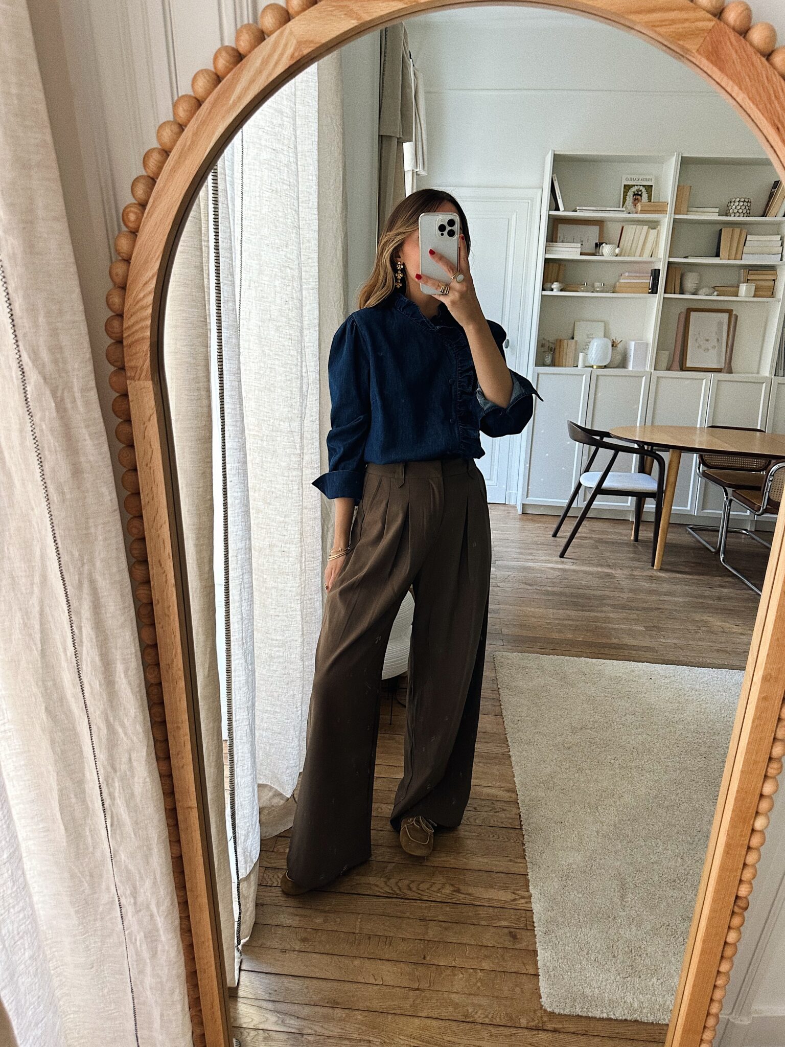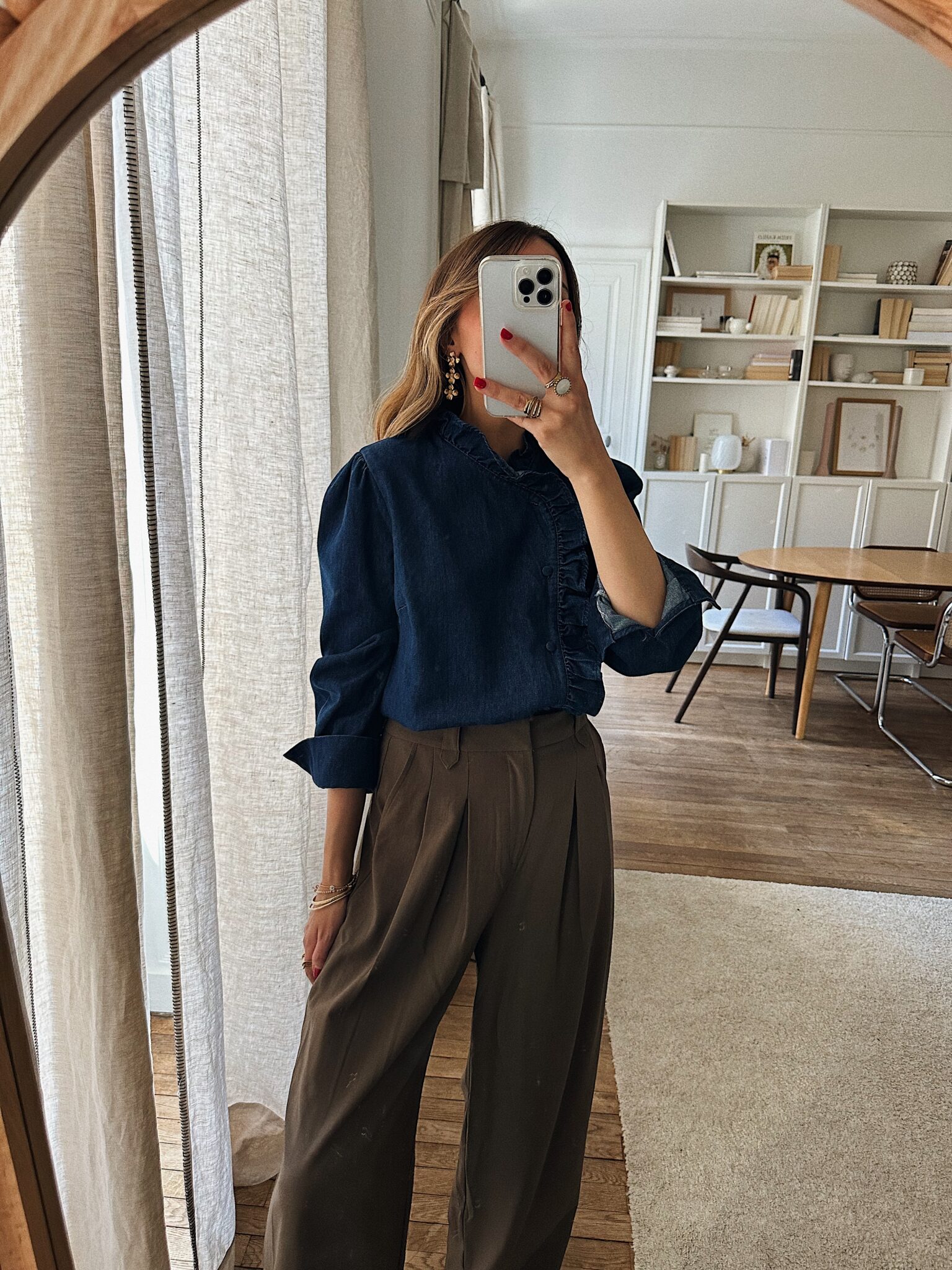 – Blouse en denim – Coloris bleu indigo – Coupe droite légèrement ample – Col montant avec petit volant délicat – Patte de boutonnage asymétrique orné d’un volant ton sur ton – Manches longues avec poignets boutonnés – L’élégance du denim revisitée dans une version féminine et raffinée