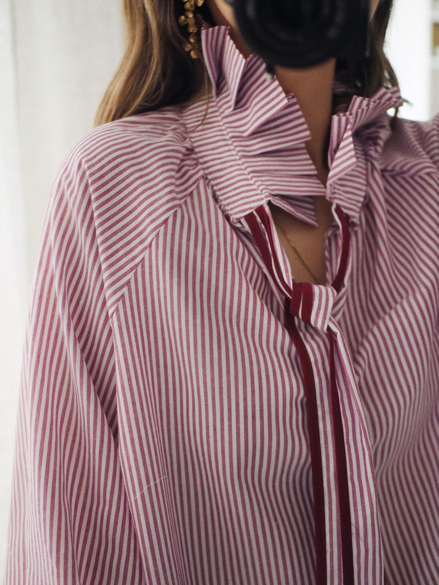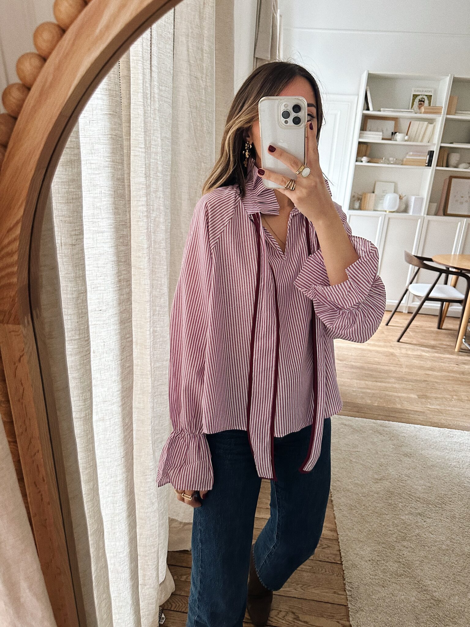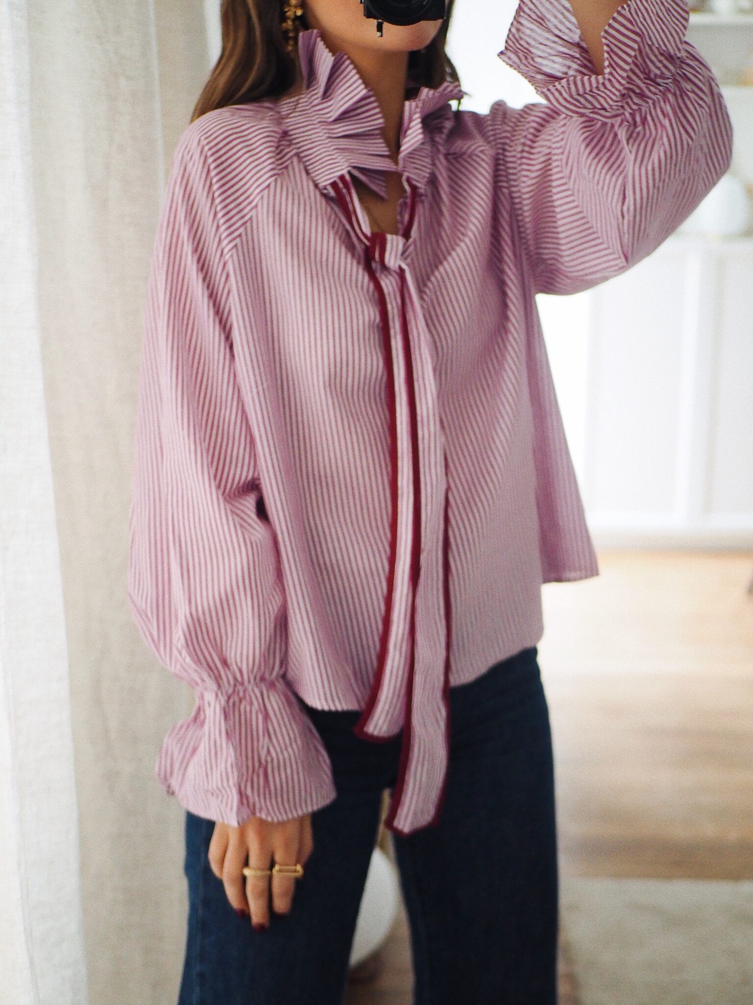 – Blouse à fines rayures verticales – Coloris burgundy et blanc – Coupe fluide et confortable pour un tombé élégant – Col rond volanté avec lavallière à nouer sur le devant – Manches longues légèrement bouffantes avec poignets élastiqués à large volant – Une blouse pleine de charme qui allie légèreté et détails raffinés