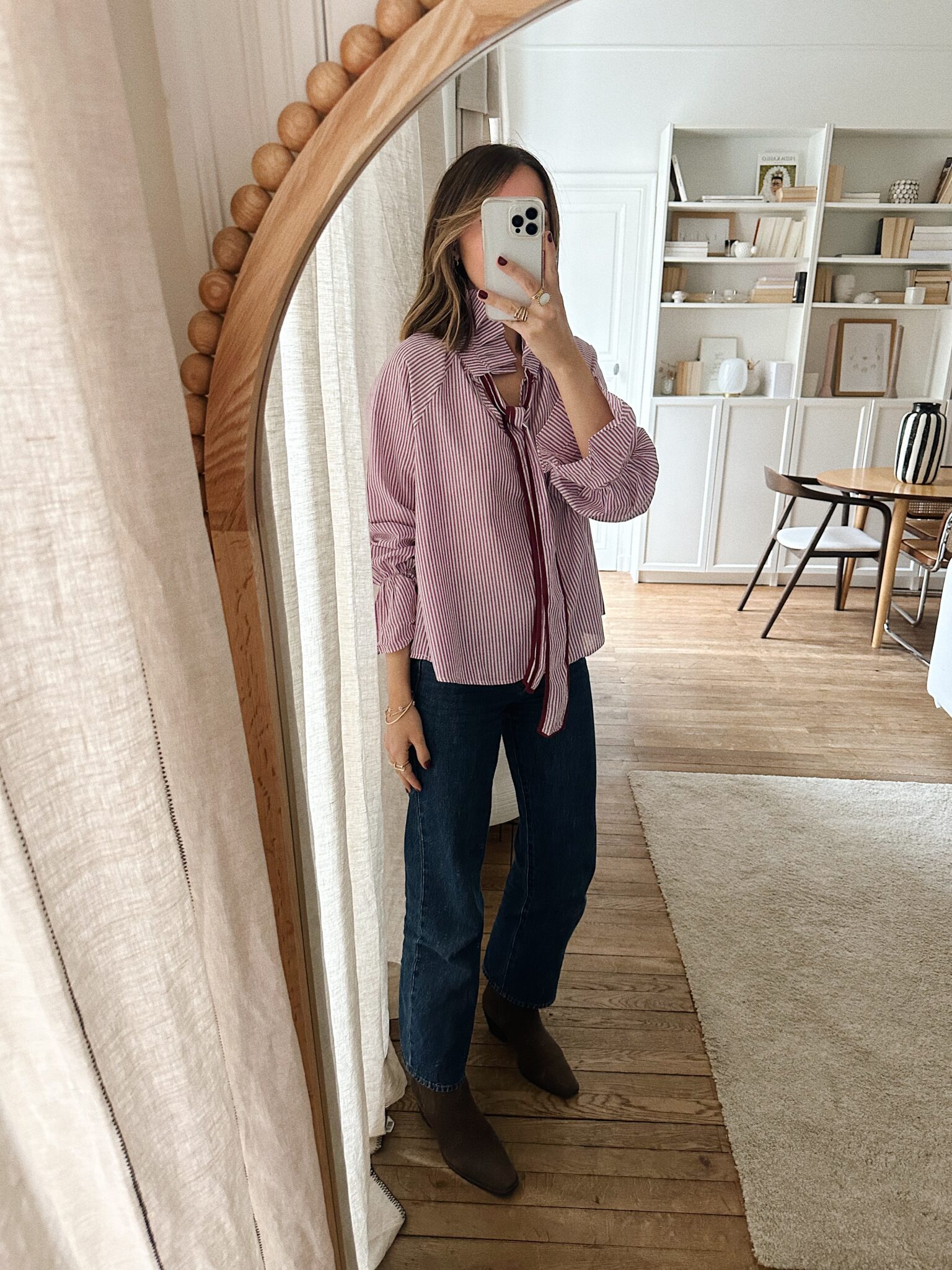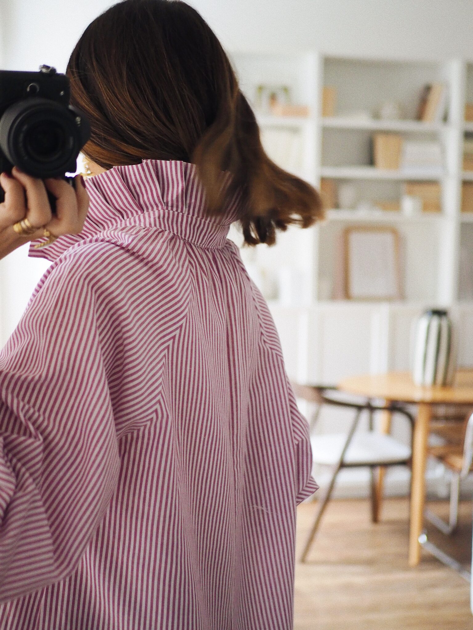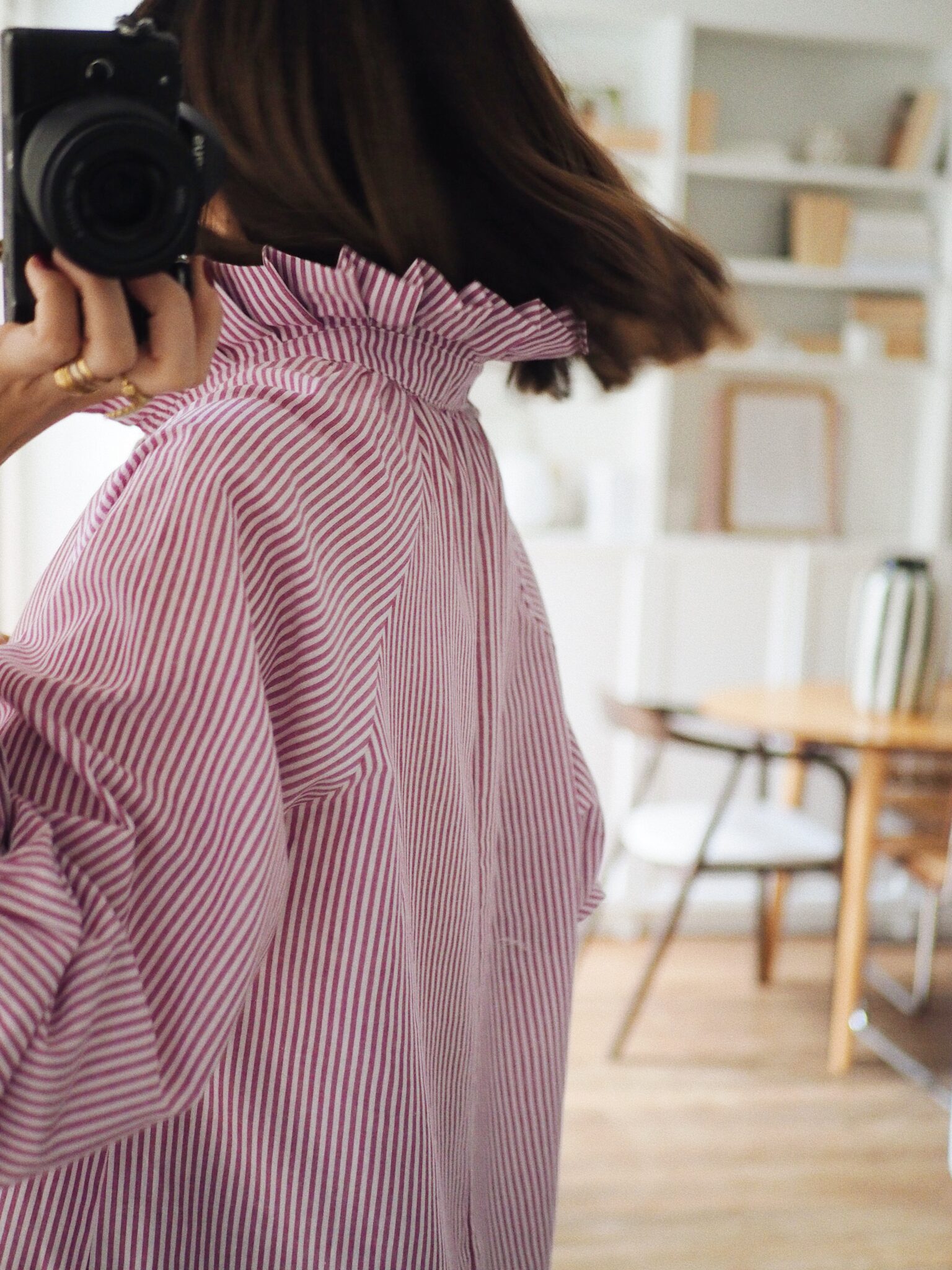 – Blouse à fines rayures verticales – Coloris burgundy et blanc – Coupe fluide et confortable pour un tombé élégant – Col rond volanté avec lavallière à nouer sur le devant – Manches longues légèrement bouffantes avec poignets élastiqués à large volant – Une blouse pleine de charme qui allie légèreté et détails raffinés