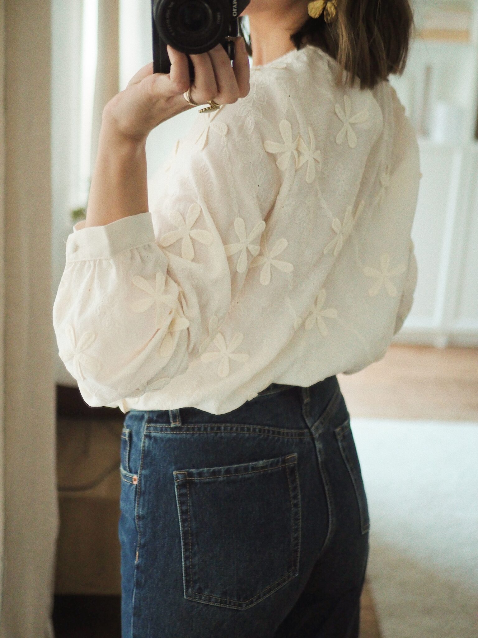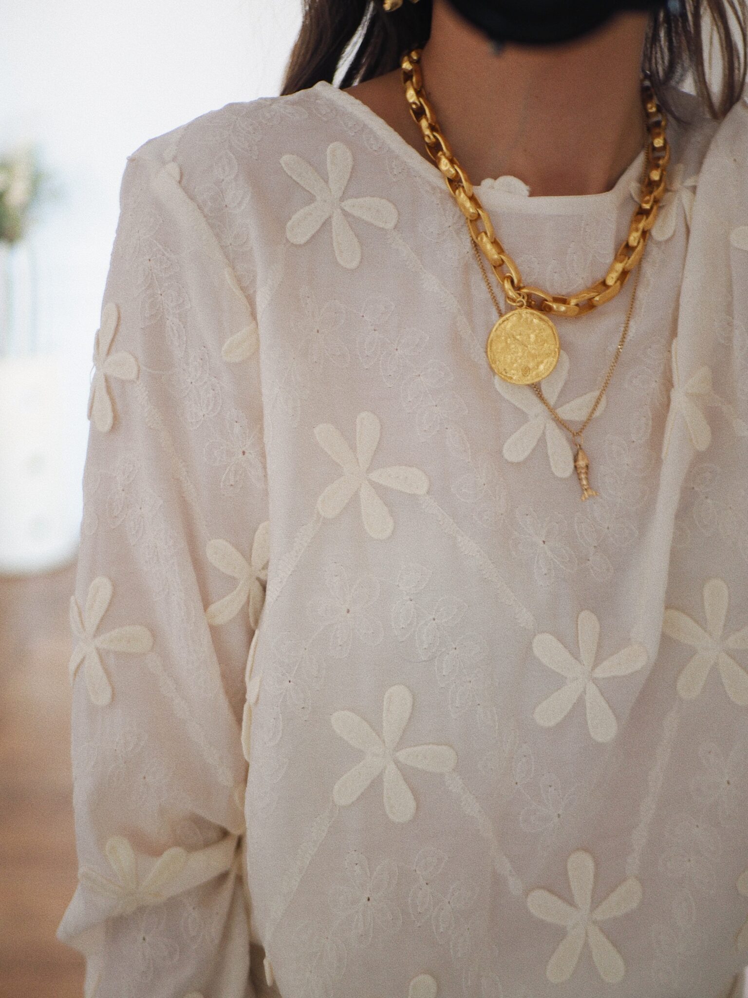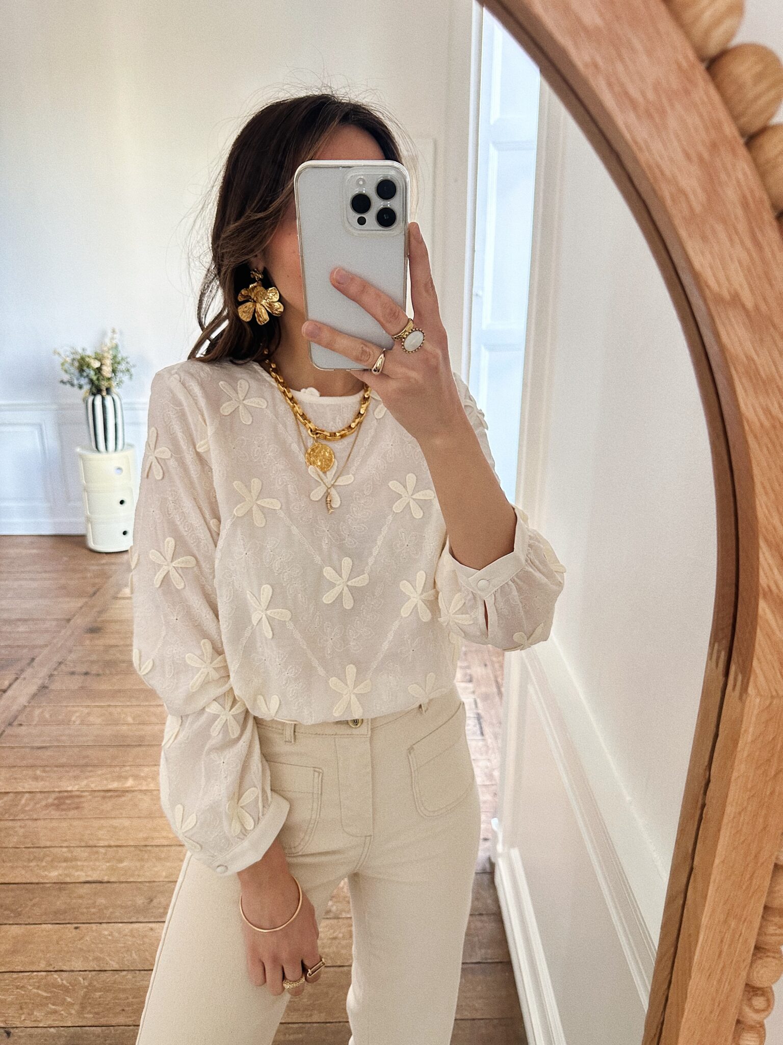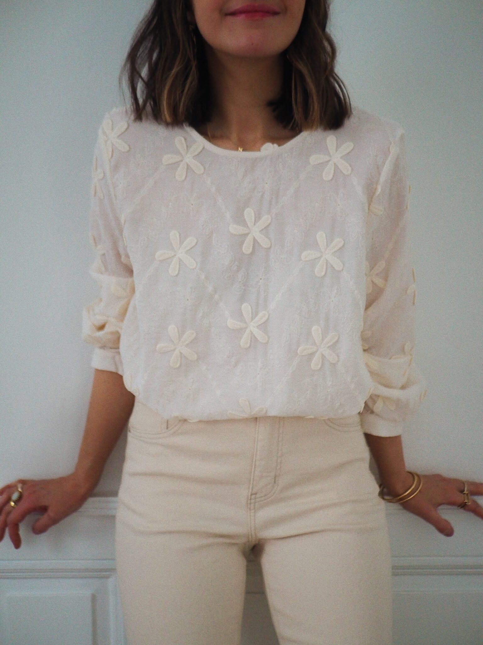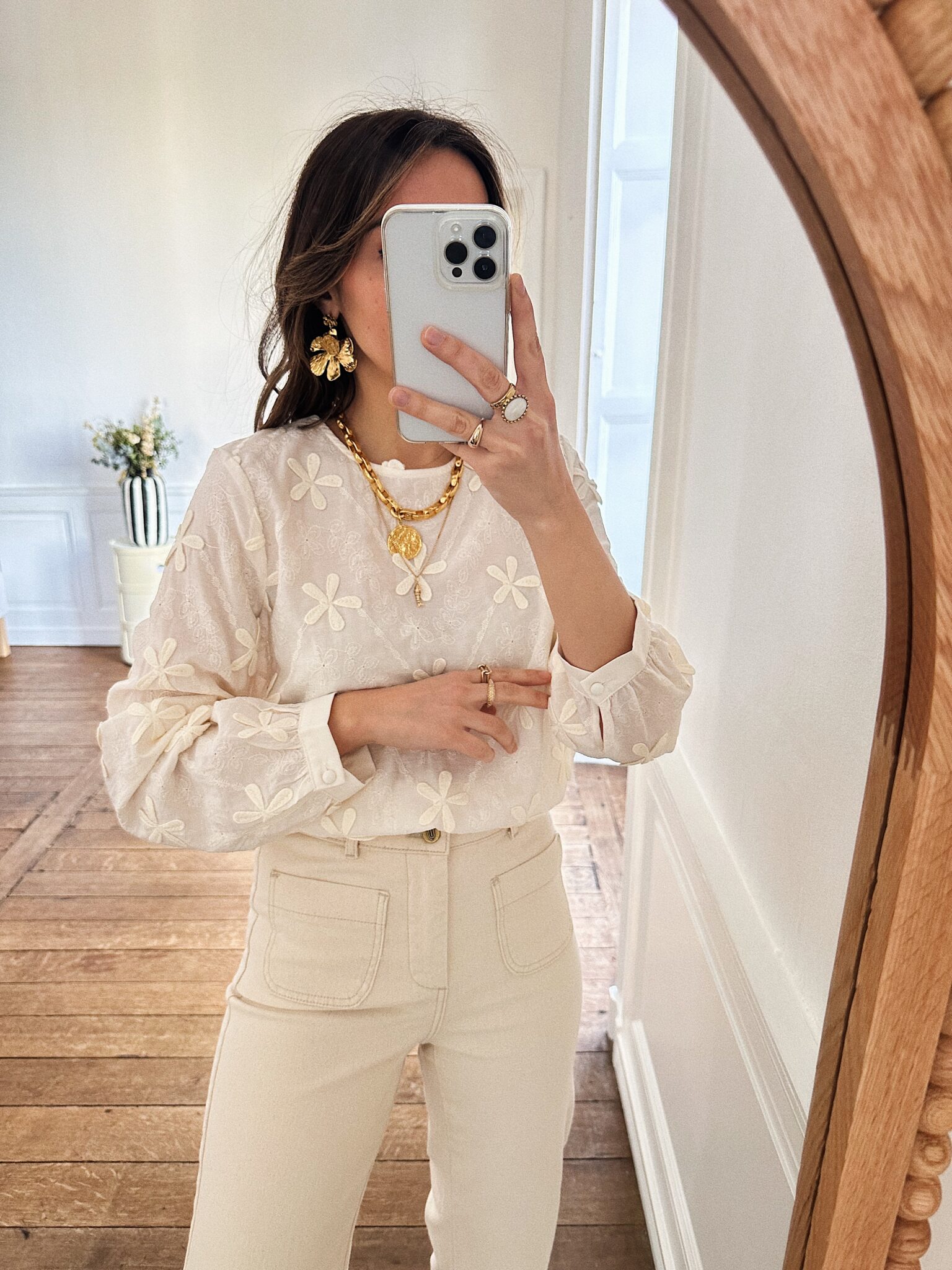– Blouse fluide au toucher doux et texturé – Broderie florale en relief ton sur ton – Coloris écru lumineux et intemporel – Encolure ronde – Fermeture par goutte et petit bouton au dos – Coupe droite légèrement ample – Manches longues finitions poignets boutonnés – Une allure moderne à la fois chic et raffinée