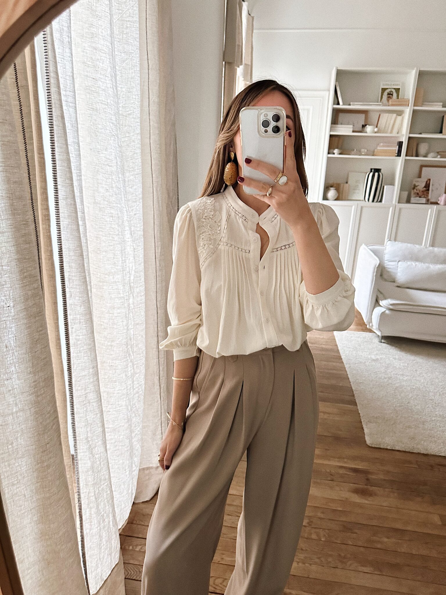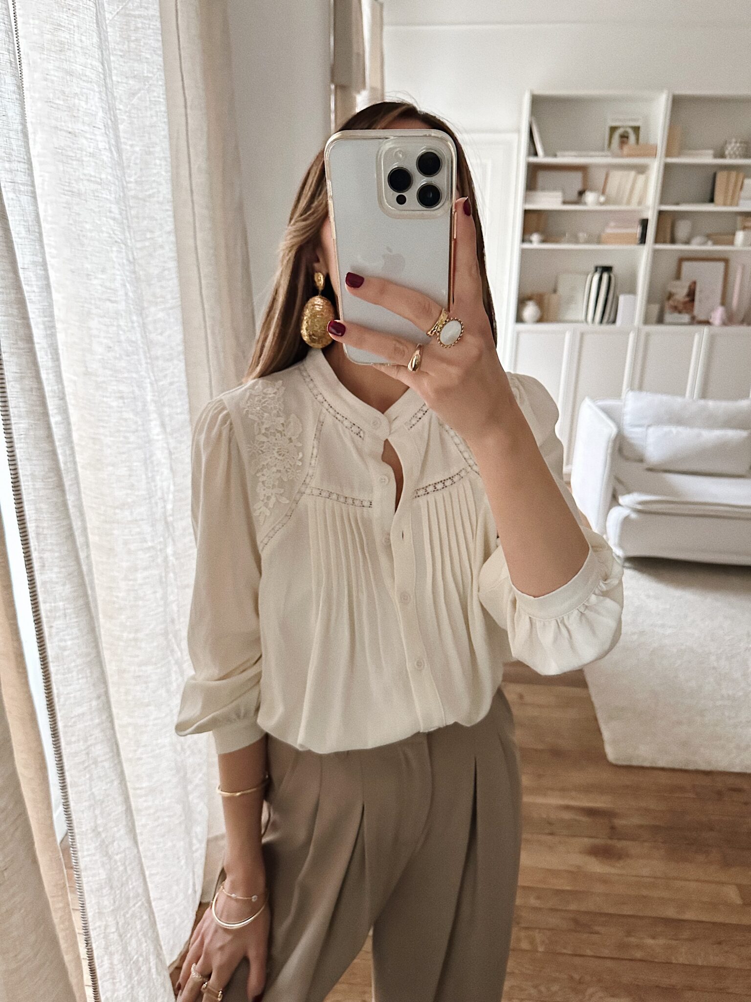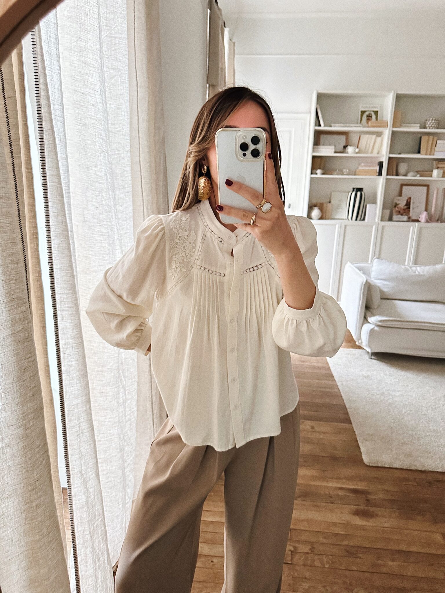 *Cet article sera expédié à partir du jeudi 6 novembre Si votre commande contient d’autres pièces, l’expédition se fera en un seul envoi à cette date Merci pour votre patience et votre confiance 🤍 – Blouse fluide en coton mélangé douce et délicate – Coloris blanc – Coupe droite légèrement ample avec pinces et plis sur le devant pour plus de structure et de fluidité – Encolure ronde avec empiècements brodés sur le haut des épaules ajoutant du relief – Fermeture boutonnée ton sur ton sur toute la longueur – Manches longues légèrement bouffantes et poignets boutonnés – Sous-vêtements clairs ou nude à privilégier – Existe aussi en coloris marron et coloris prune