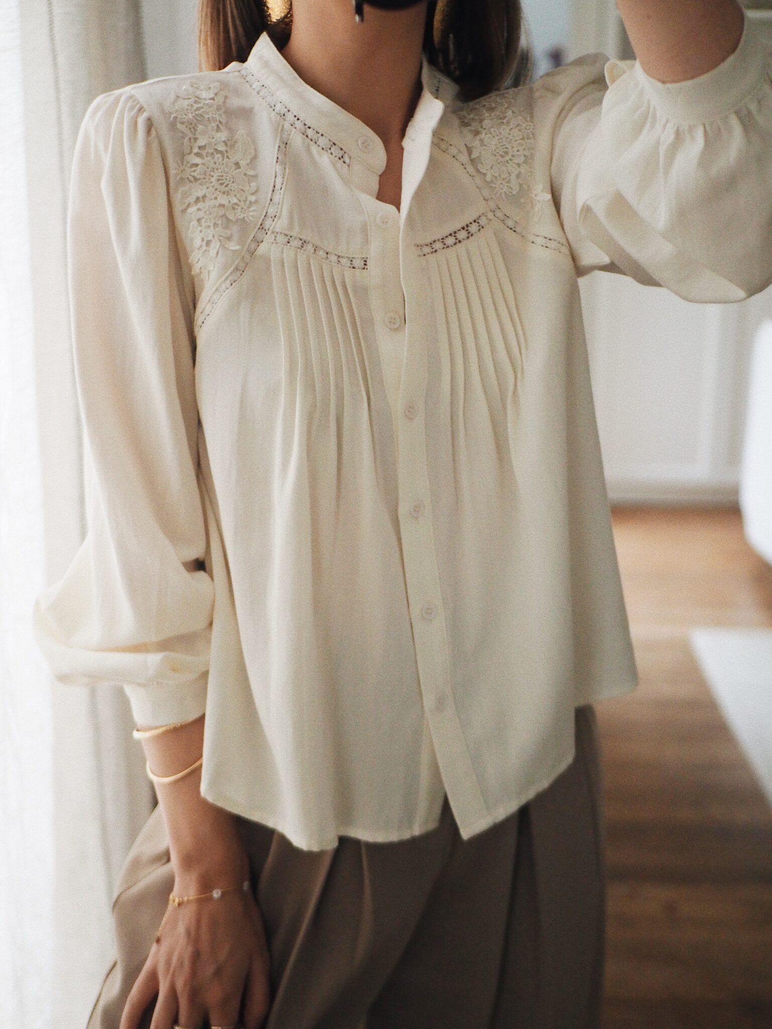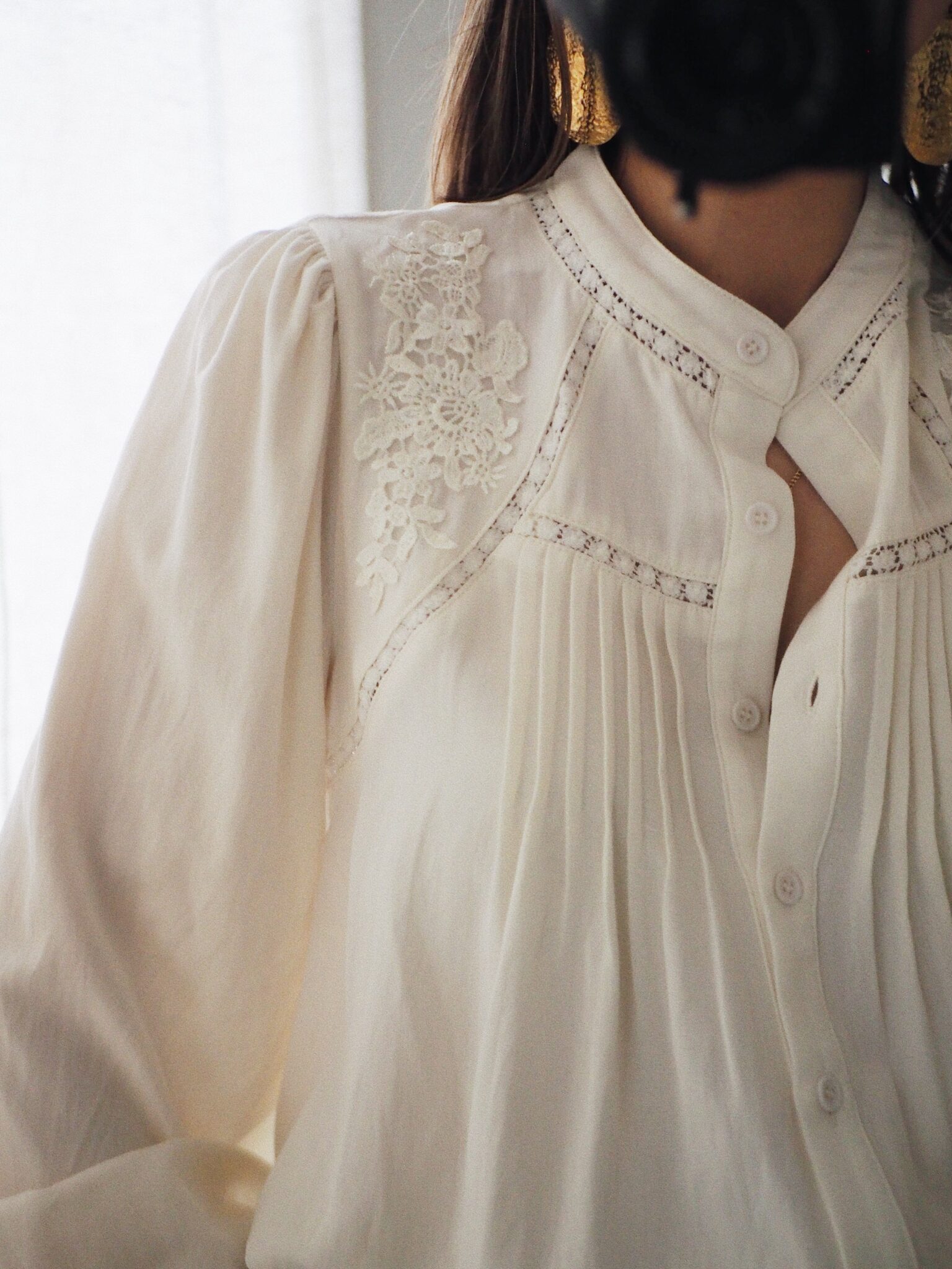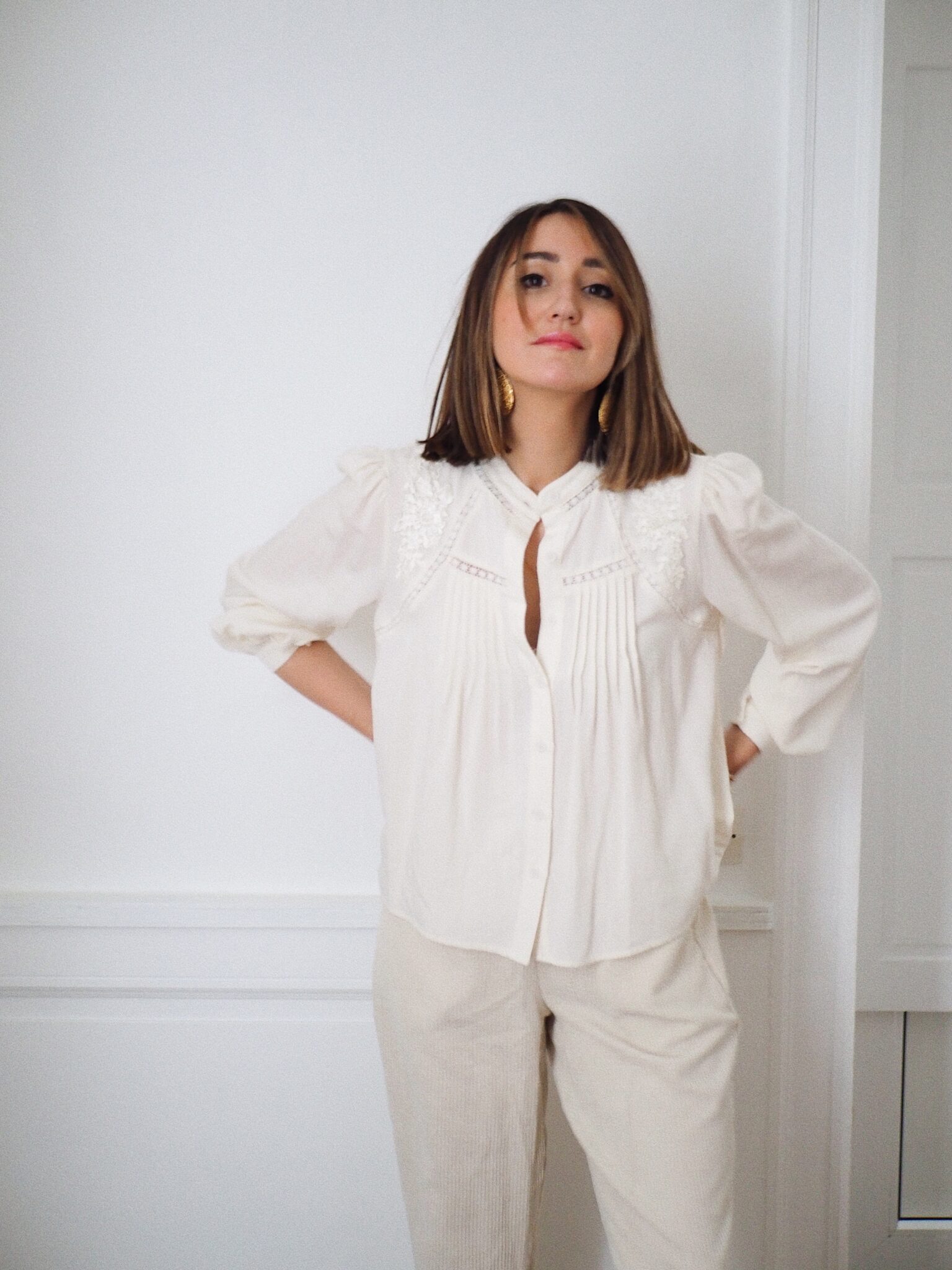 *Cet article sera expédié à partir du jeudi 6 novembre Si votre commande contient d’autres pièces, l’expédition se fera en un seul envoi à cette date Merci pour votre patience et votre confiance 🤍 – Blouse fluide en coton mélangé douce et délicate – Coloris blanc – Coupe droite légèrement ample avec pinces et plis sur le devant pour plus de structure et de fluidité – Encolure ronde avec empiècements brodés sur le haut des épaules ajoutant du relief – Fermeture boutonnée ton sur ton sur toute la longueur – Manches longues légèrement bouffantes et poignets boutonnés – Sous-vêtements clairs ou nude à privilégier – Existe aussi en coloris marron et coloris prune