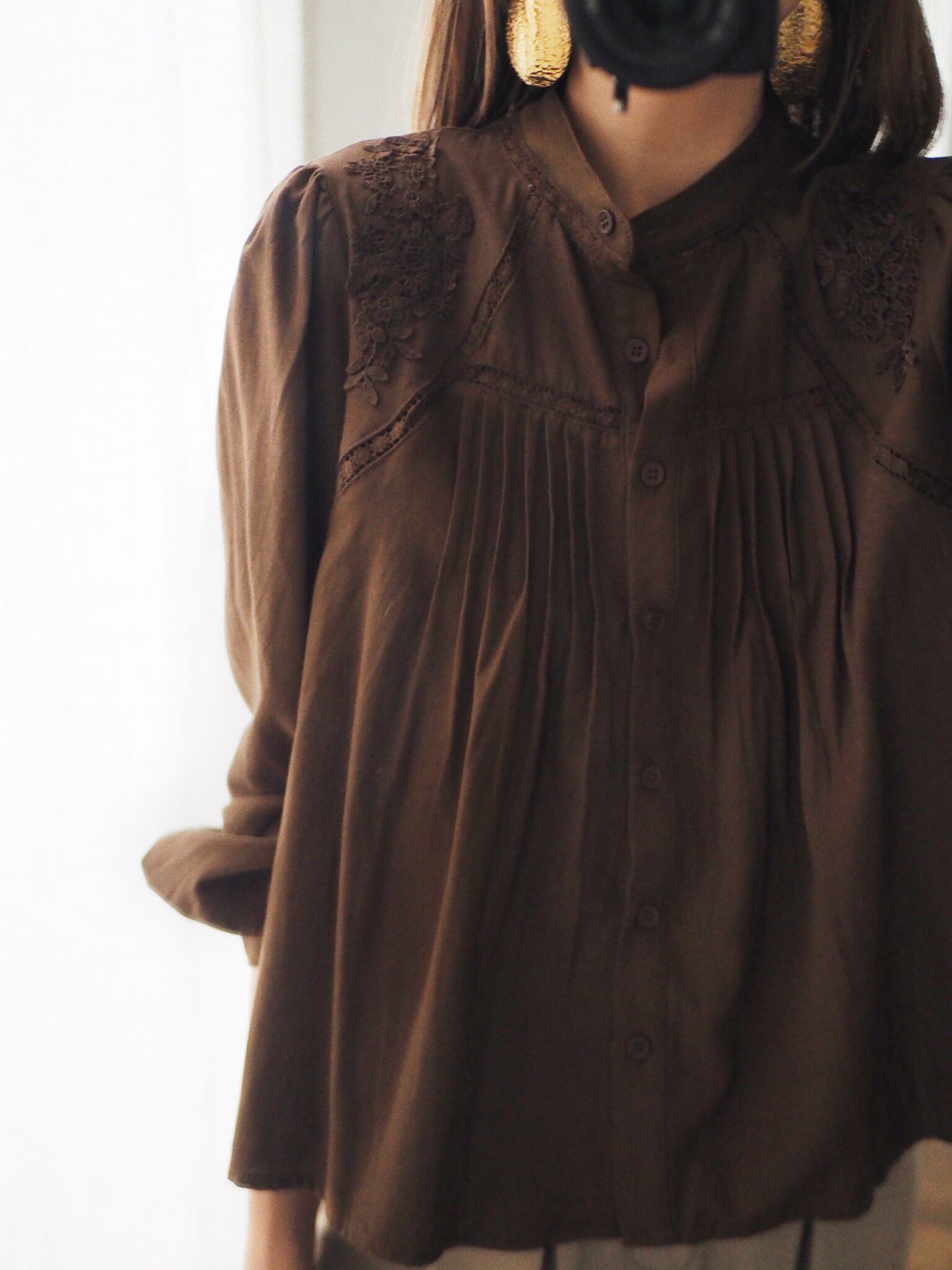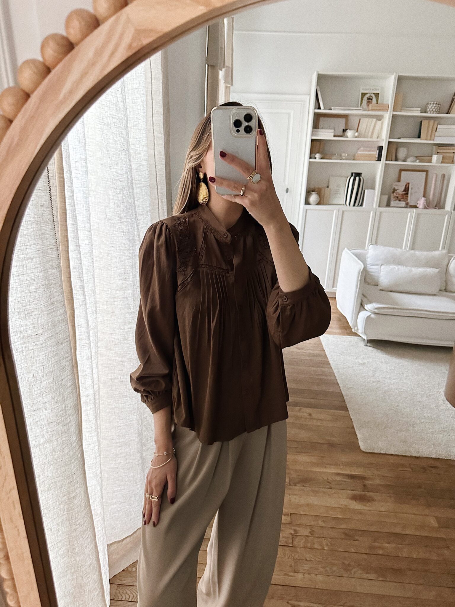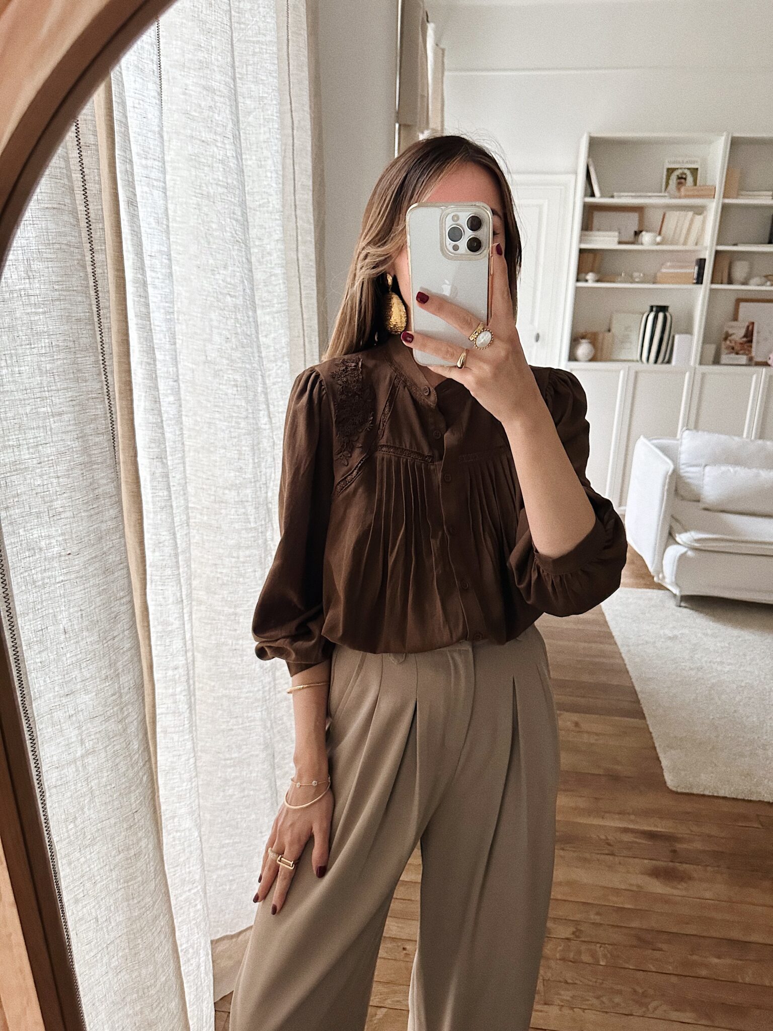 – Blouse fluide en coton mélangé douce et délicate – Coloris marron – Coupe droite légèrement ample avec pinces et plis sur le devant pour plus de structure et de fluidité – Encolure ronde avec empiècements brodés sur le haut des épaules ajoutant du relief – Fermeture boutonnée ton sur ton sur toute la longueur – Manches longues légèrement bouffantes et poignets boutonnés – Existe aussi en coloris blanc et coloris prune