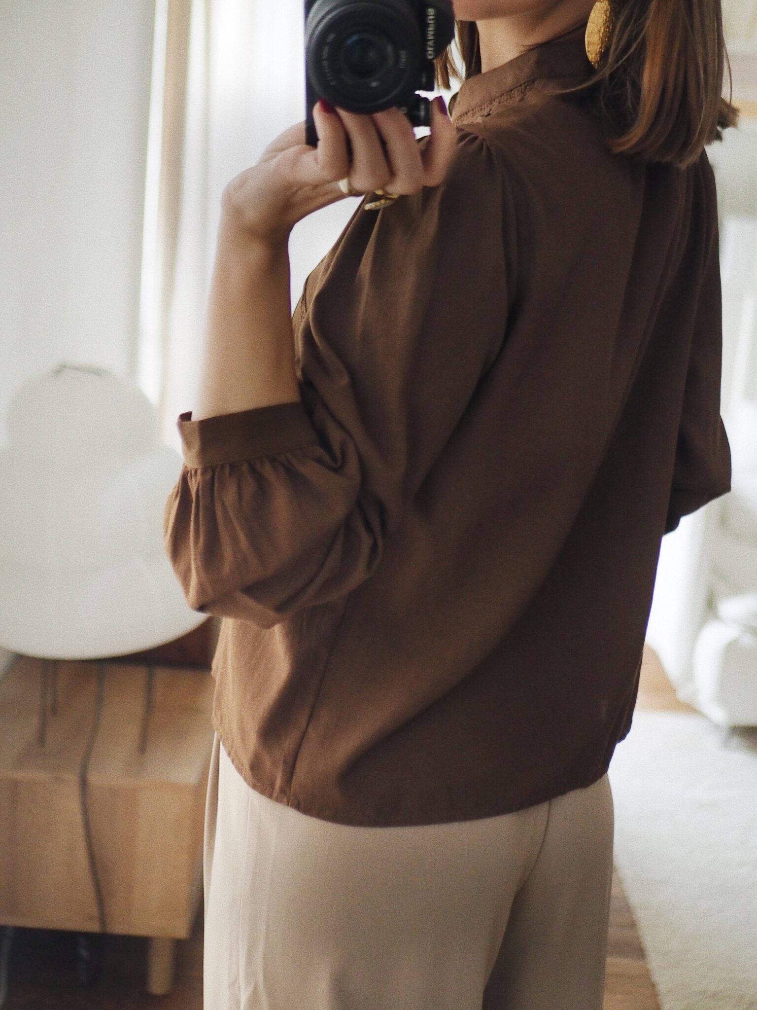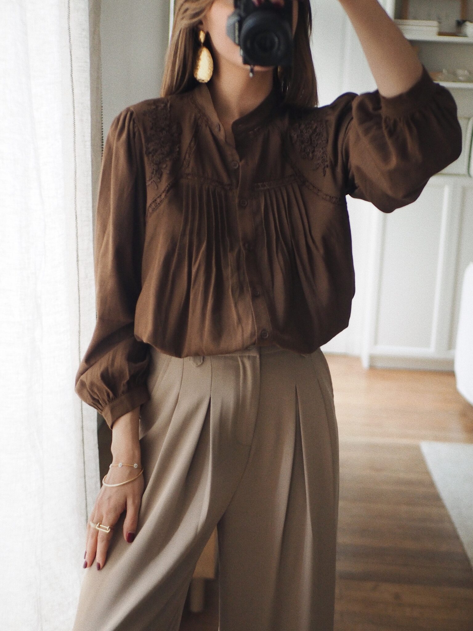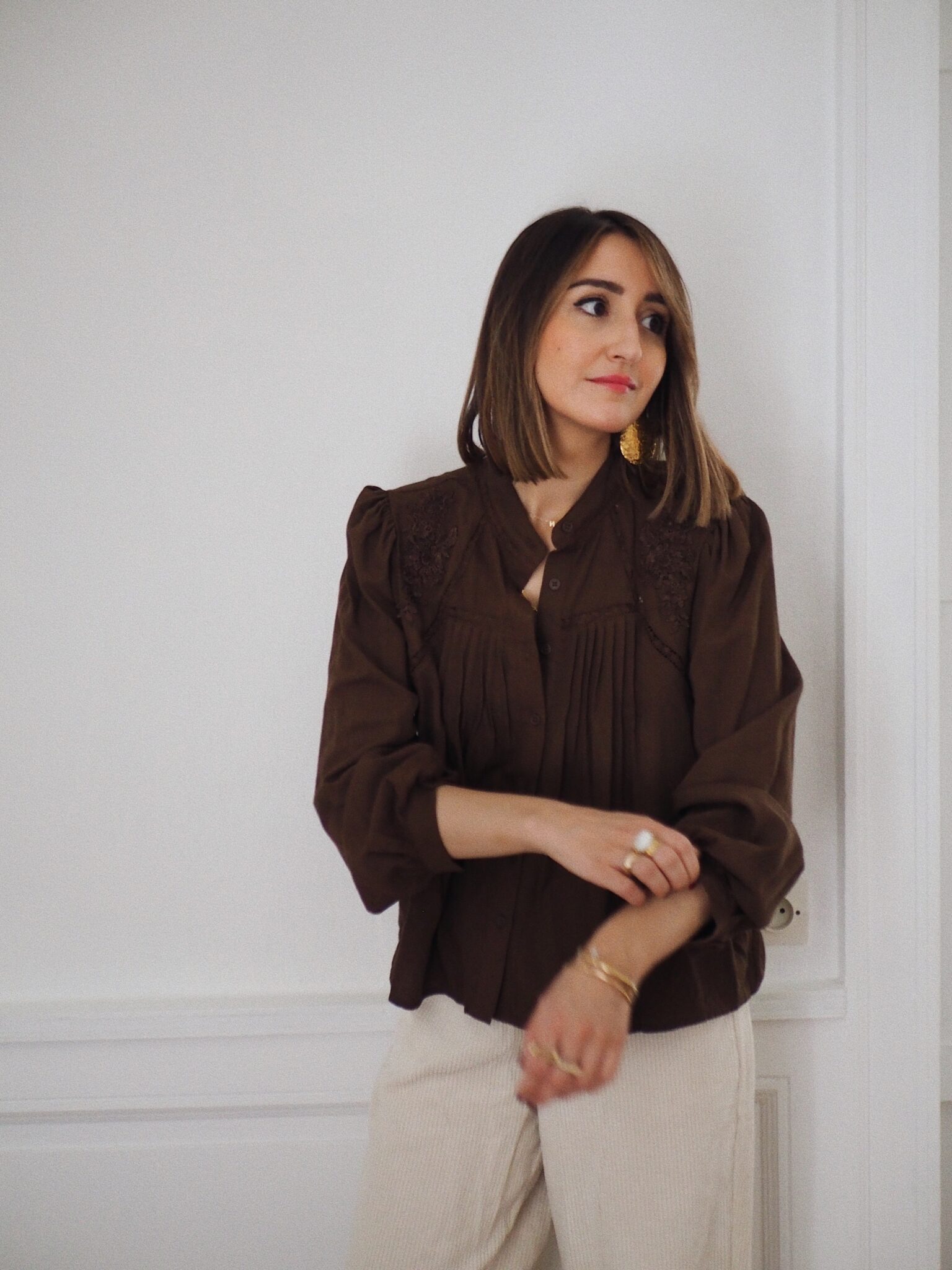 – Blouse fluide en coton mélangé douce et délicate – Coloris marron – Coupe droite légèrement ample avec pinces et plis sur le devant pour plus de structure et de fluidité – Encolure ronde avec empiècements brodés sur le haut des épaules ajoutant du relief – Fermeture boutonnée ton sur ton sur toute la longueur – Manches longues légèrement bouffantes et poignets boutonnés – Existe aussi en coloris blanc et coloris prune