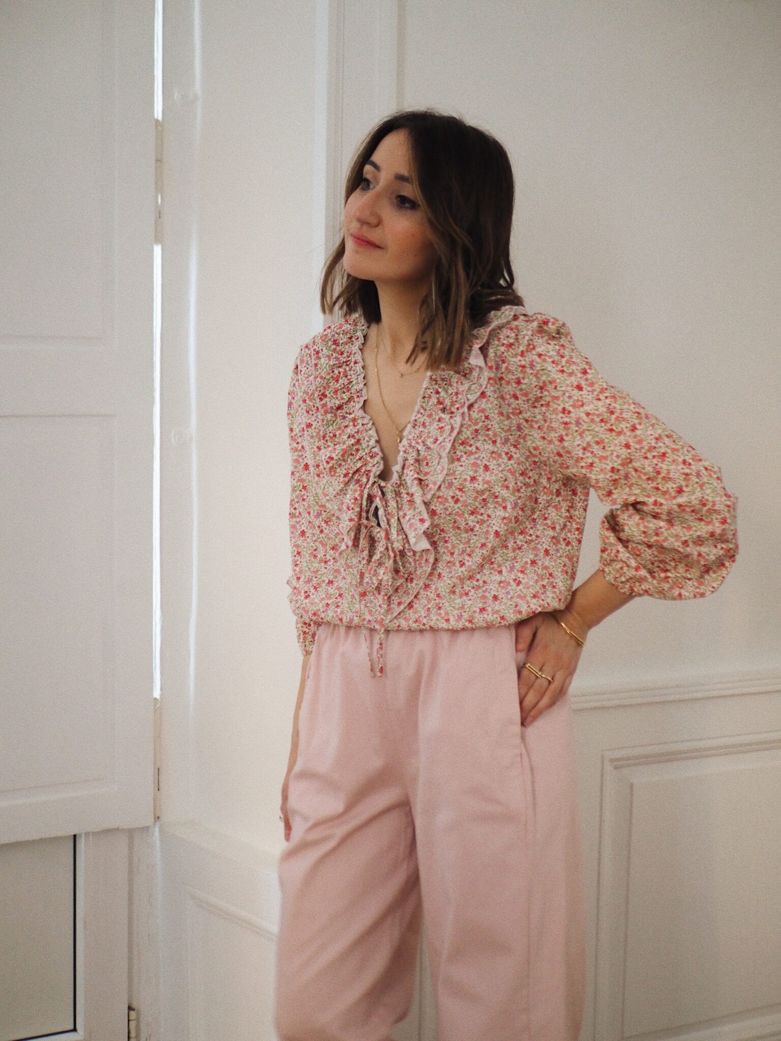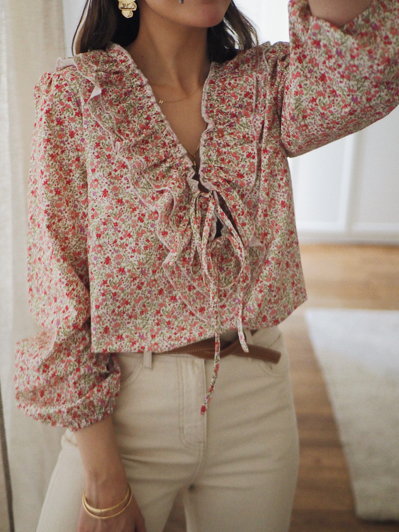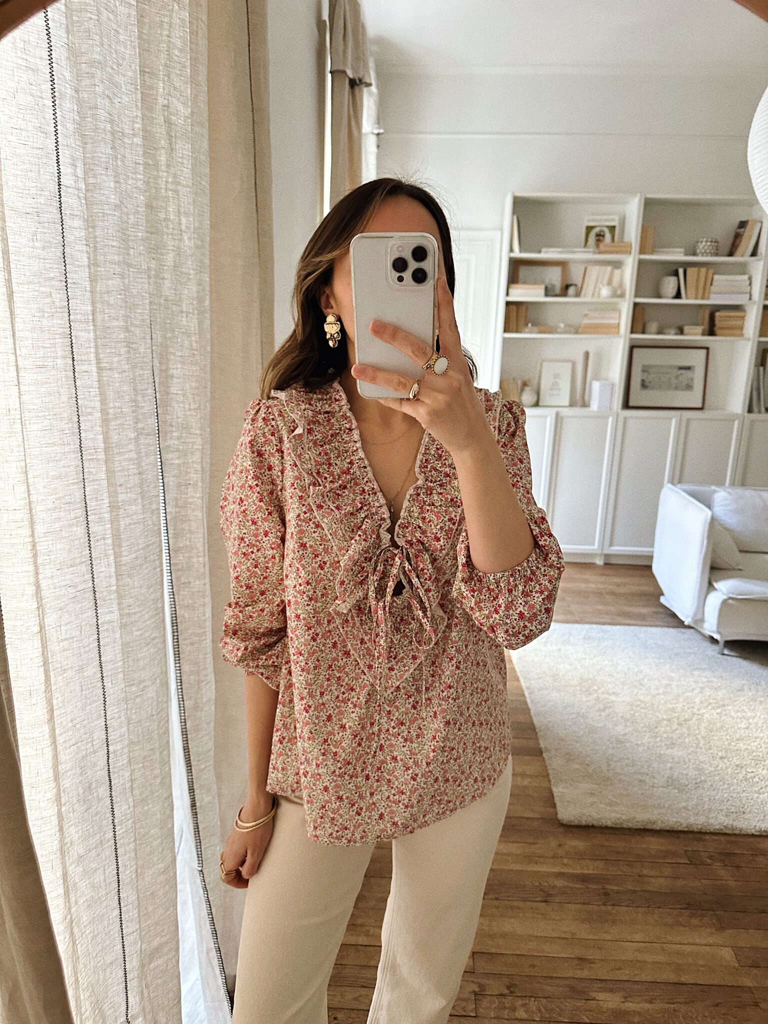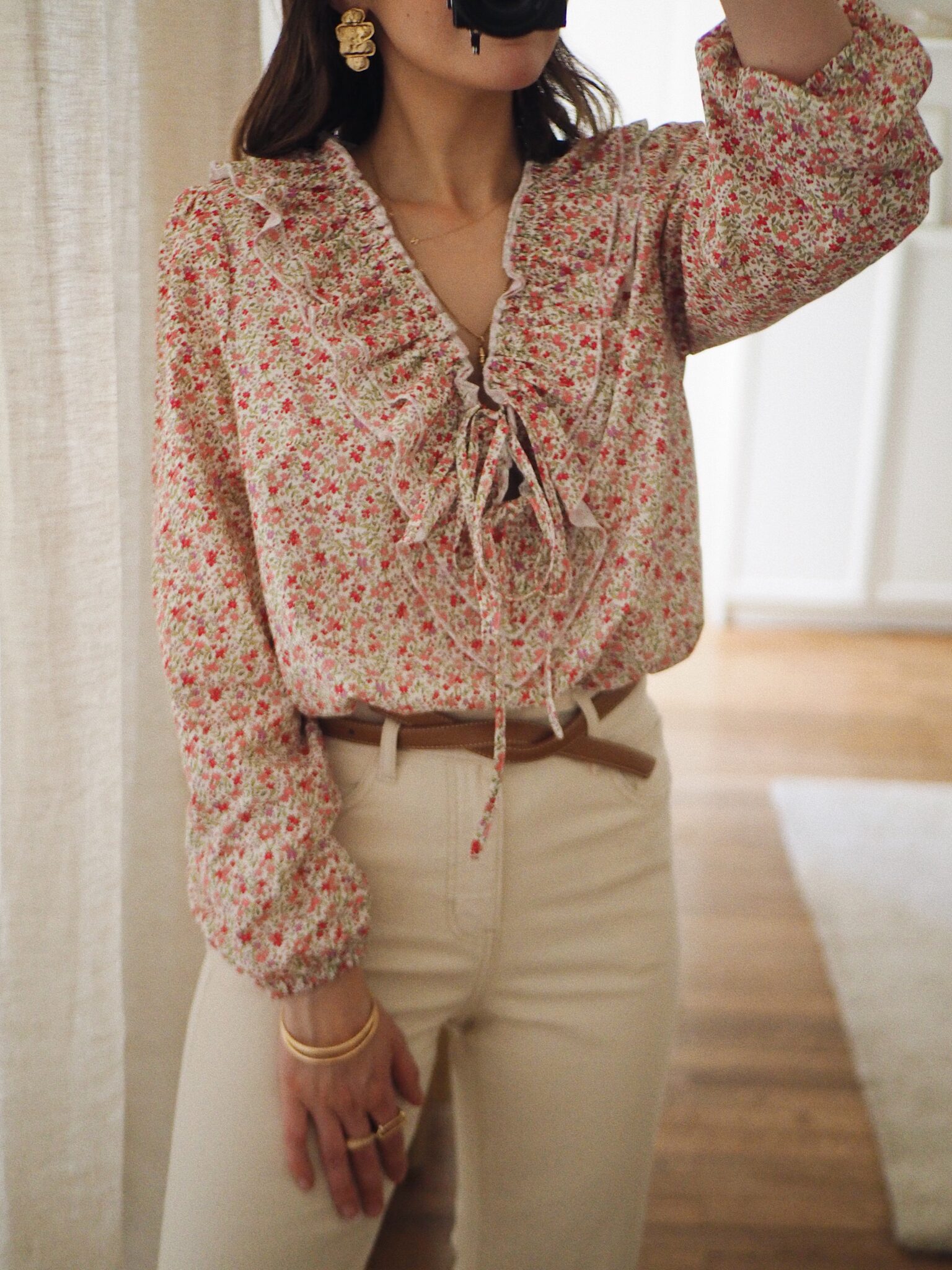 – Blouse en coton léger, au toucher doux et naturel – Imprimé fleuri aux nuances rosées et écrues – Encolure en V ornée de volants structurés créant un relief élégant – Boutonnage discret avec lien à nouer – Coupe droite légèrement ample pour un tombé fluide – Manches longues aux poignets resserrés – Une poésie textile au charme doux