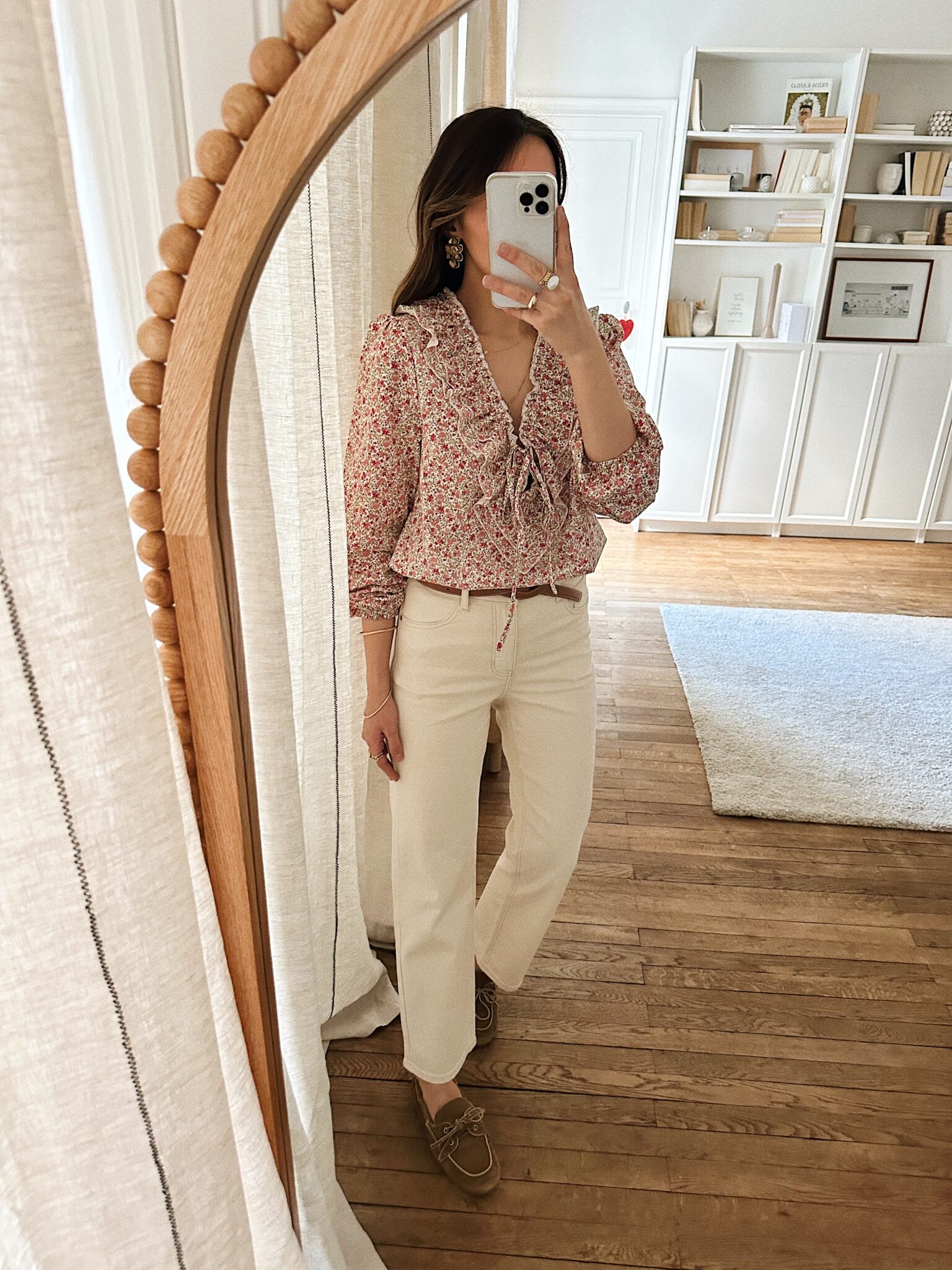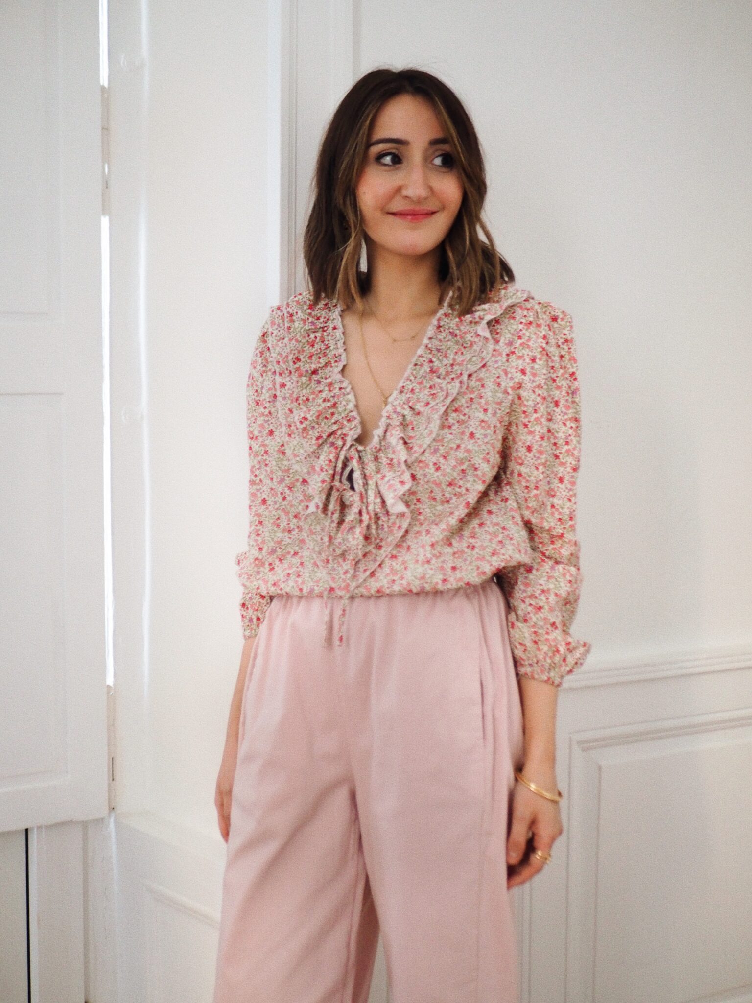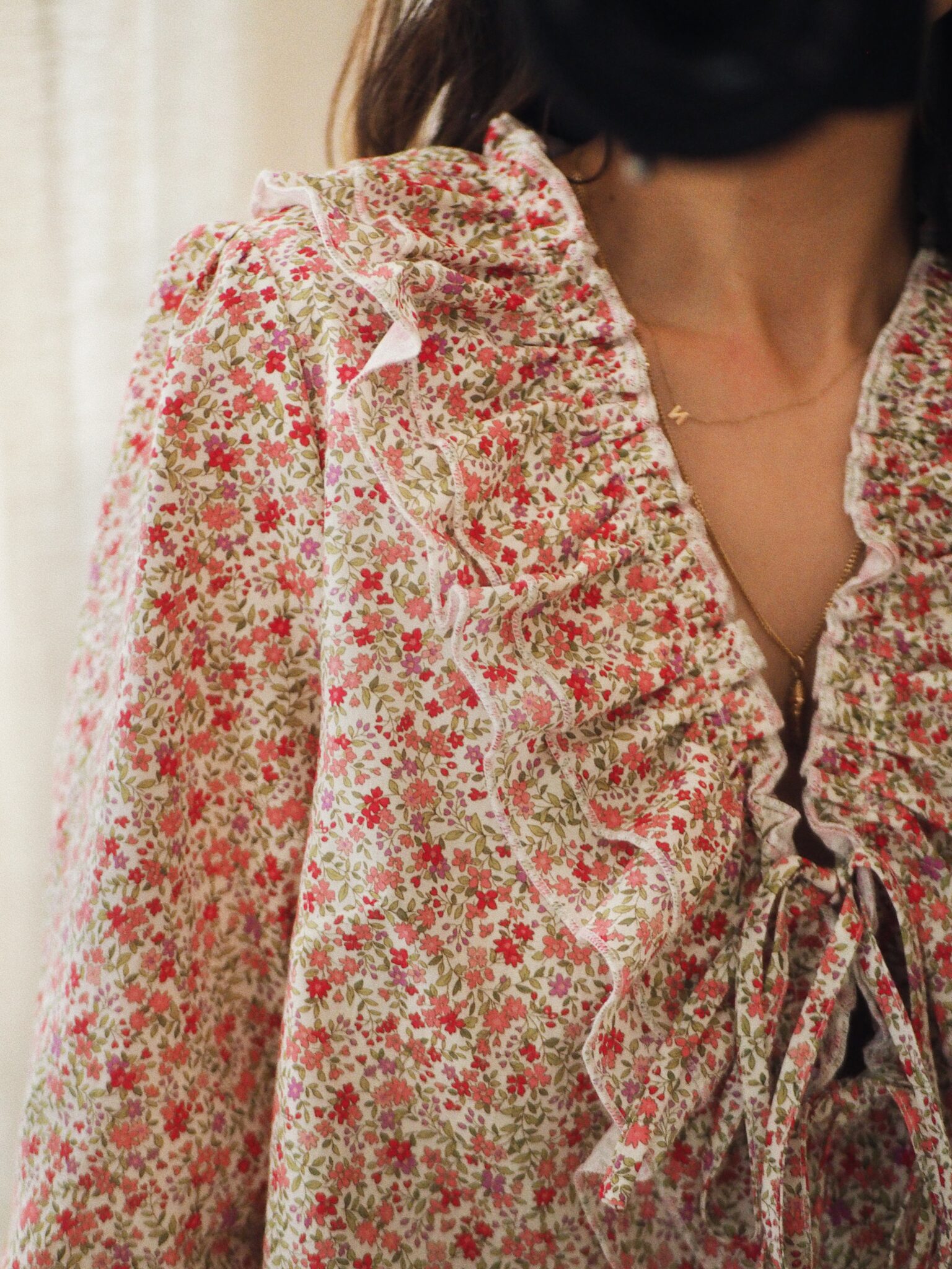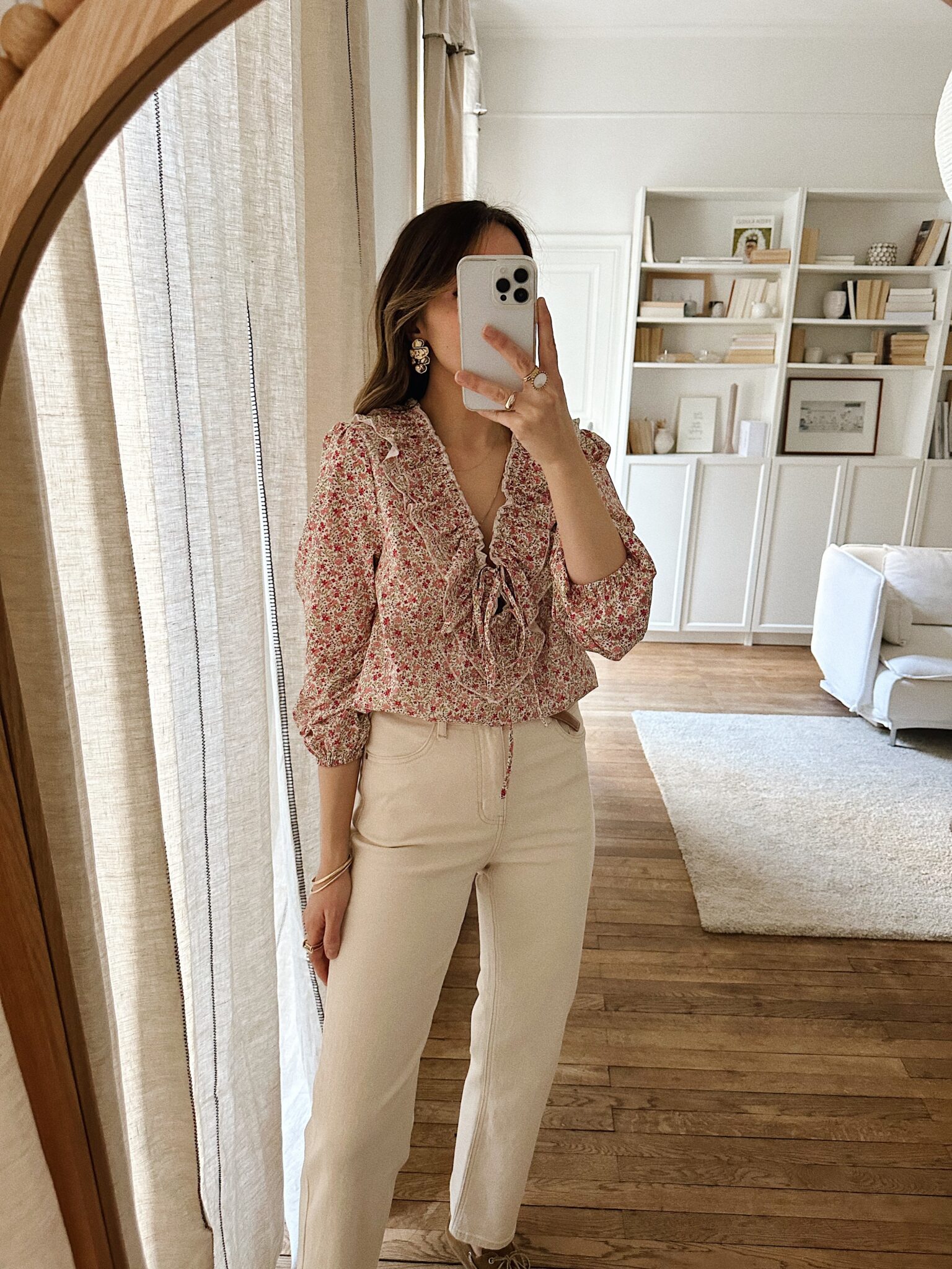 – Blouse en coton léger, au toucher doux et naturel – Imprimé fleuri aux nuances rosées et écrues – Encolure en V ornée de volants structurés créant un relief élégant – Boutonnage discret avec lien à nouer – Coupe droite légèrement ample pour un tombé fluide – Manches longues aux poignets resserrés – Une poésie textile au charme doux