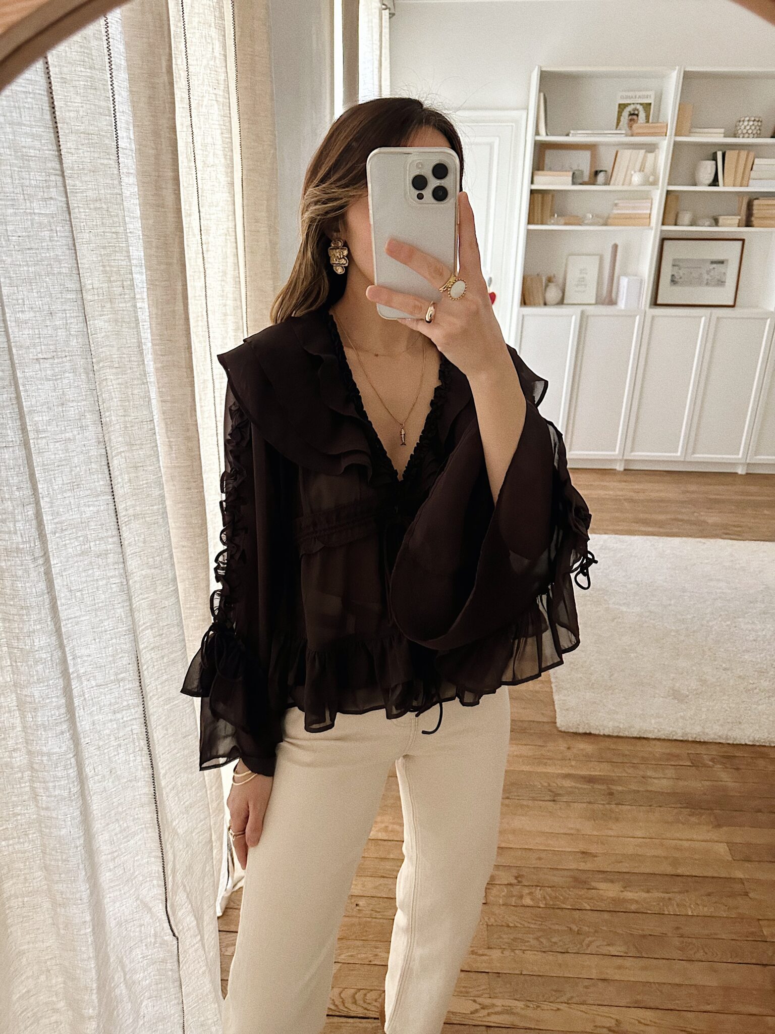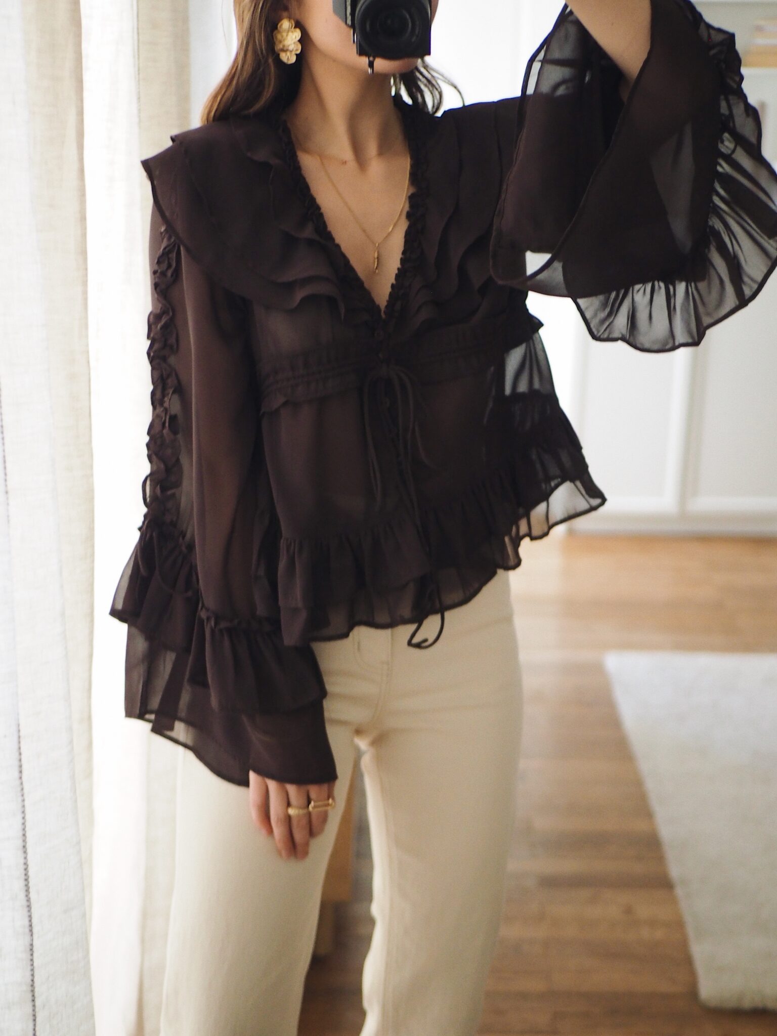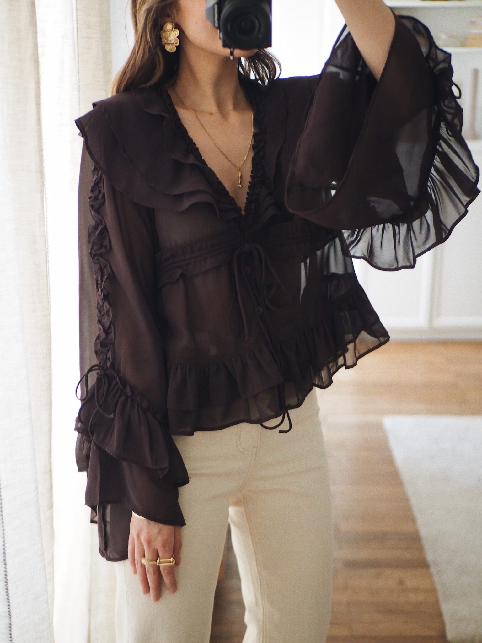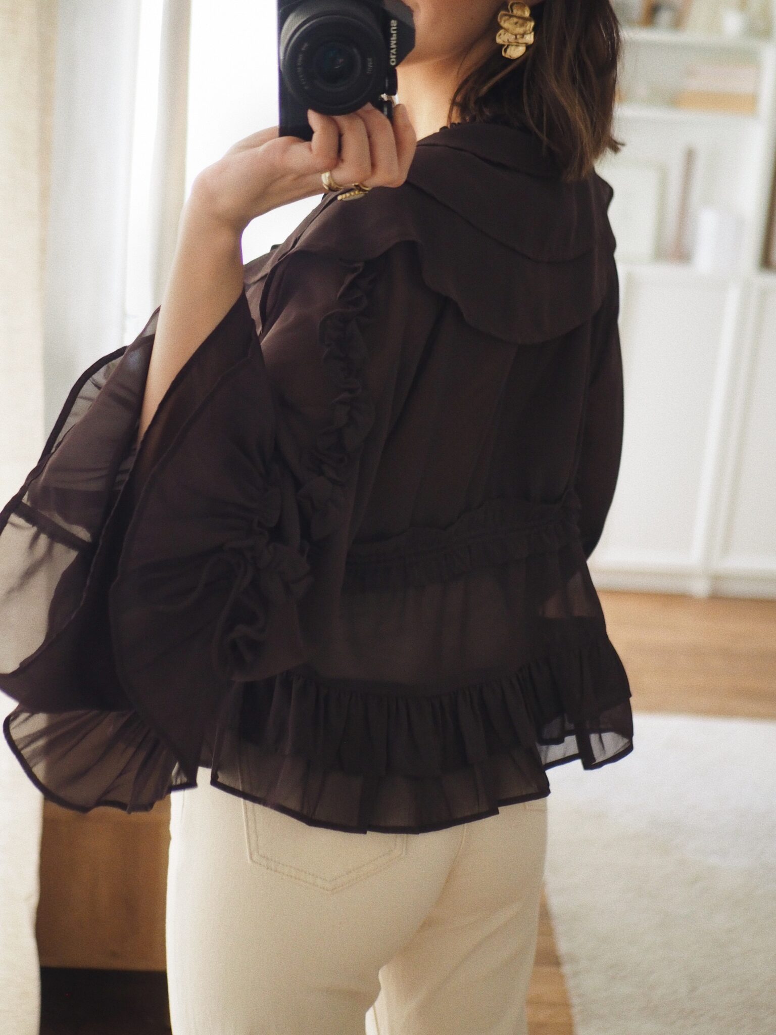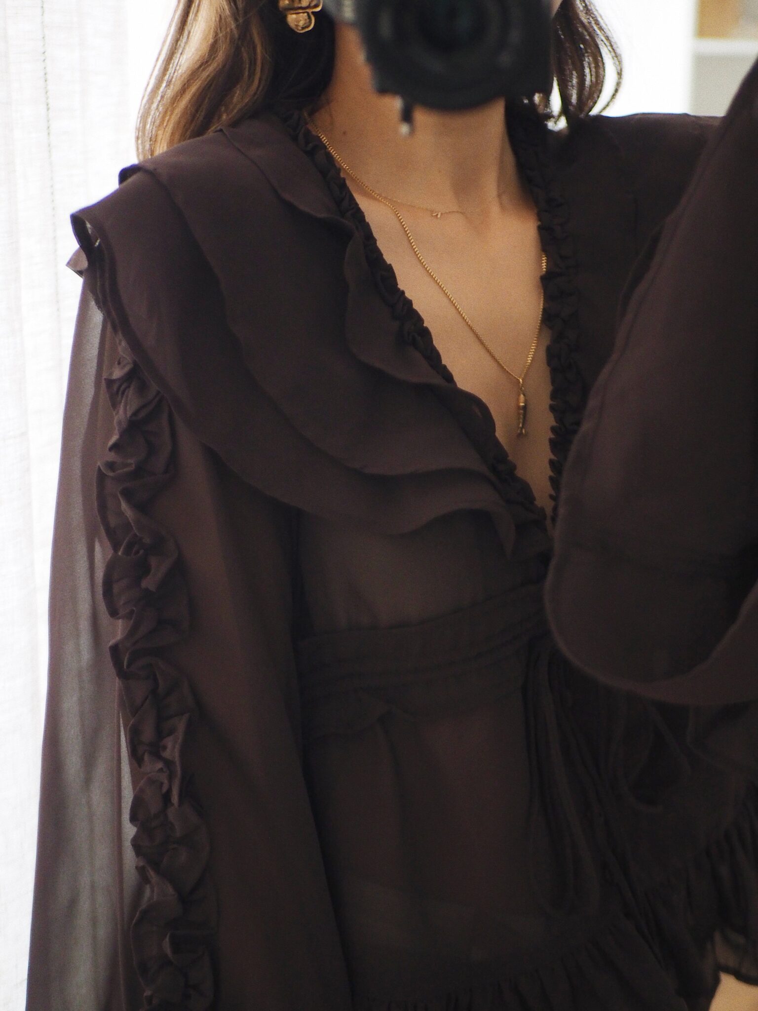 – Blouse fluide en voile léger, au tombé aérien – Coloris brun profond – Grand col en V volanté en cascade – Coulisse centrale réglable permettant de moduler le volume et créer un drapé élégant – Coupe courte légèrement évasée – Jeu de fronces et de volants pour un relief subtil – Manches longues au tombé vaporeux,  finitions volantées – L’art du détail dans toute sa délicatesse