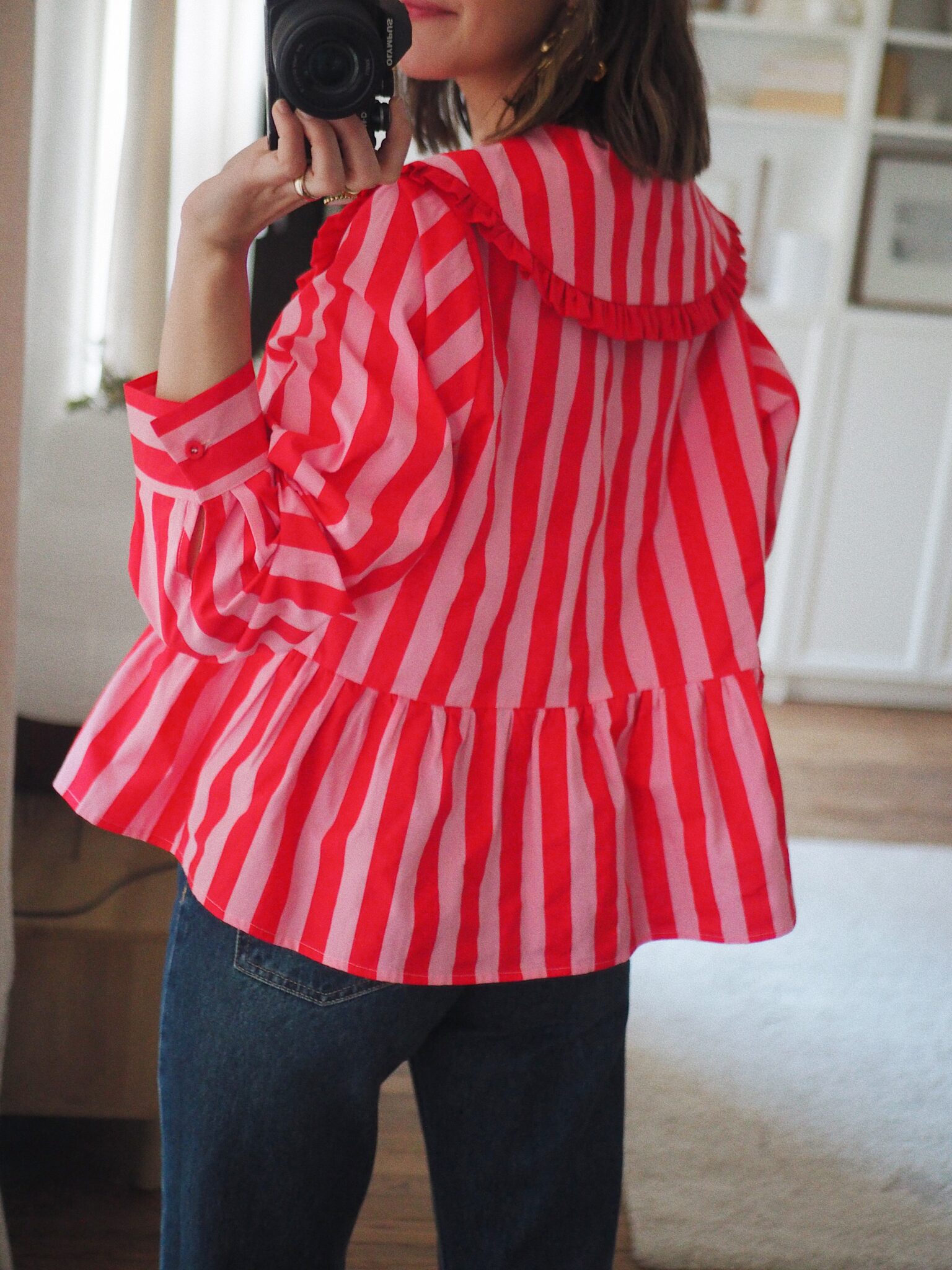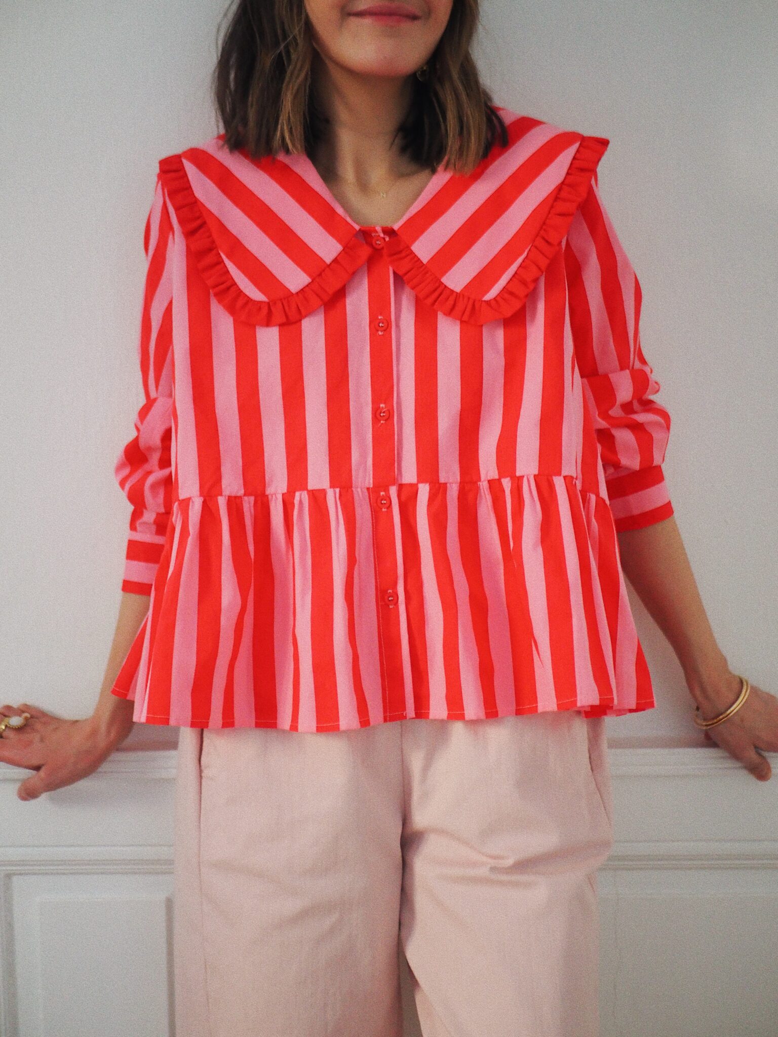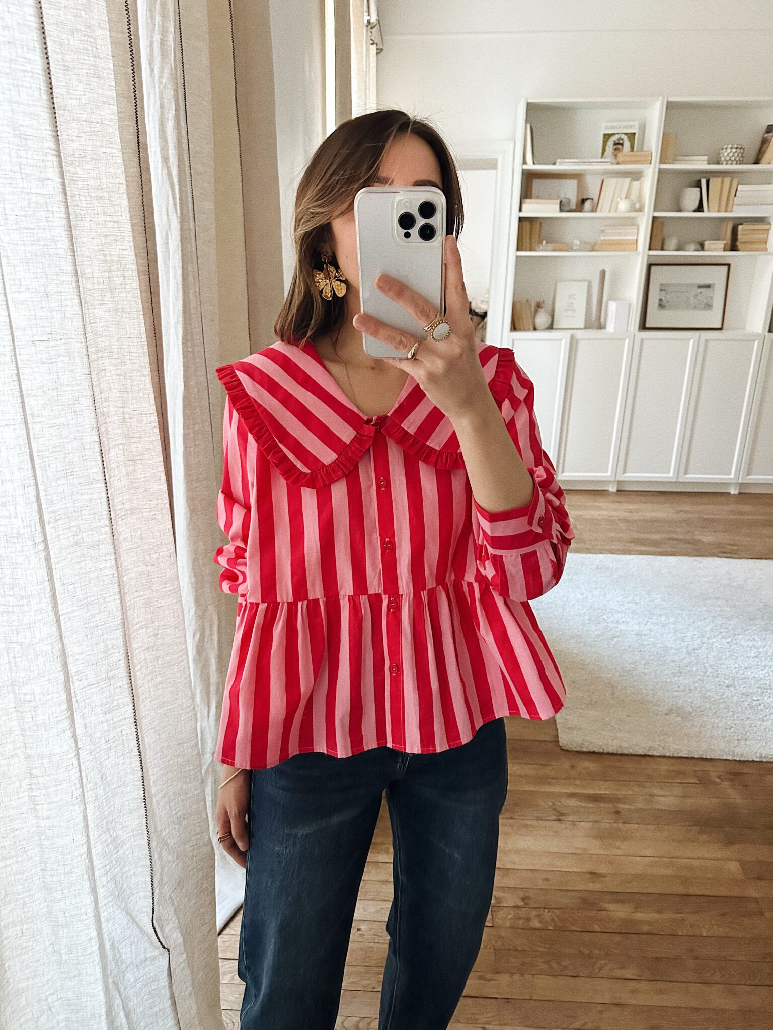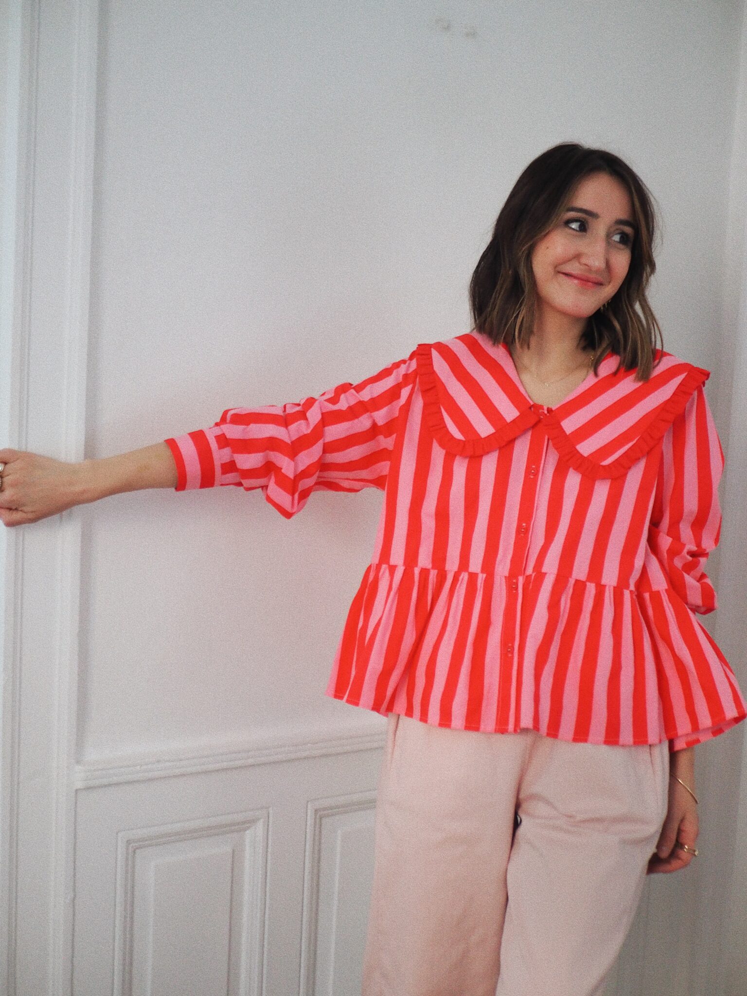 – Blouse à rayures verticales au rendu graphique – Coloris rose et cerise – Grand col Claudine à volants, structurant et délicatement rétro – Boutonnage discret sur le devant – Coupe légèrement évasée – Empiècement sous poitrine avec fronces – Manches longues avec poignets boutonnés – Une signature graphique dans une version lumineuse
