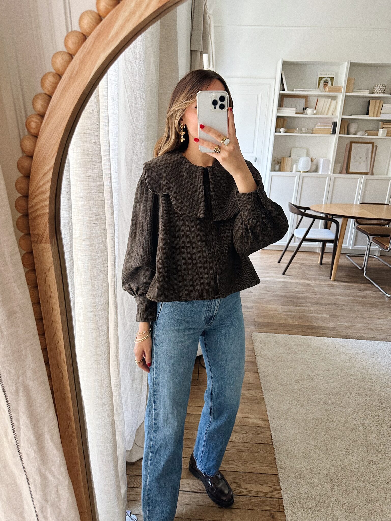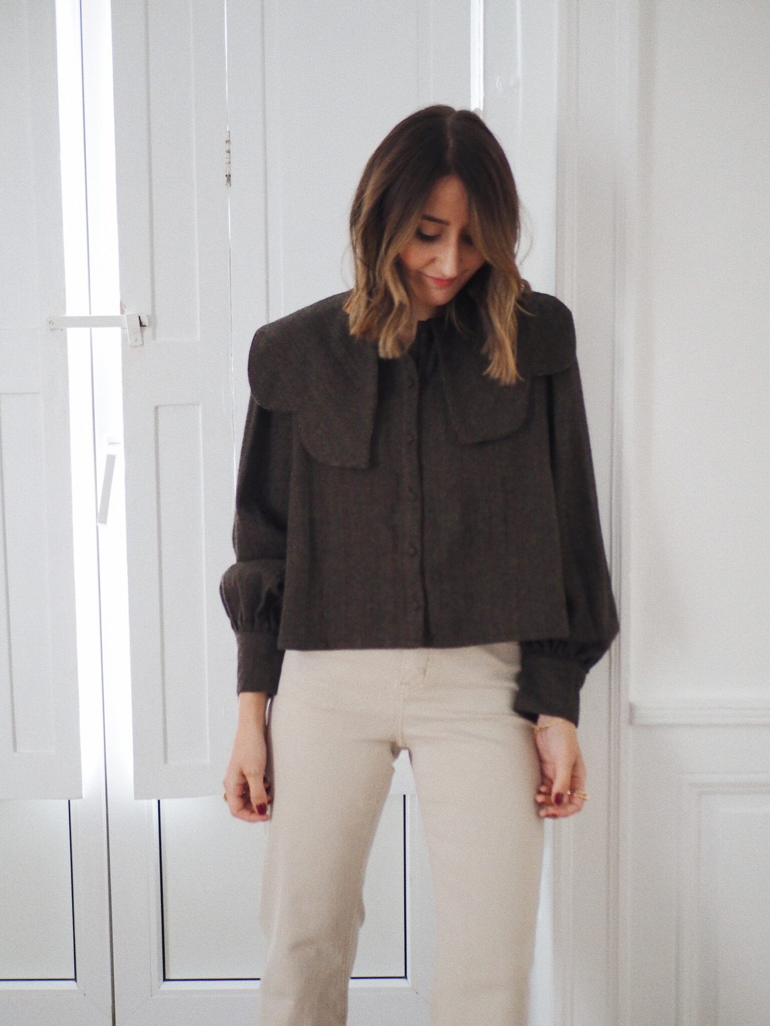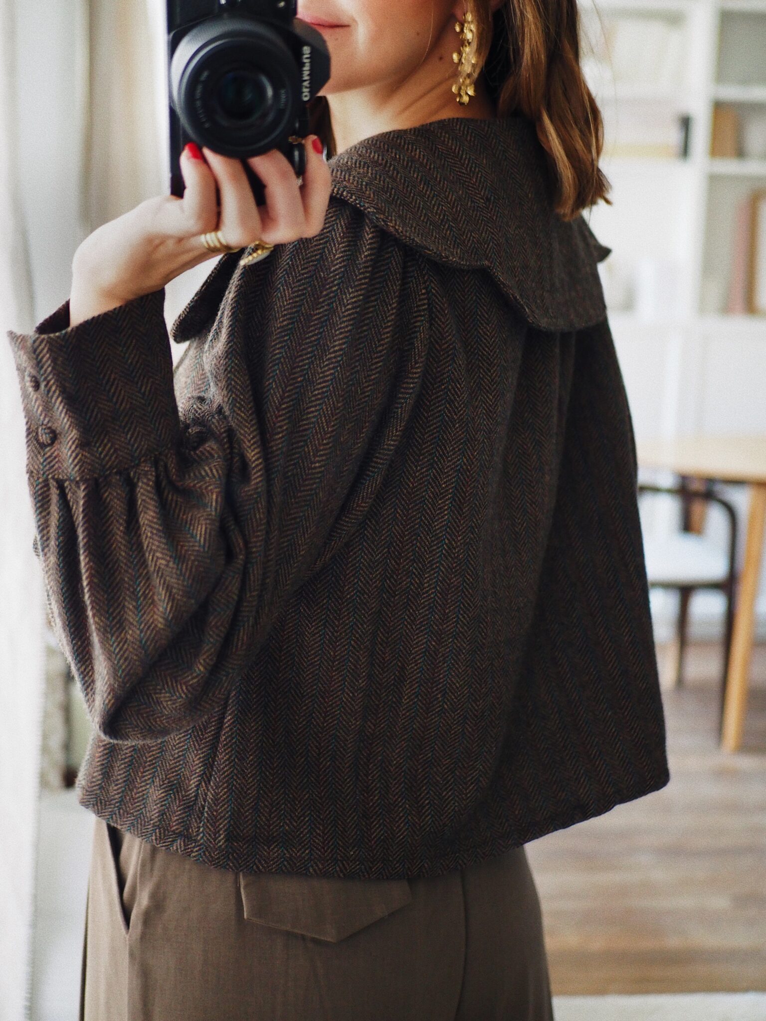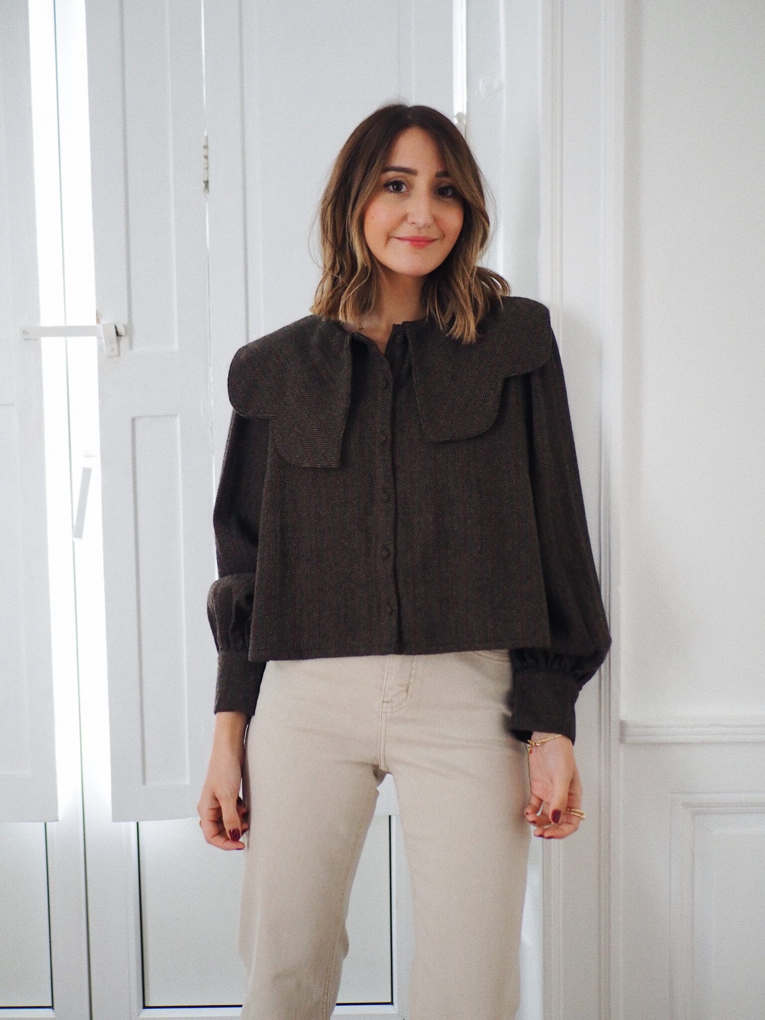 – Blouse courte en tissu chevron – Coloris marron profond avec nuance de bleu et grenat – Coupe droite, structurée – Col claudine oversize avec pans arrondis – Fermeture avec boutons recouverts sur le devant – Manches longues légèrement bouffantes avec poignets à double boutonnage – Sa coupe moderne et son tissu chevron en laine mélangée lui confère charme et authenticité