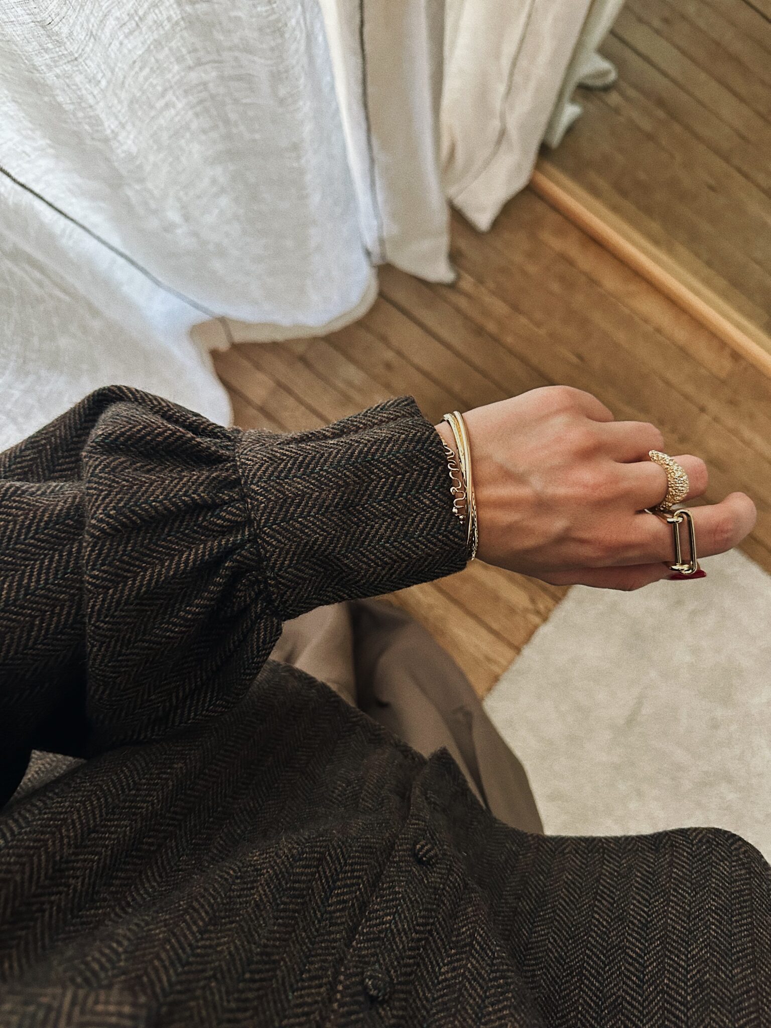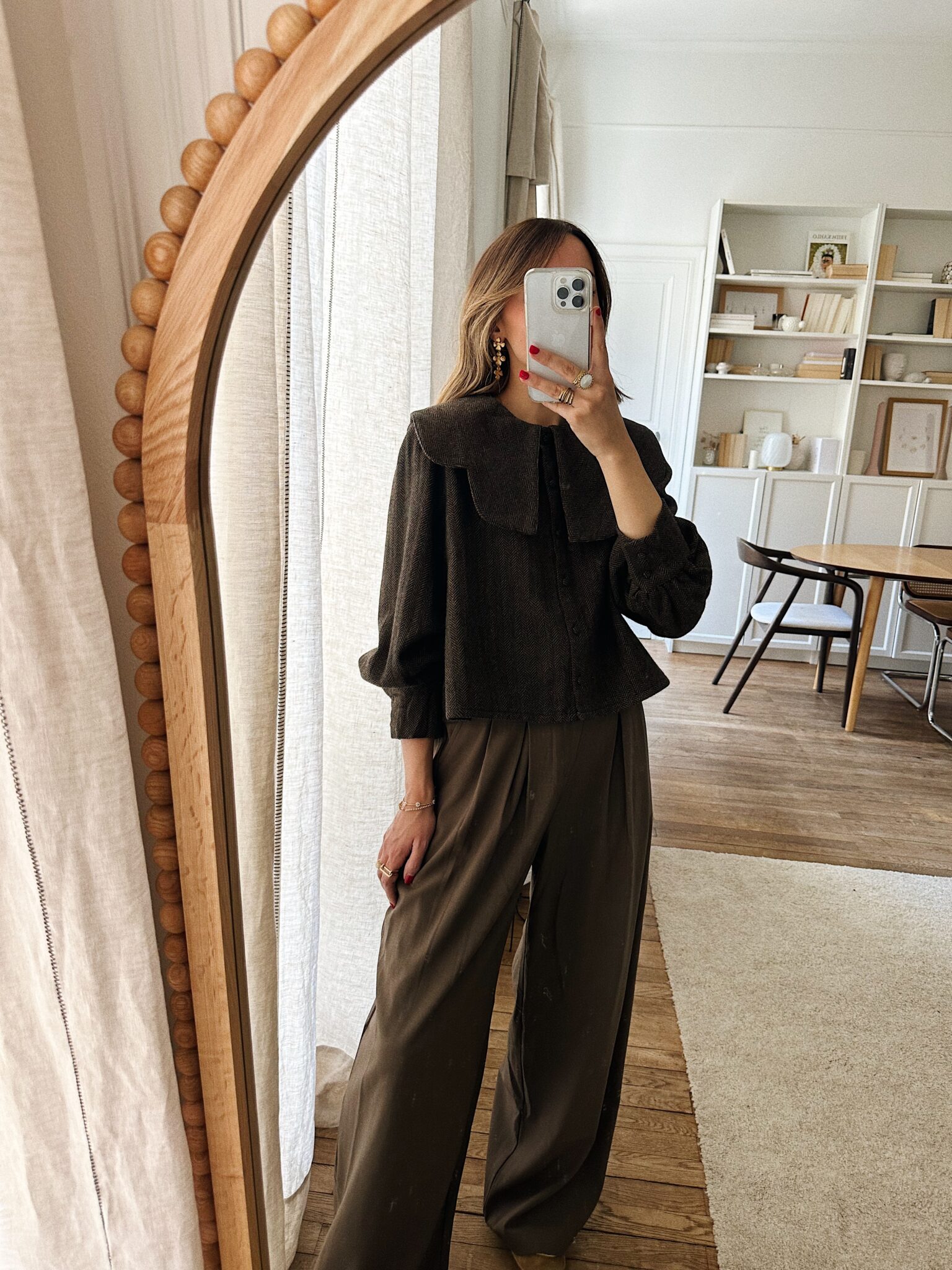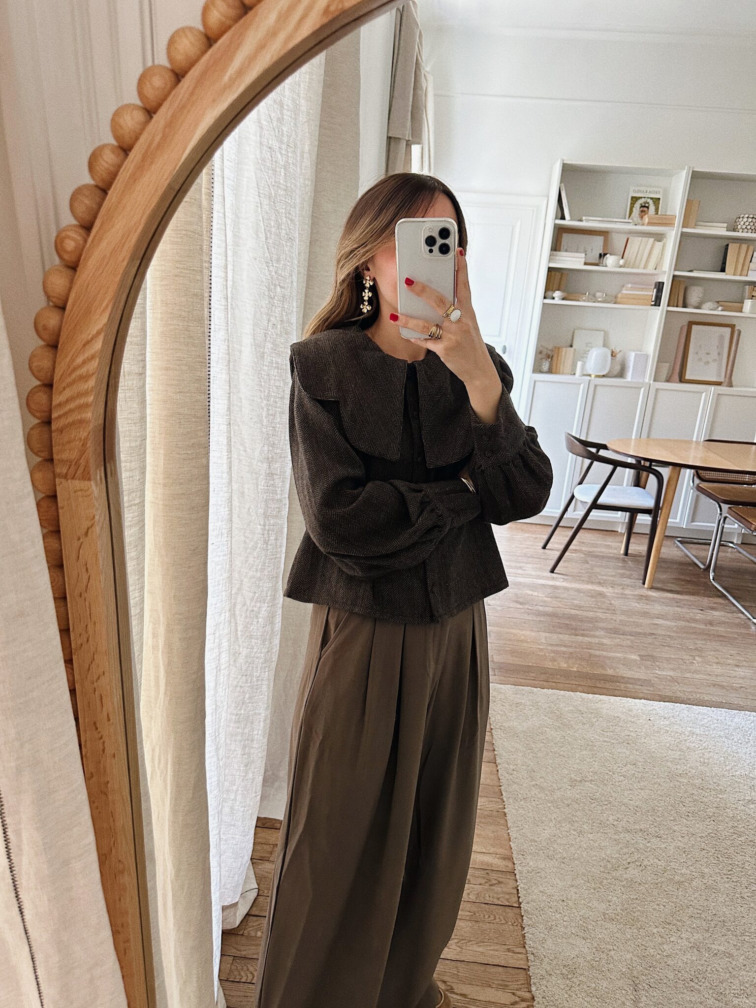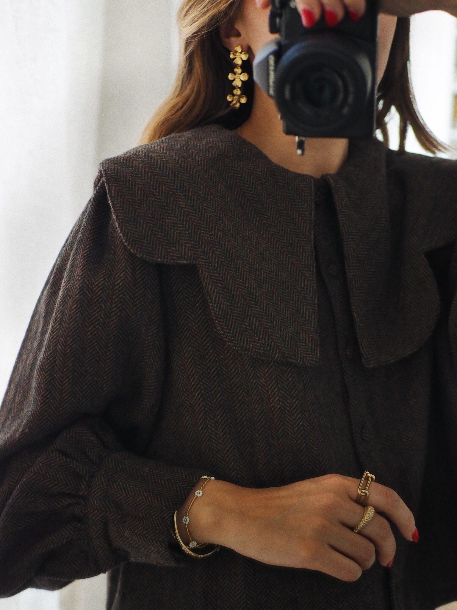 – Blouse courte en tissu chevron – Coloris marron profond avec nuance de bleu et grenat – Coupe droite, structurée – Col claudine oversize avec pans arrondis – Fermeture avec boutons recouverts sur le devant – Manches longues légèrement bouffantes avec poignets à double boutonnage – Sa coupe moderne et son tissu chevron en laine mélangée lui confère charme et authenticité