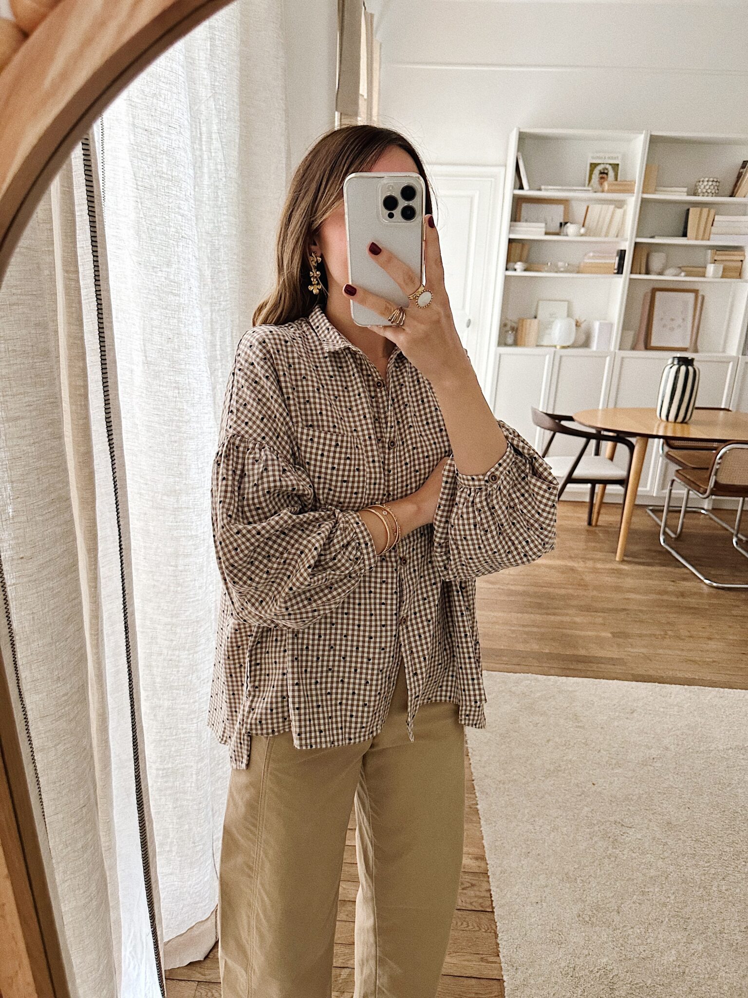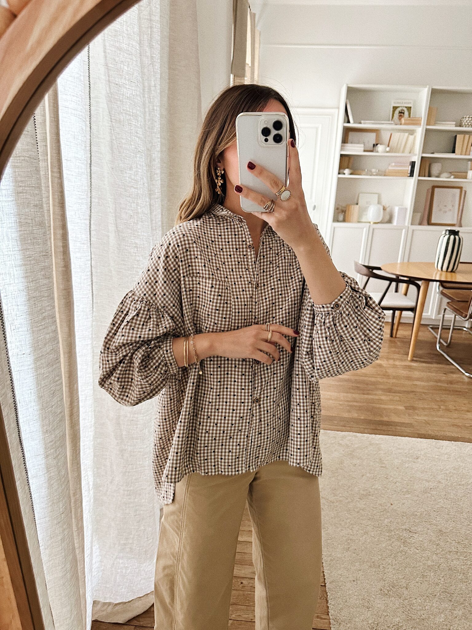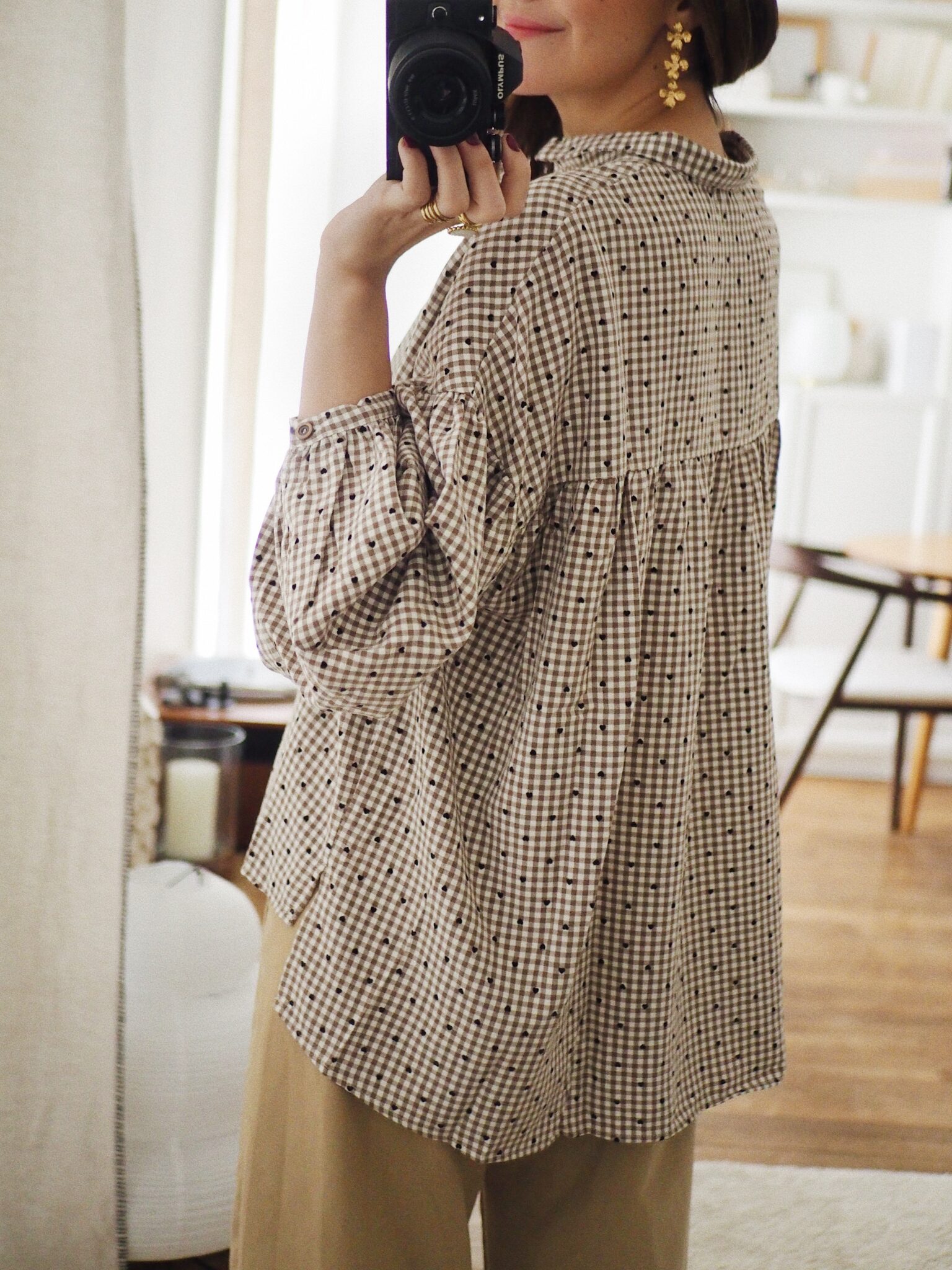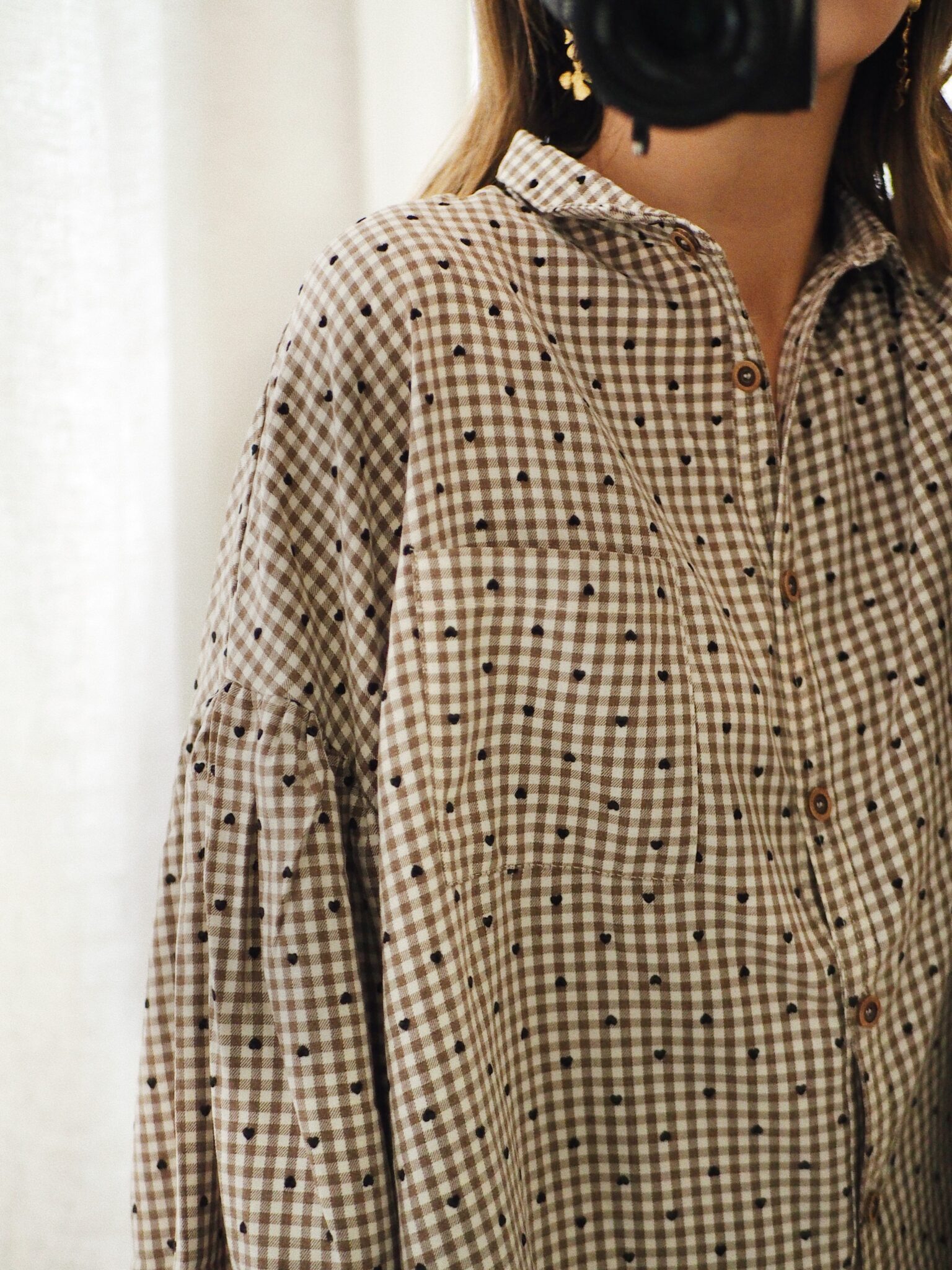 – Chemise à carreaux discrets beige et écru parsemée de petits cœurs  noirs – Coupe ample et fluide – Petit col chemise classique – Fermeture boutonnée sur le devant – Manches longues bouffantes – Emmanchures basses – Base arrondie plus longue à l’arrière – L’équilibre subtil entre décontraction et caractère