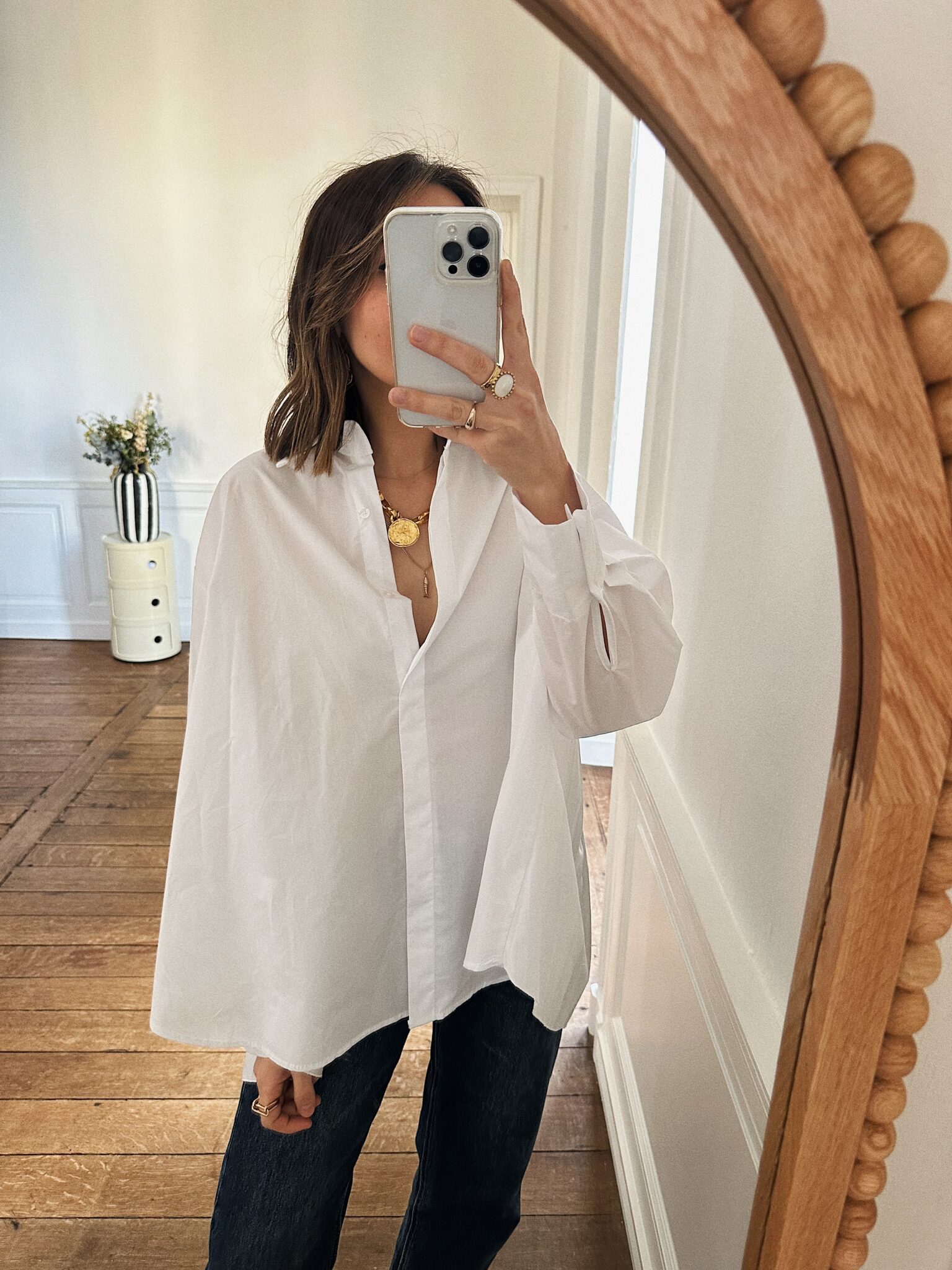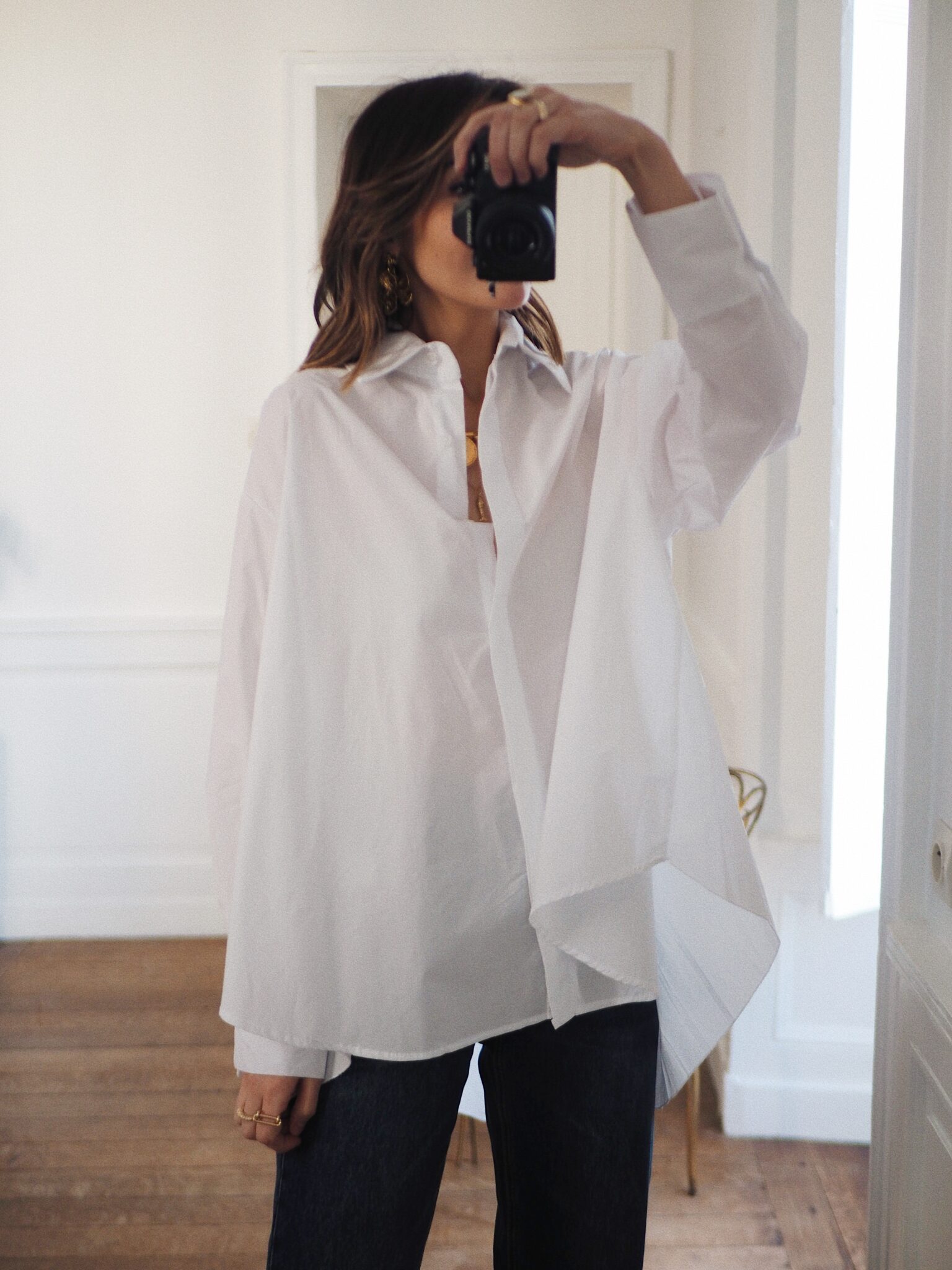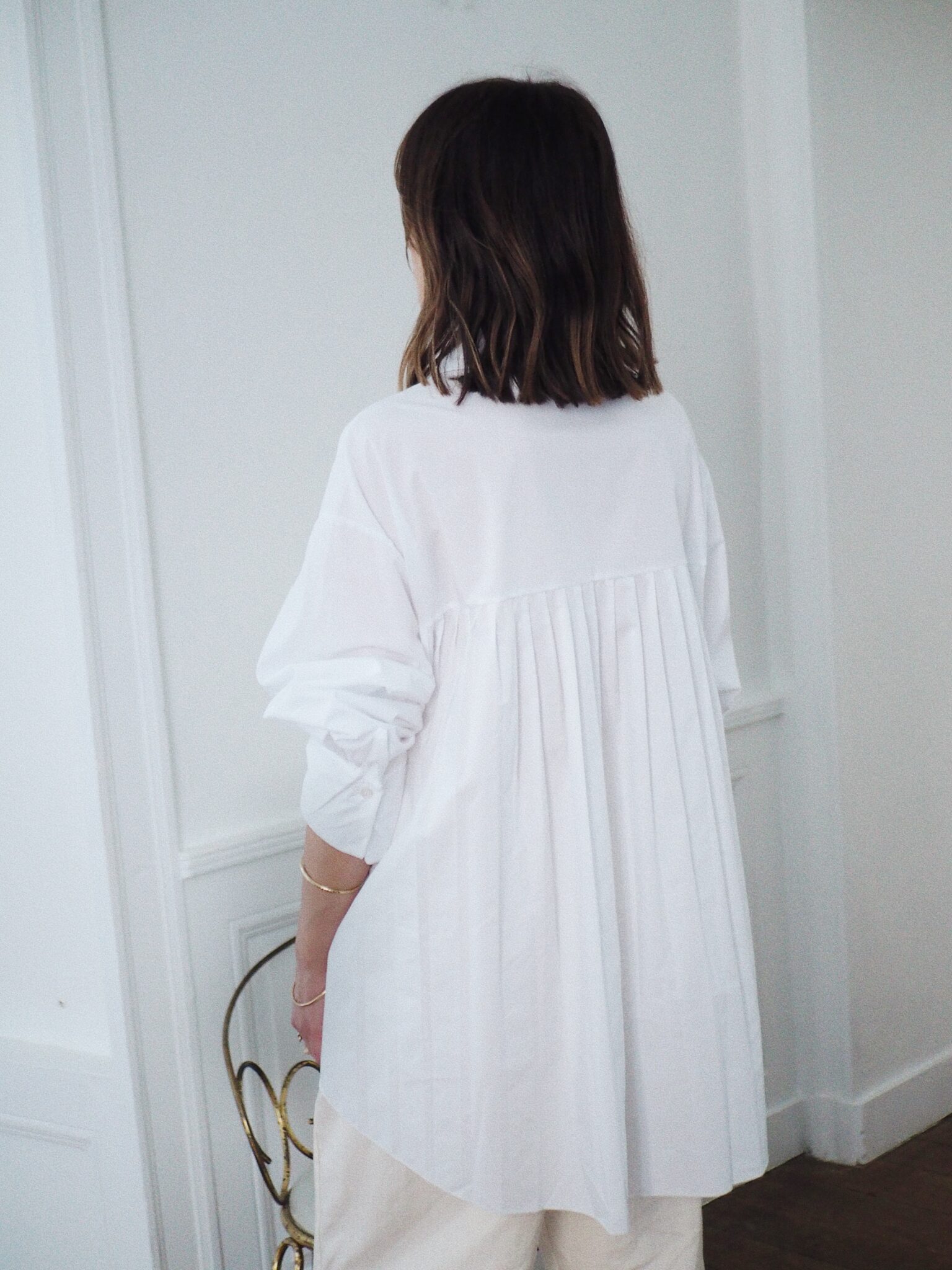 – Chemise unie à l’allure contemporaine – Coloris blanc pur et chic – Coupe  ample et jeu de plis au dos – Col chemise classique à la ligne nette – Base arrondie, plus longue au dos – Fermeture invisible sous patte créant une allure épurée – Manches longues finitions larges poignets boutonnés – Une pièce où chaque détail exprime l’élégance et la féminité – Egalement disponible en bleu – Confectionnée en Italie