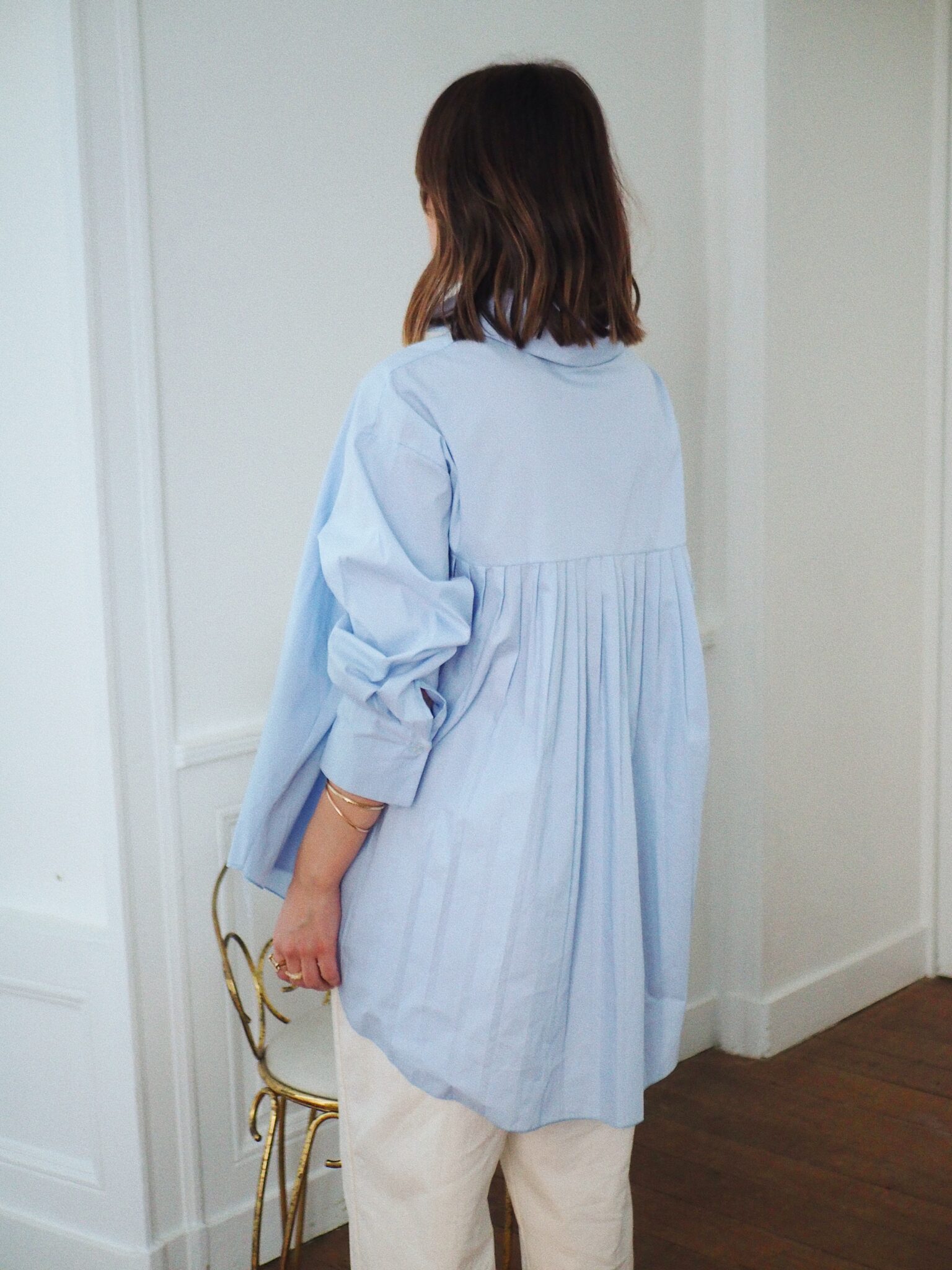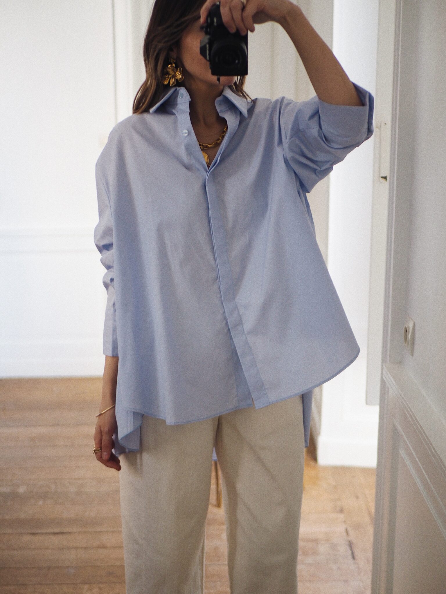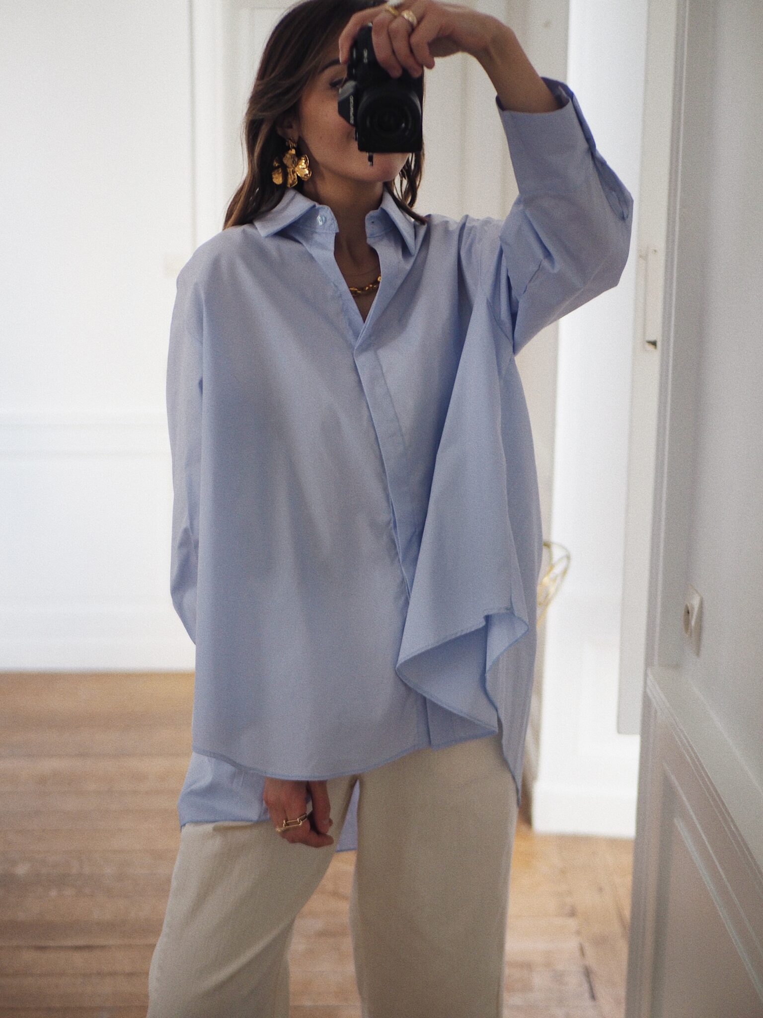 – Chemise unie à l’allure contemporaine – Coloris bleu – Coupe ample et jeu de plis au dos – Col chemise classique à la ligne nette – Base arrondie, plus longue au dos – Fermeture invisible sous patte créant une allure épurée – Manches longues finitions larges poignets boutonnés – Une pièce où chaque détail exprime l’élégance et la féminité – Egalement disponible en blanc – Confectionnée en Italie