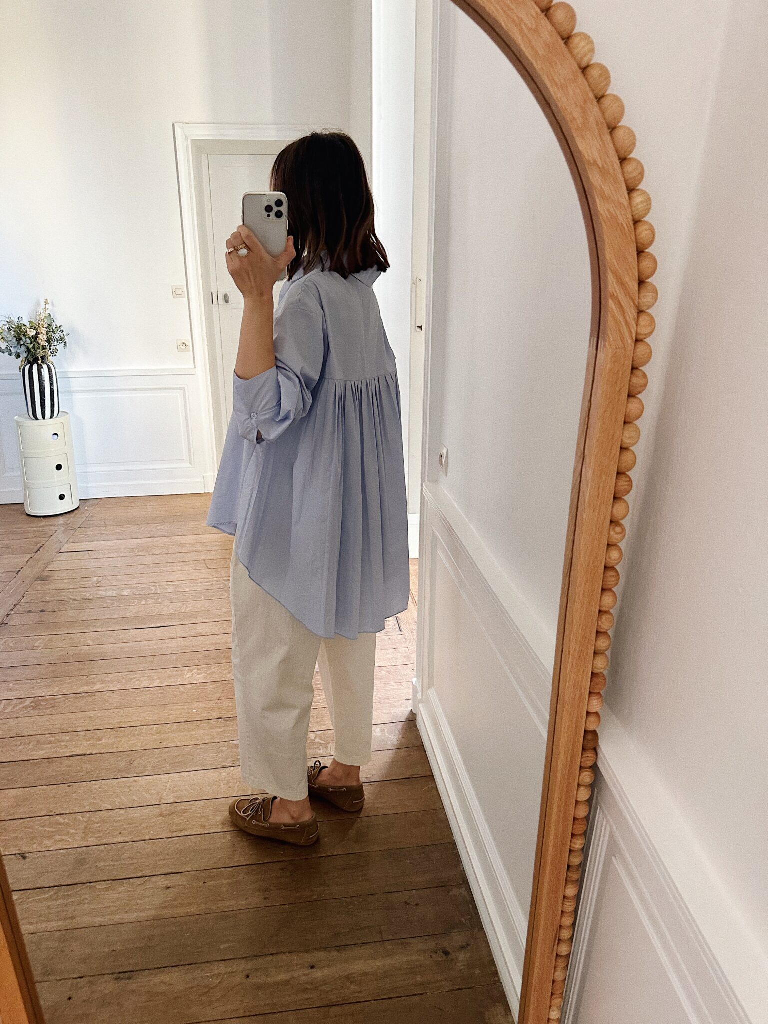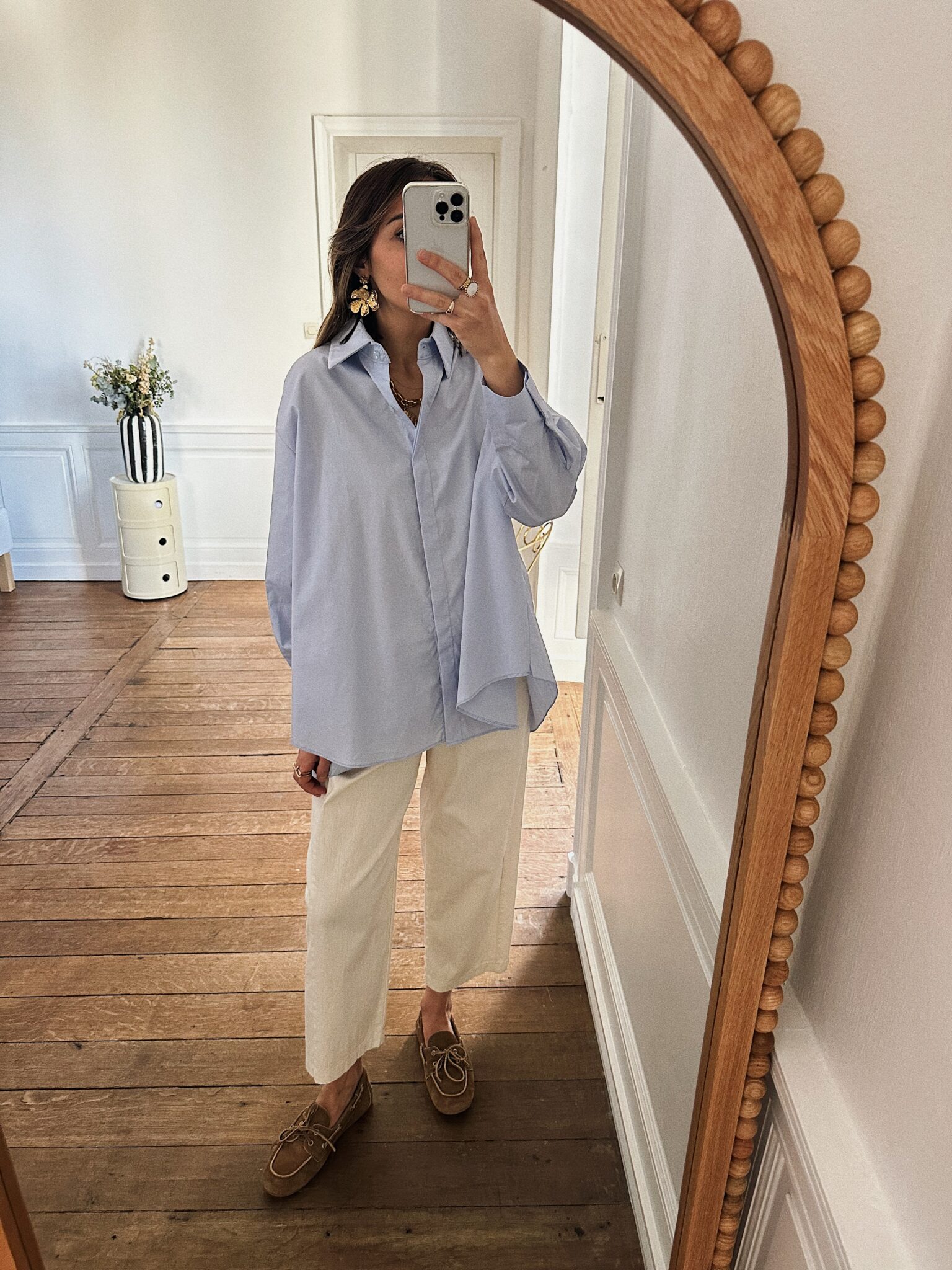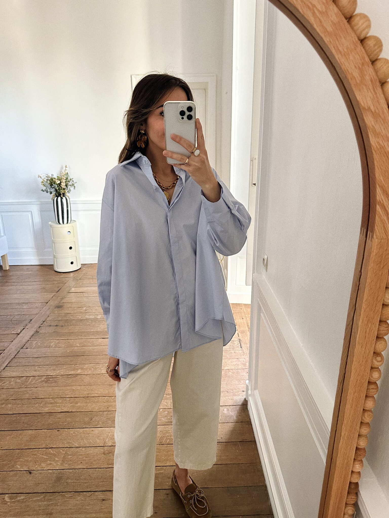 – Chemise unie à l’allure contemporaine – Coloris bleu – Coupe ample et jeu de plis au dos – Col chemise classique à la ligne nette – Base arrondie, plus longue au dos – Fermeture invisible sous patte créant une allure épurée – Manches longues finitions larges poignets boutonnés – Une pièce où chaque détail exprime l’élégance et la féminité – Egalement disponible en blanc – Confectionnée en Italie