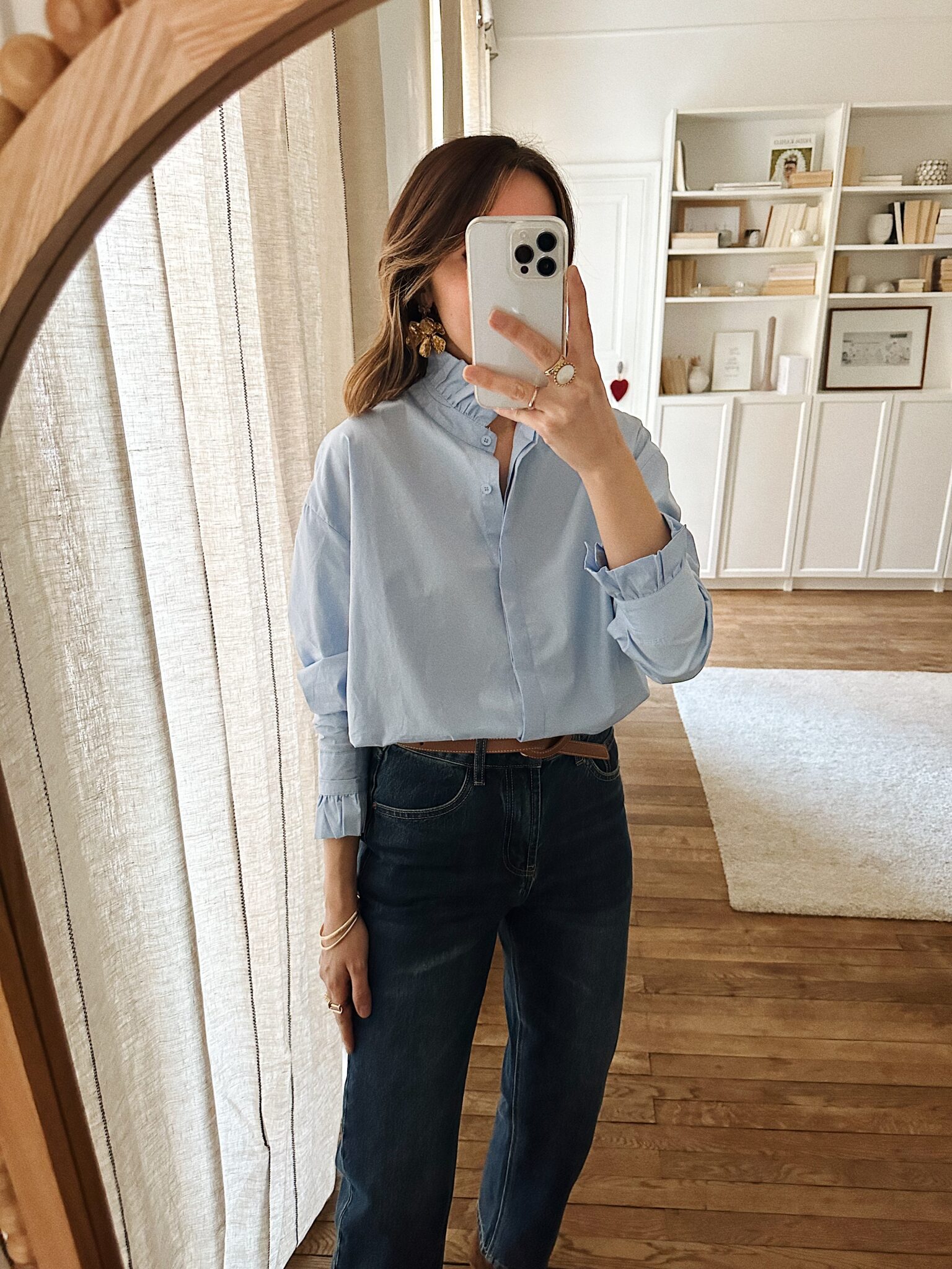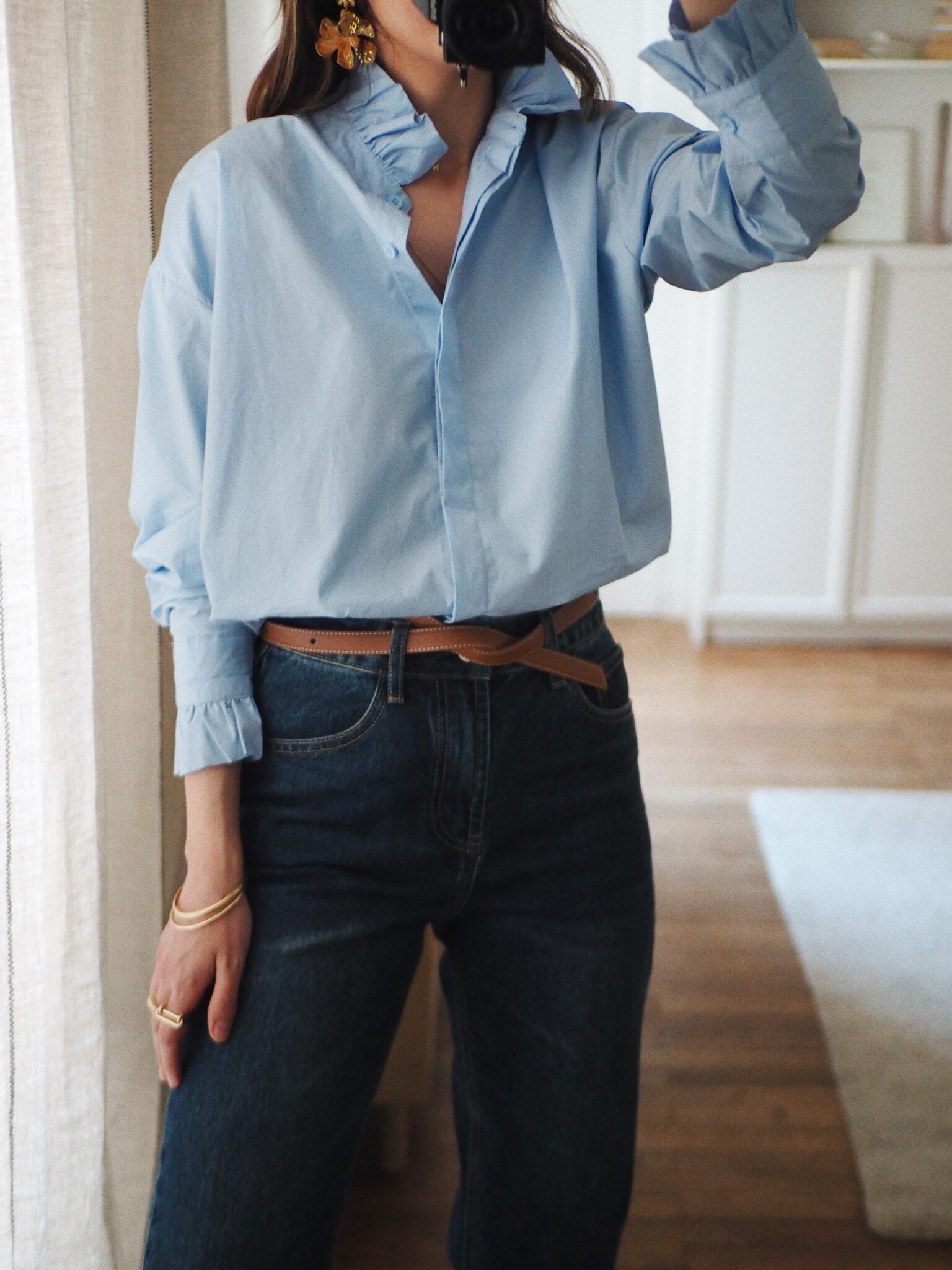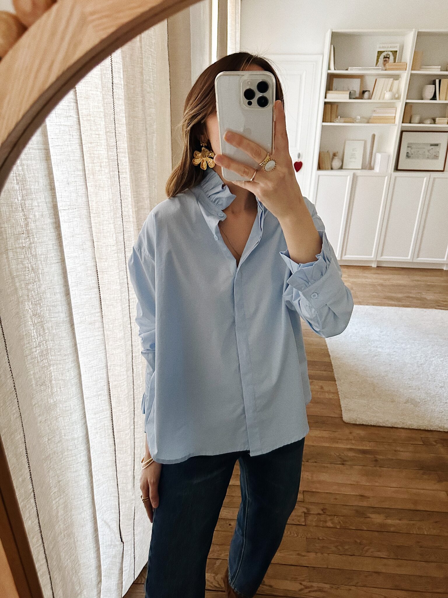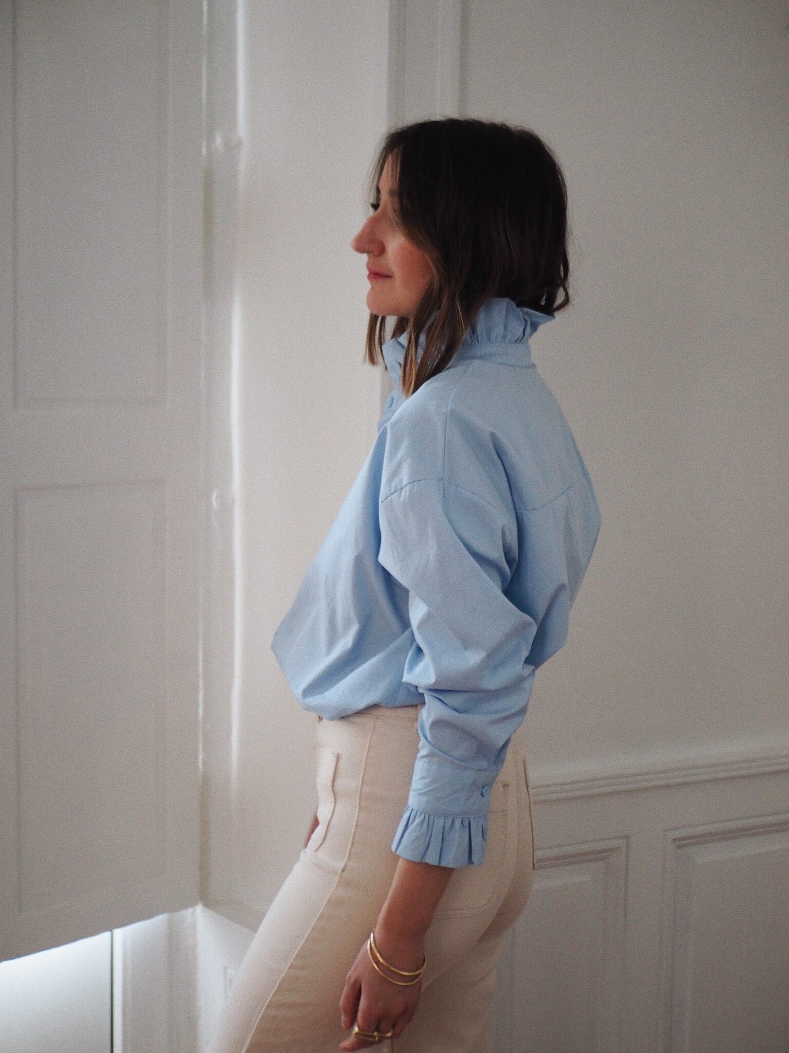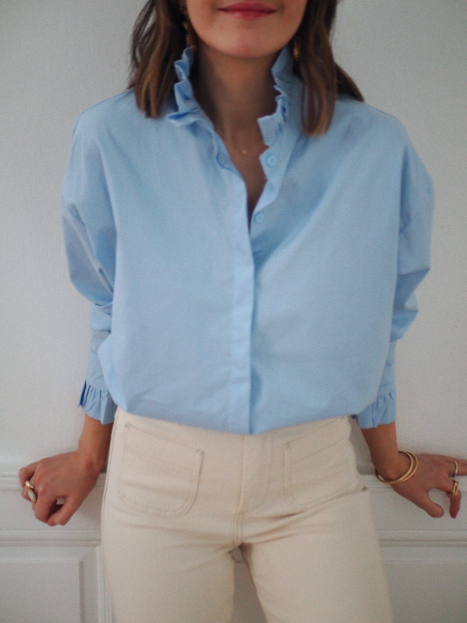 – Chemise en coton doux, au toucher naturel – Coloris bleu ciel lumineux – Coupe droite légèrement ample, au tombé net – Col montant délicatement volanté, à l’allure raffinée – Boutonnage central sous patte – Dos légèrement plus long, finition arrondie – Manches longues finitions poignets boutonnés et volantés – Une pièce qui révèle l’élégance et la féminité dans chaque détail – Egalement disponible en rose