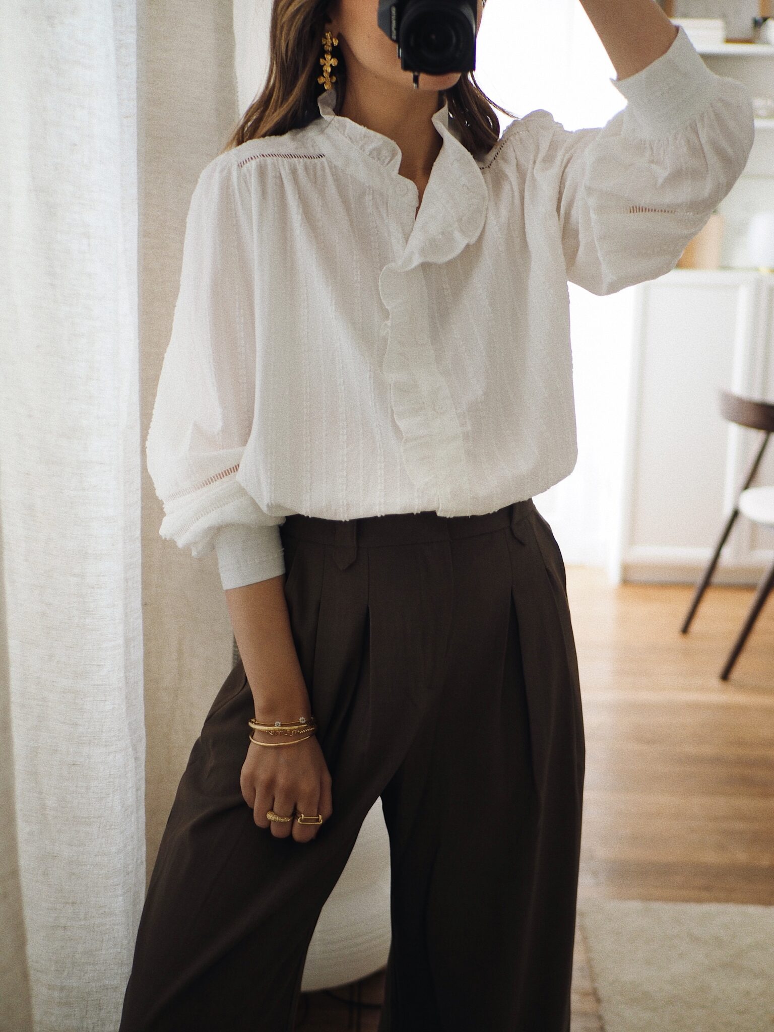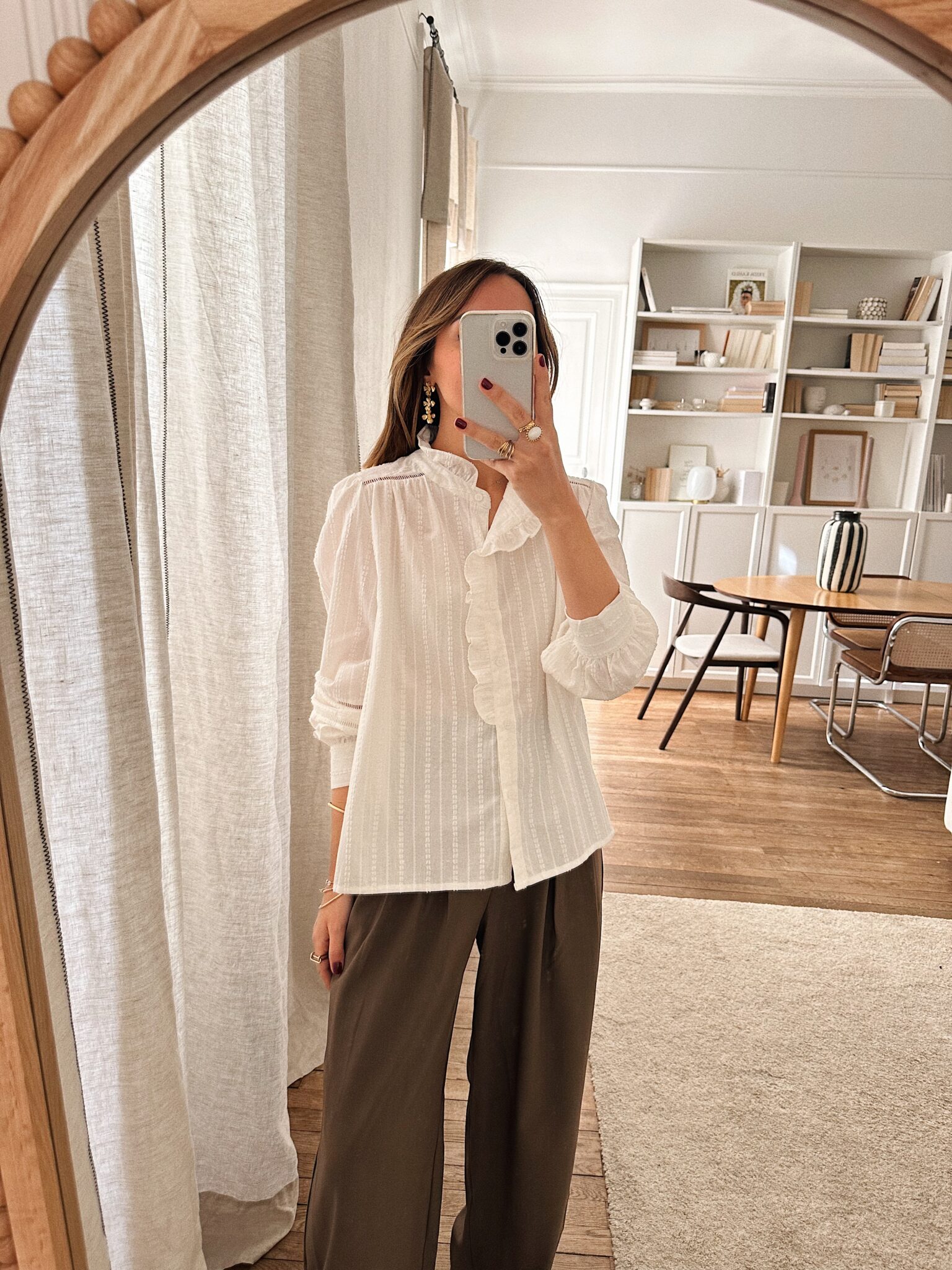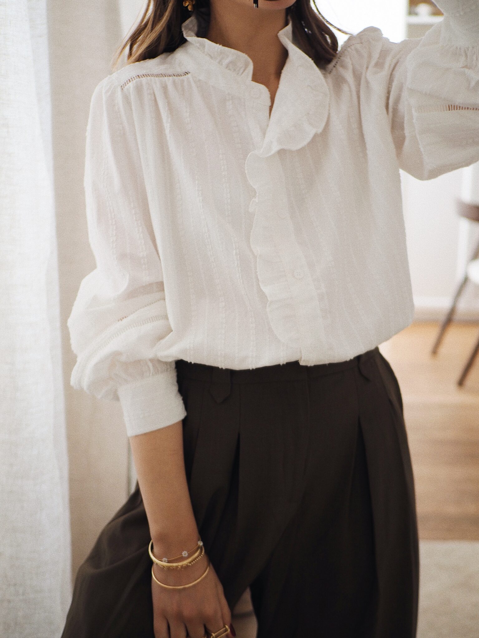 – Chemise en coton texturé et brodé, à fines rayures ton sur ton – Coloris blanc – Coupe droite – Col montant ornée d’un volant descendant sur la patte de boutonnage – Manches longues avec détails ajourés et finitions poignets boutonnés – Délicats détails pour cette pièce pleine de charme