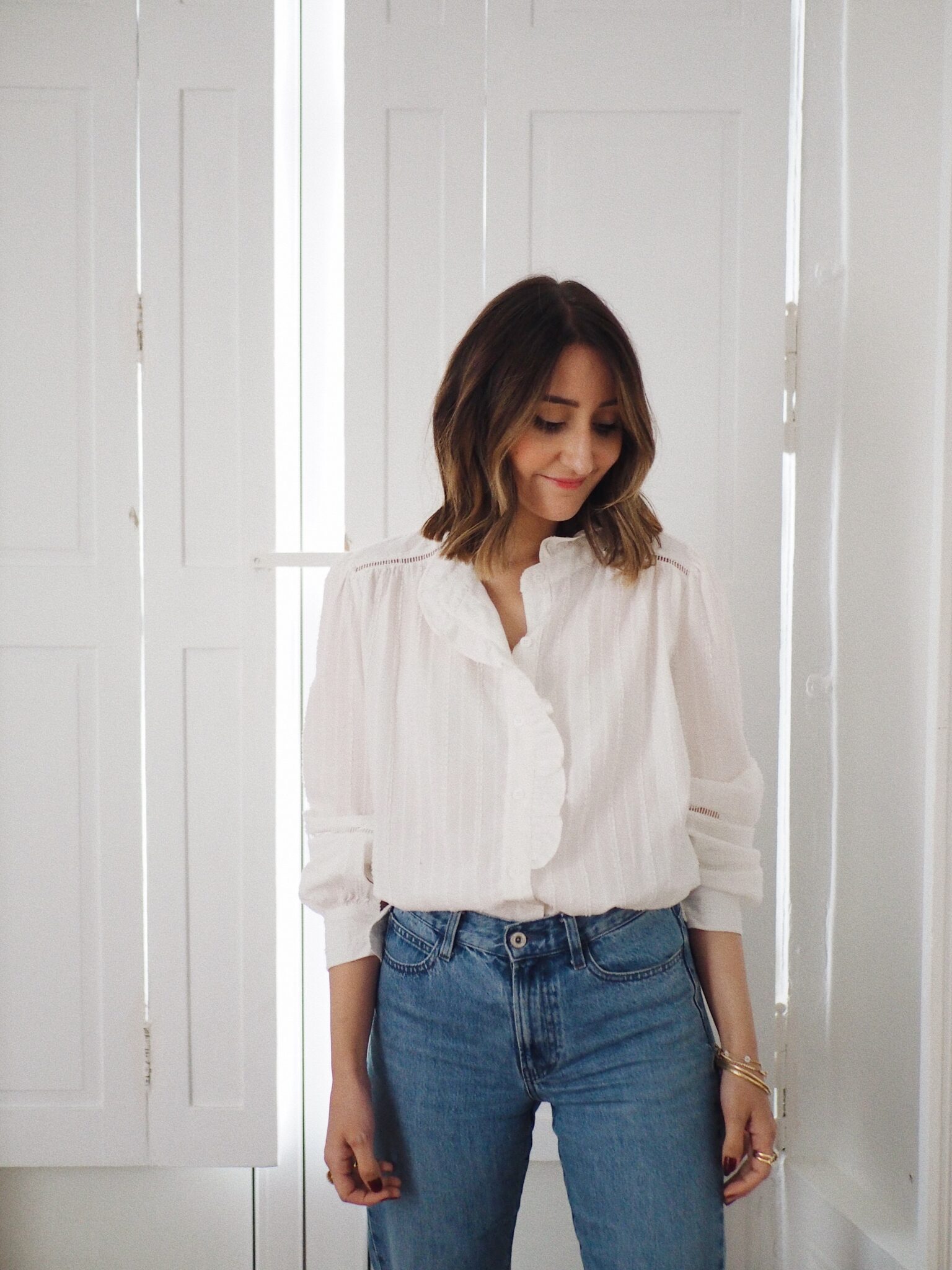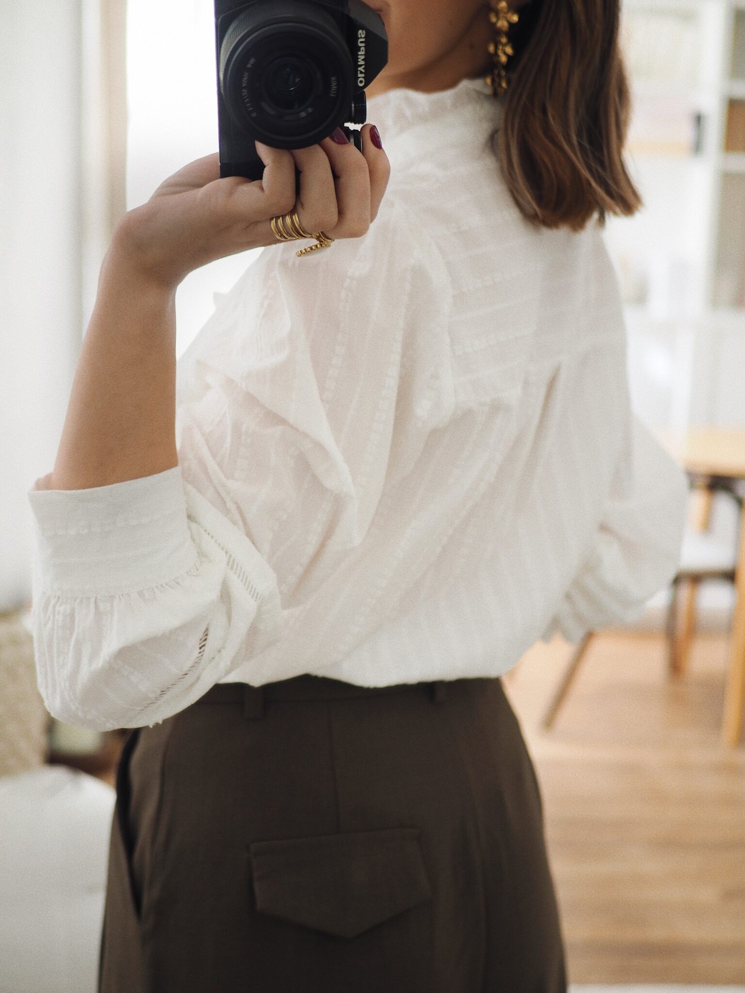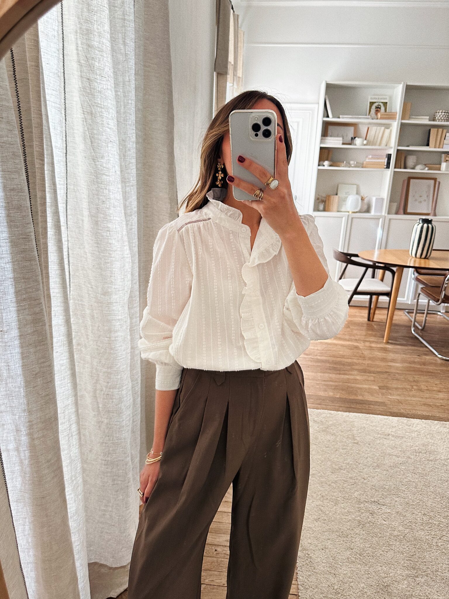 – Chemise en coton texturé et brodé, à fines rayures ton sur ton – Coloris blanc – Coupe droite – Col montant ornée d’un volant descendant sur la patte de boutonnage – Manches longues avec détails ajourés et finitions poignets boutonnés – Délicats détails pour cette pièce pleine de charme