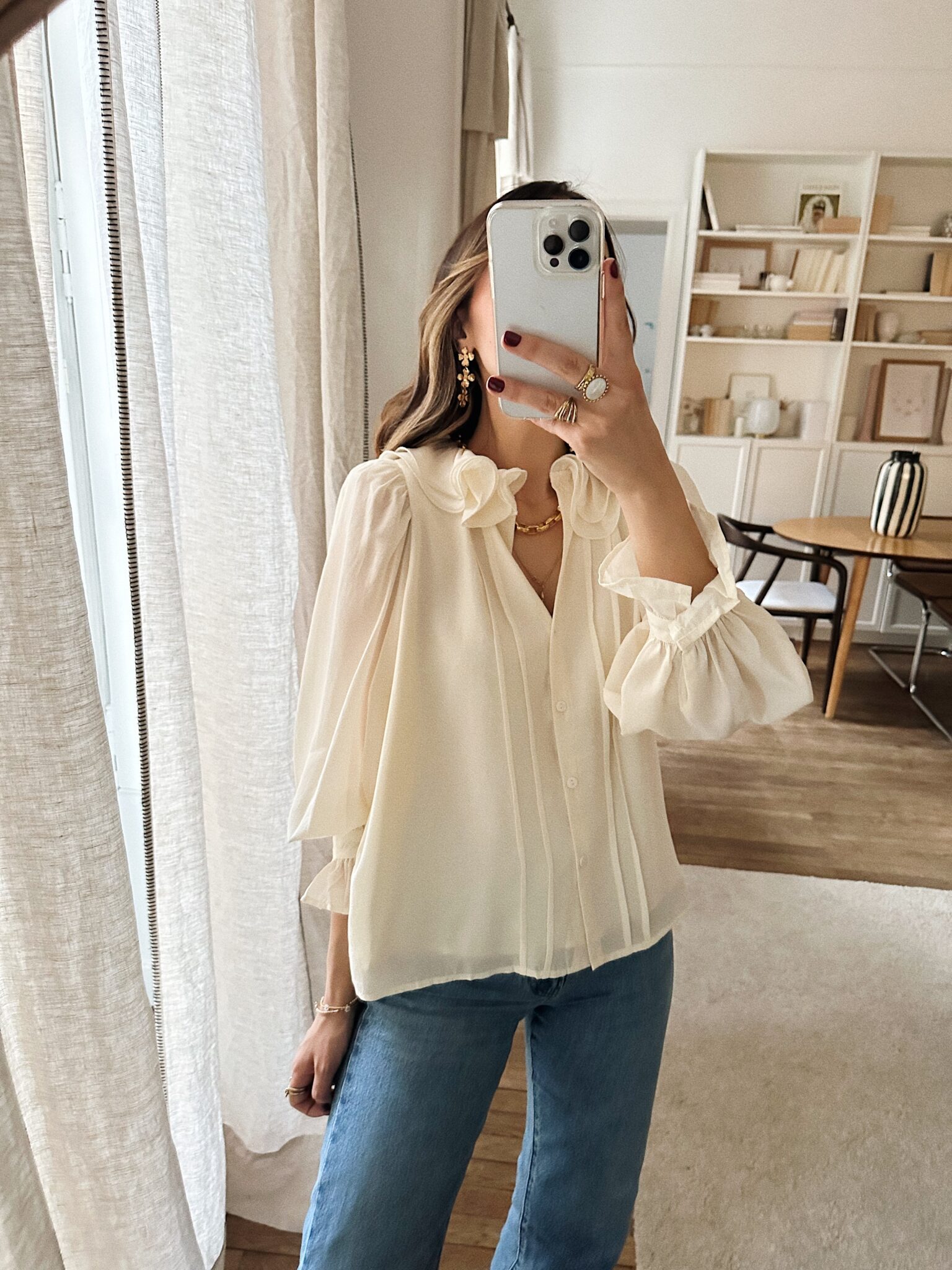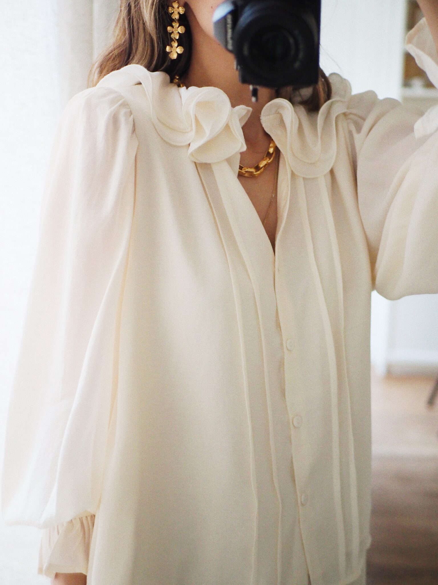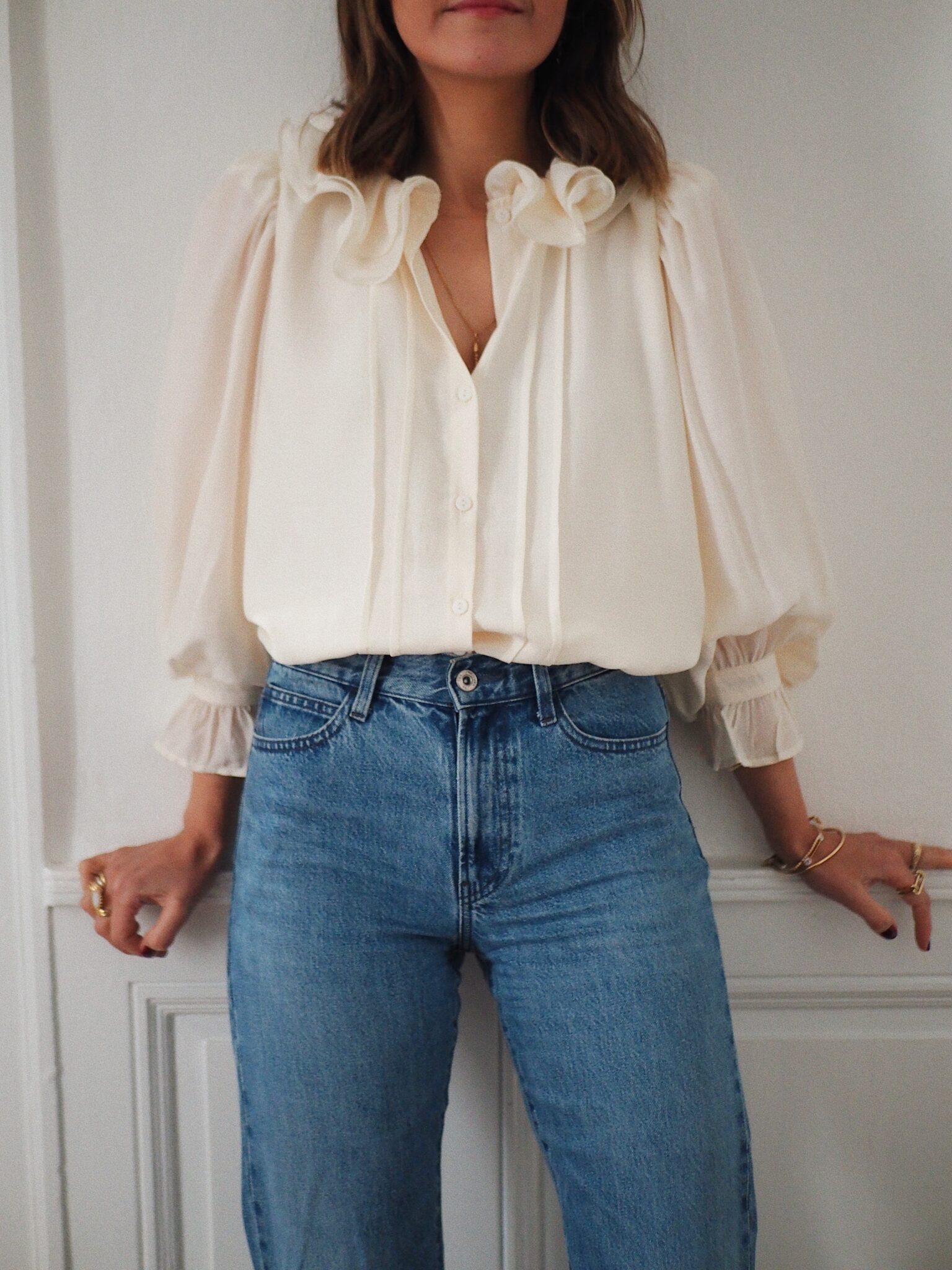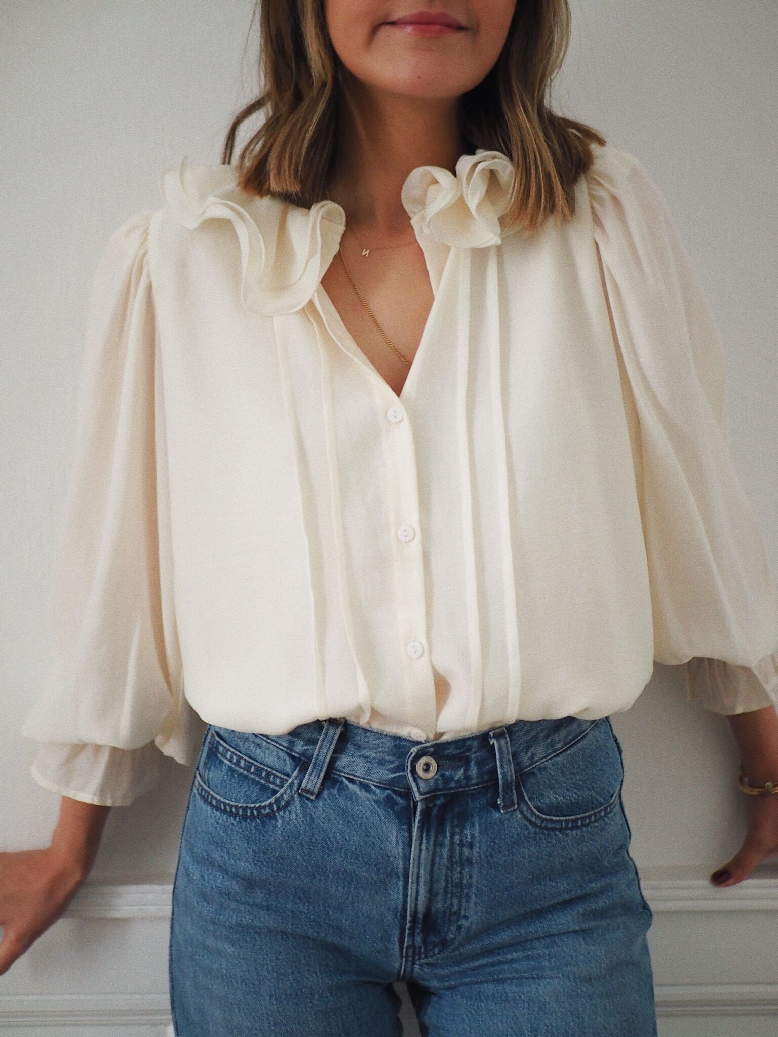– Chemise fluide coloris ivoire – Coupe droite et élégante – Encolure ronde avec double col claudine volanté – Fermeture boutonnée discrète et pinces latérales sur le devant – Manches longues froncées au niveau des épaules – Poignets boutonnés et large volant – Sous-vêtements clairs, nude à privilégier – Une pièce intemporelle qui marie délicatesse et modernité