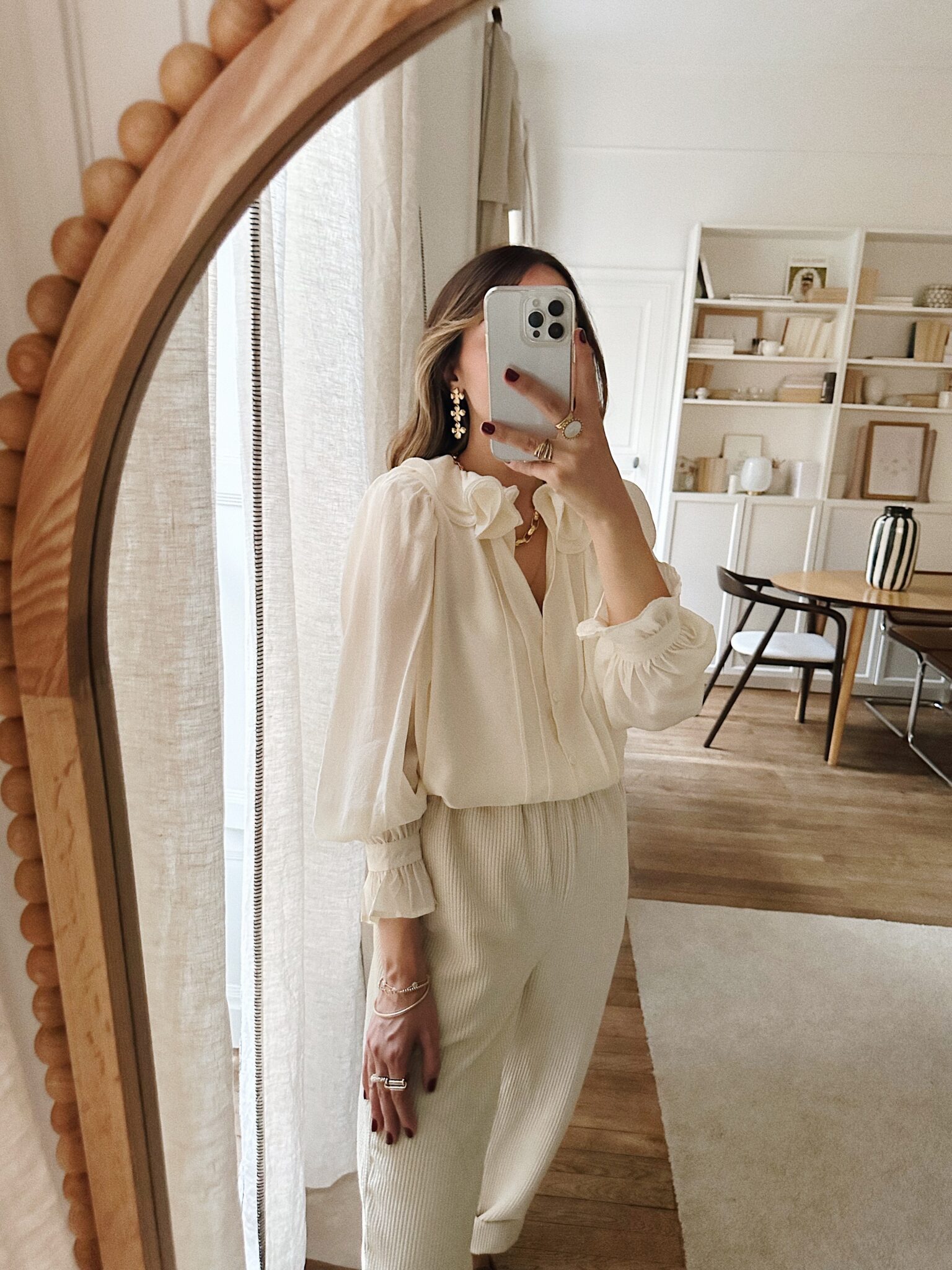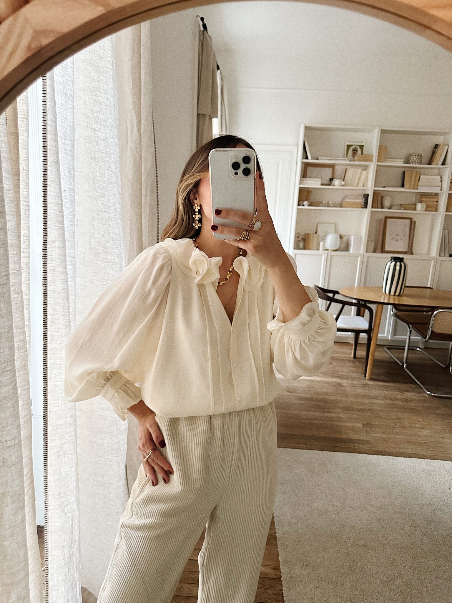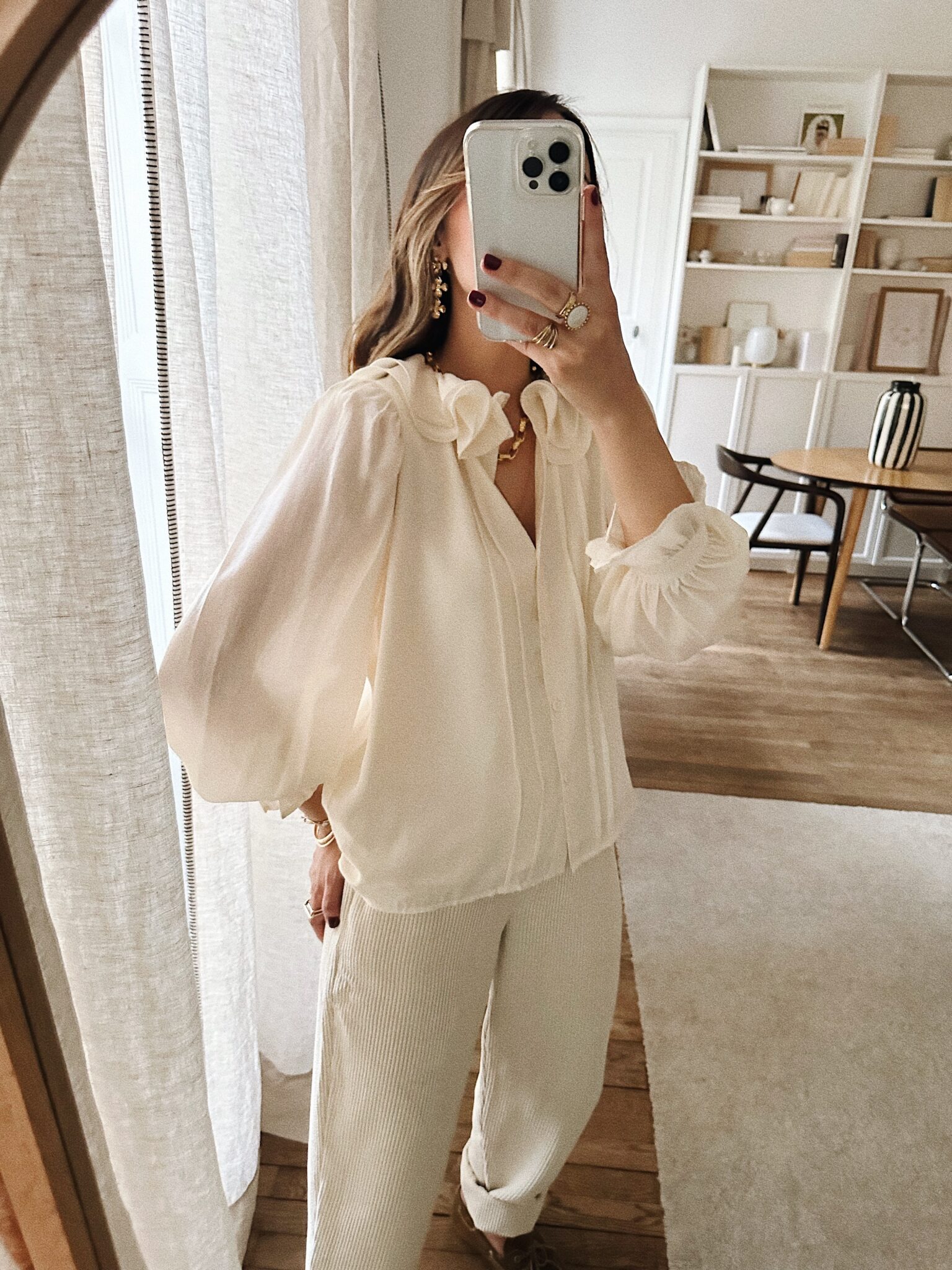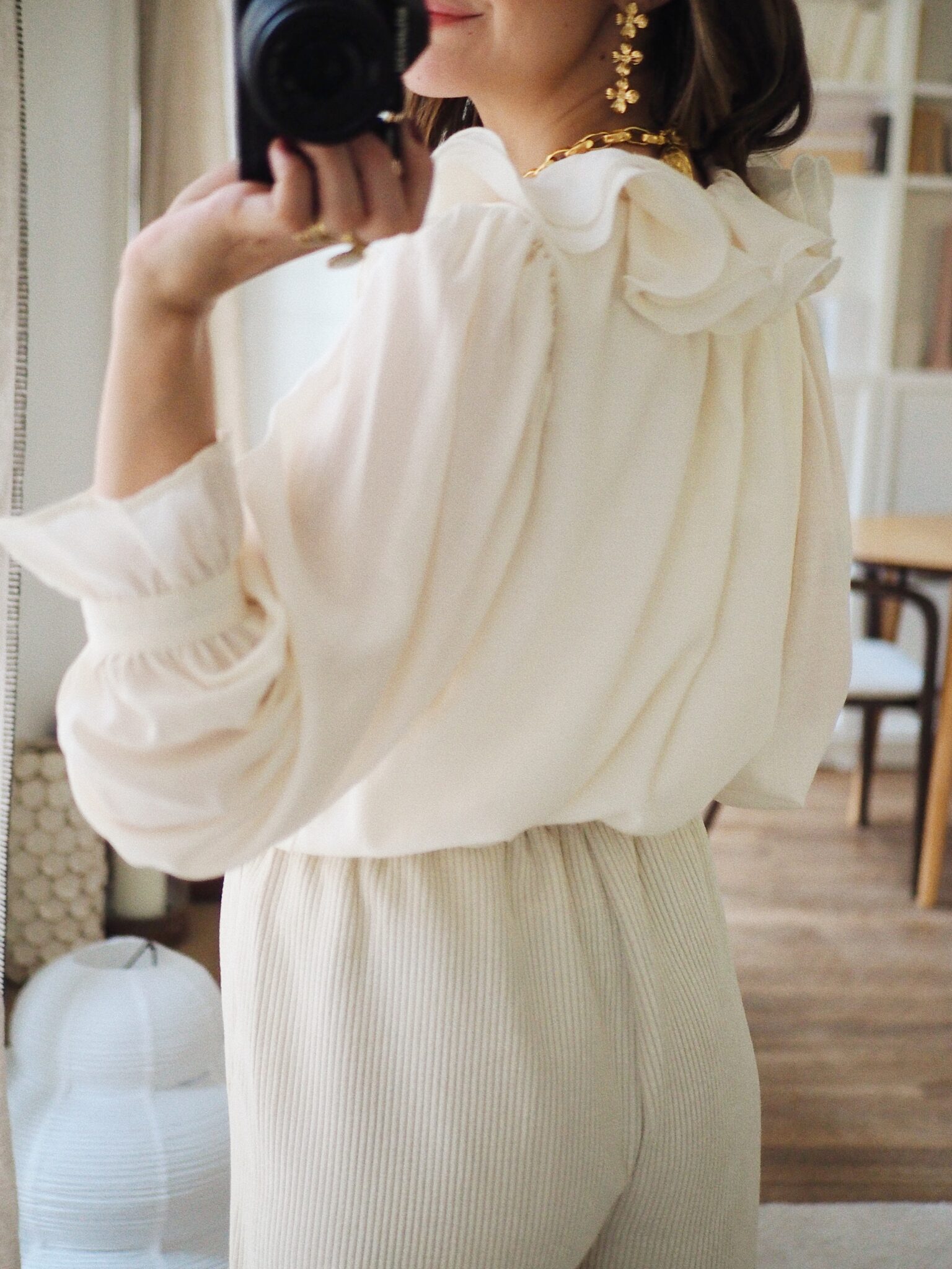 – Chemise fluide coloris ivoire – Coupe droite et élégante – Encolure ronde avec double col claudine volanté – Fermeture boutonnée discrète et pinces latérales sur le devant – Manches longues froncées au niveau des épaules – Poignets boutonnés et large volant – Sous-vêtements clairs, nude à privilégier – Une pièce intemporelle qui marie délicatesse et modernité