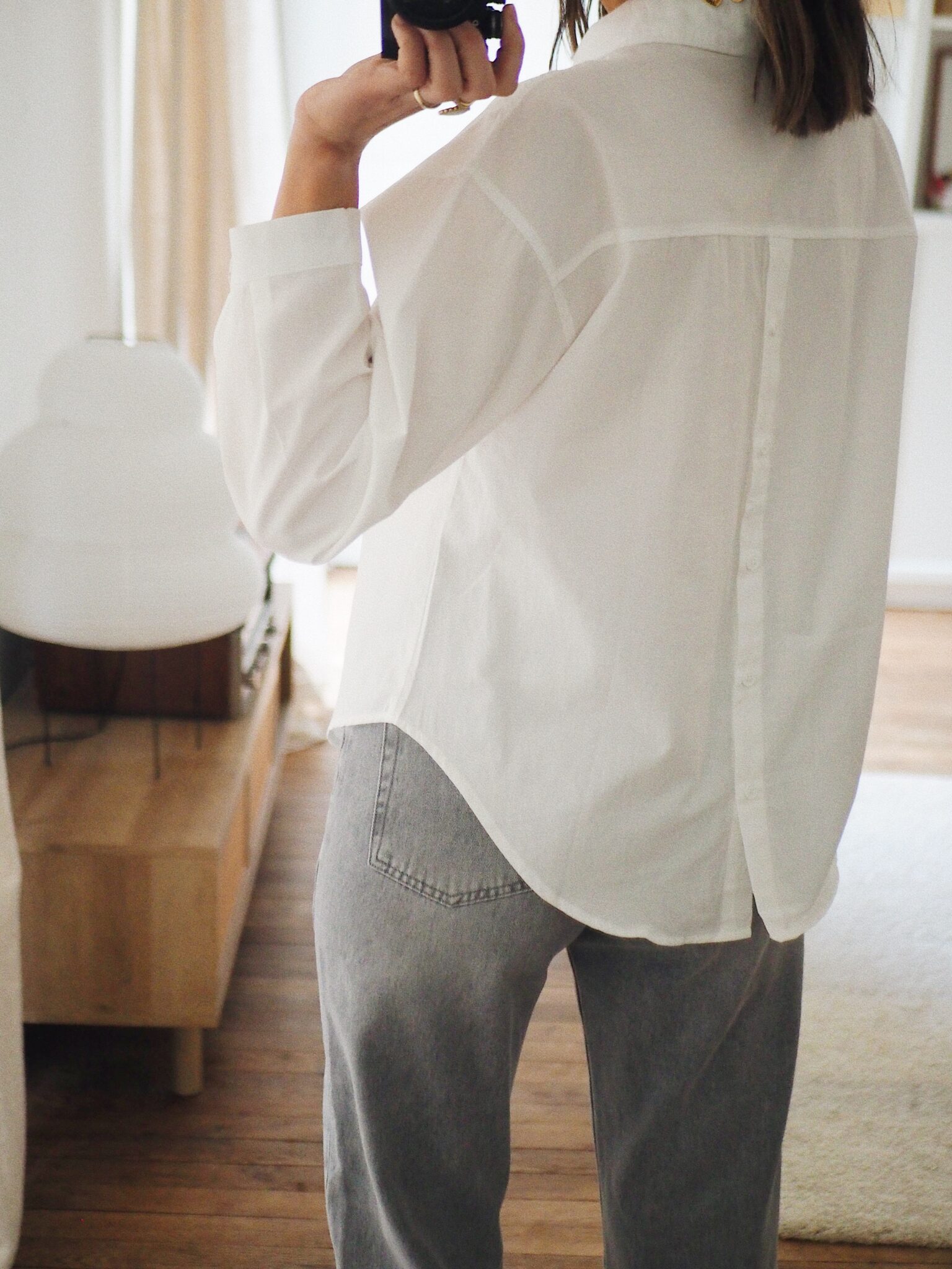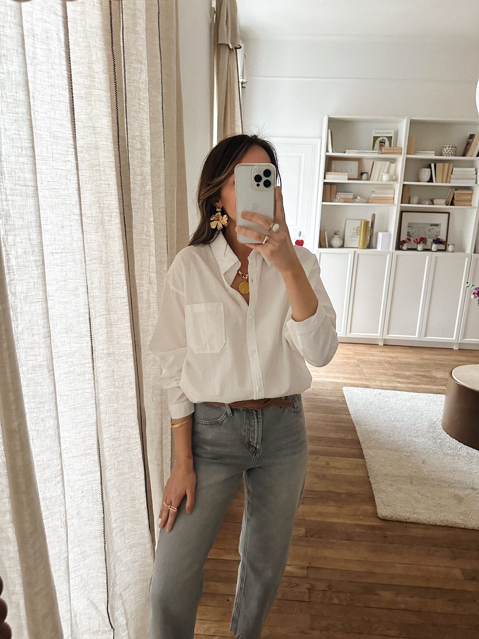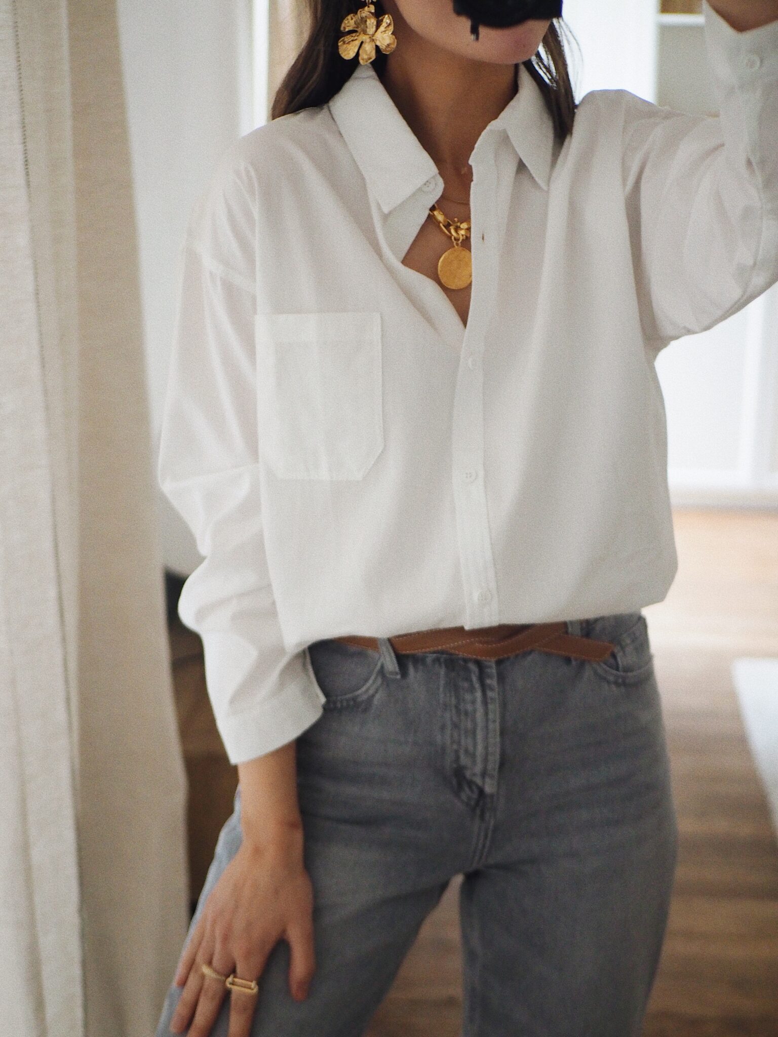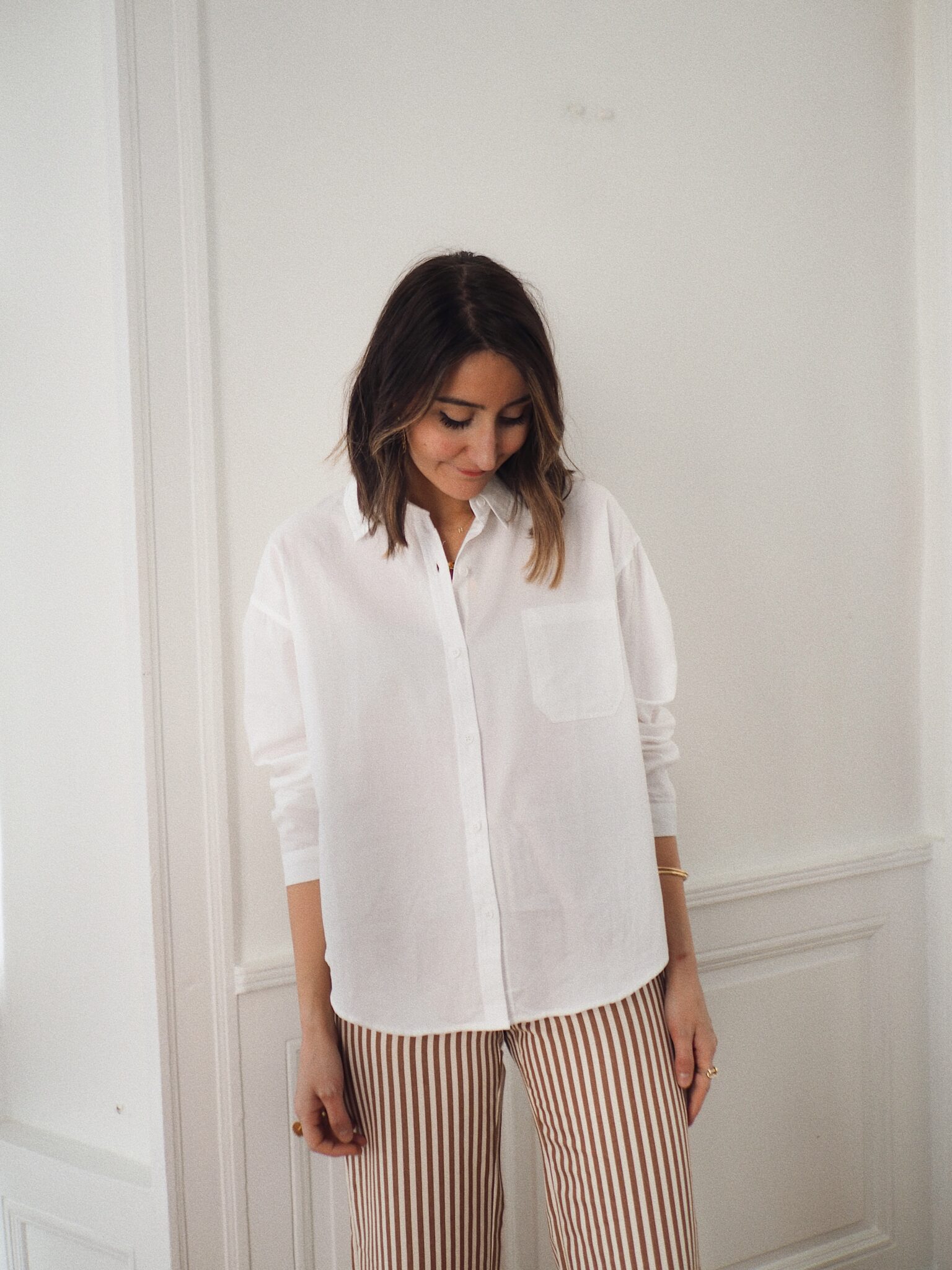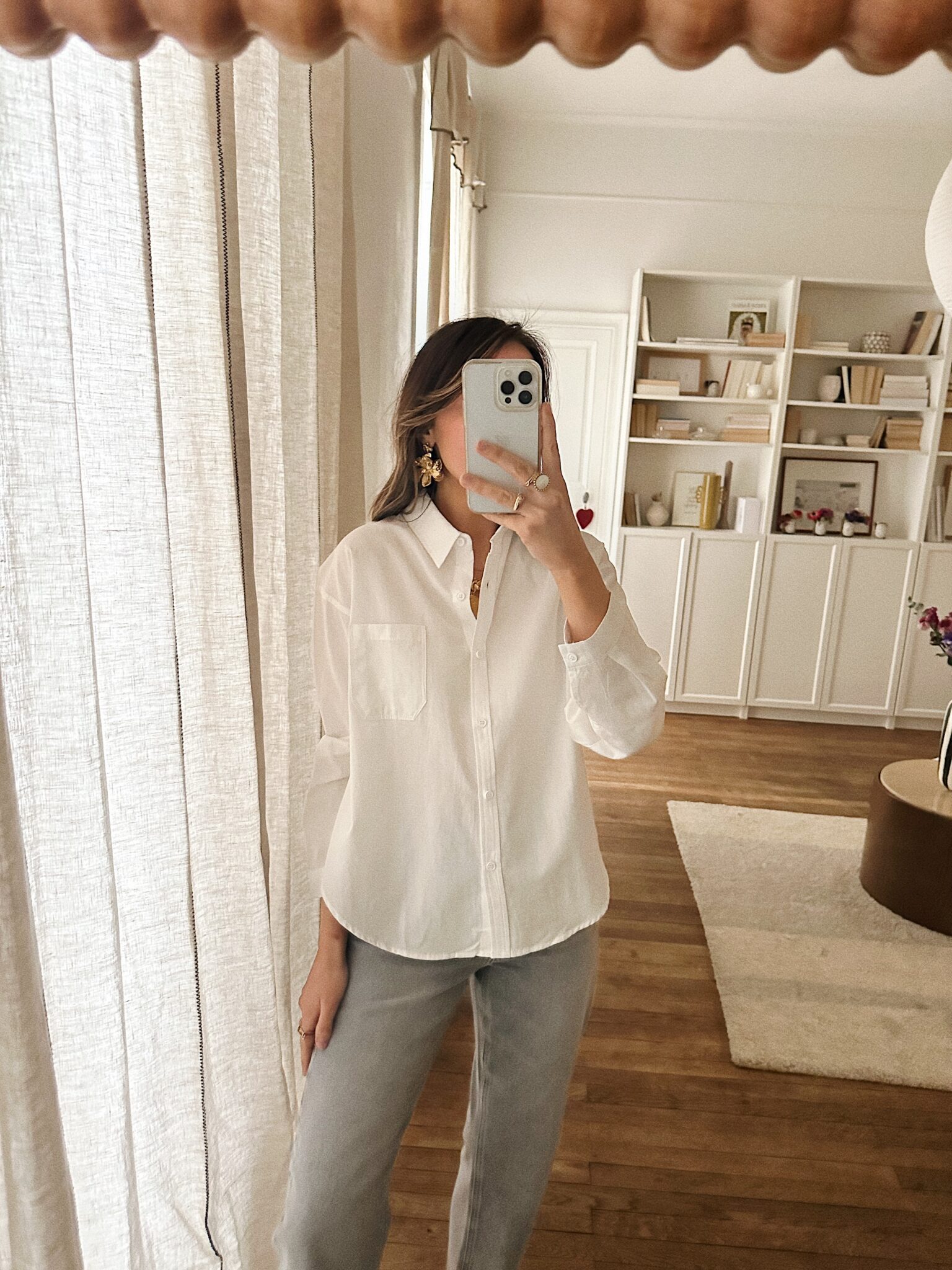 – Une chemise au tombé net, juste et naturellement élégante – Coloris blanc doux – Coupe légèrement ample – Col classique structuré – Patte de boutonnage sur le devant, détail boutonné au dos – Poche plaquée sur poitrine – Manches longues, poignets boutonnés – Base délicatement arrondie – L’essentiel chic par excellence