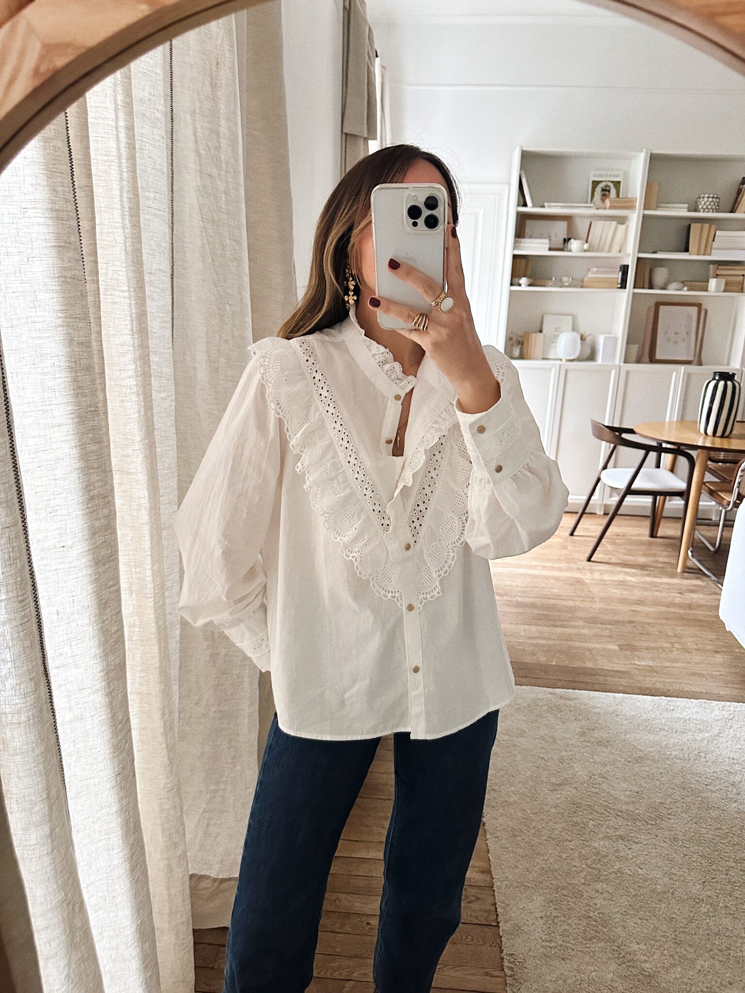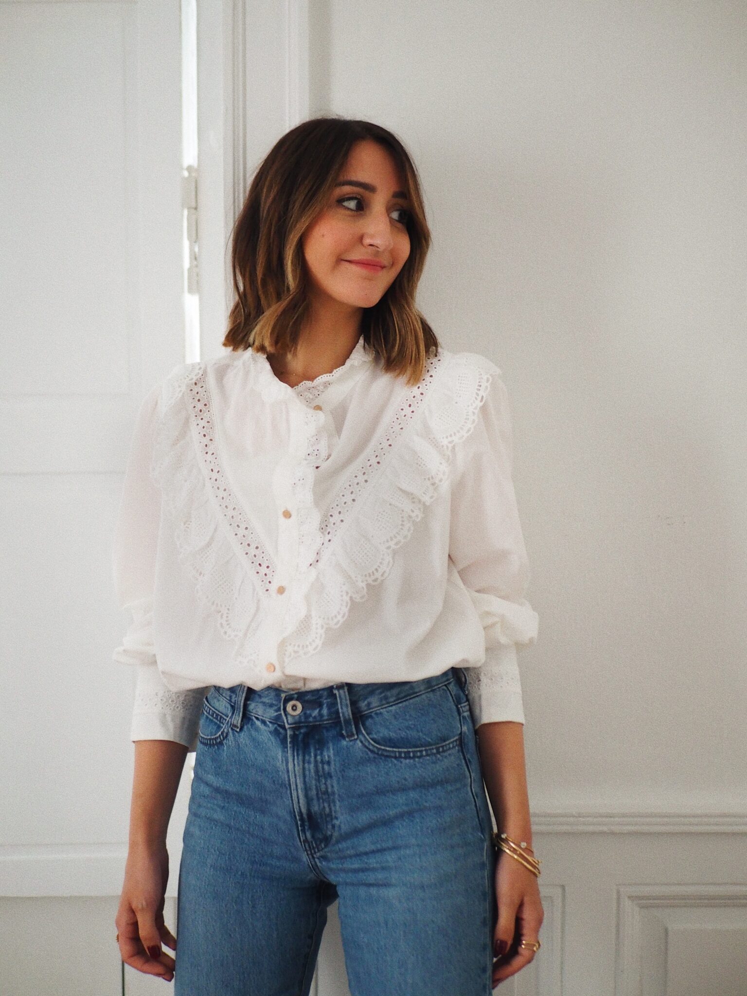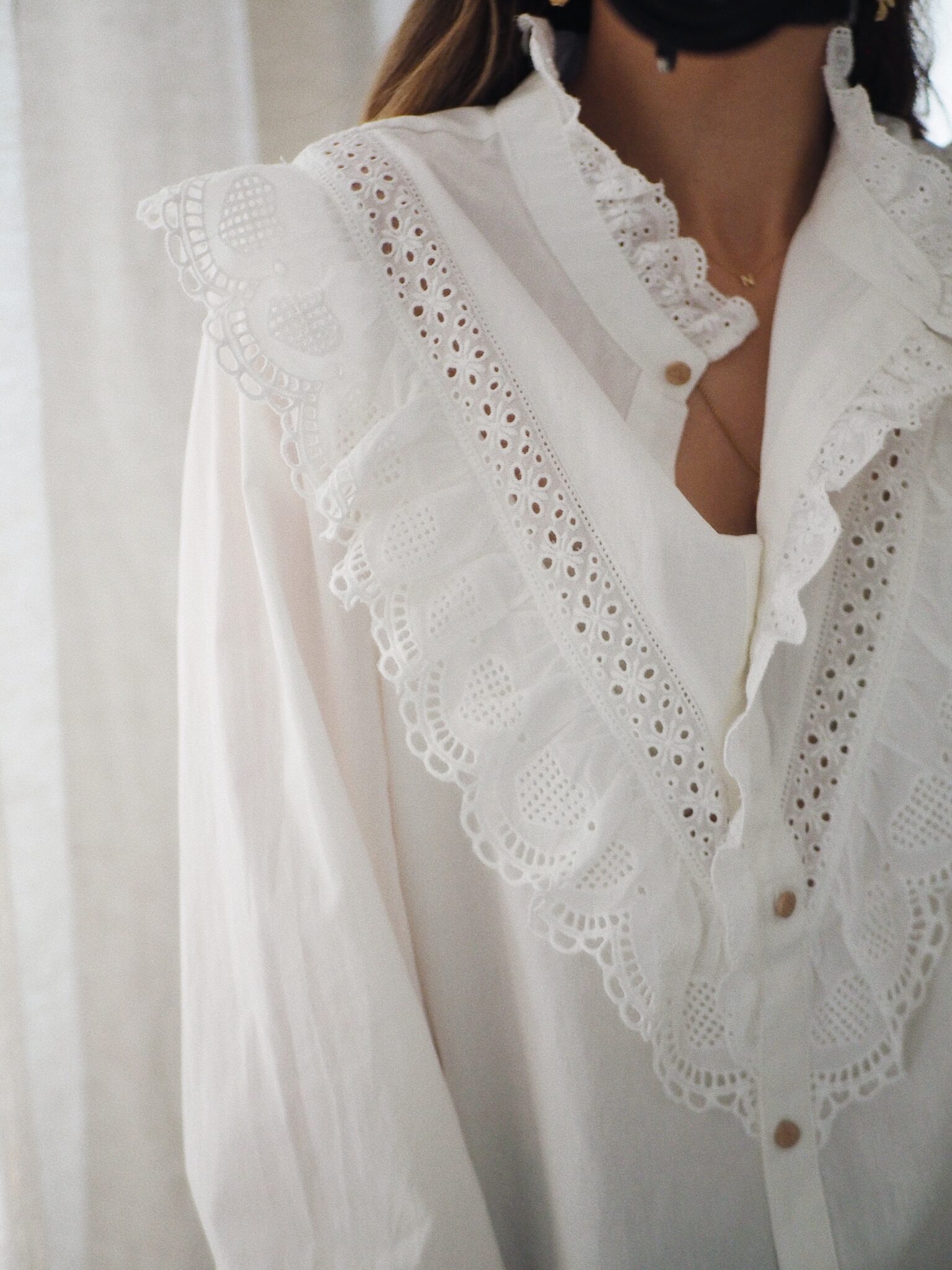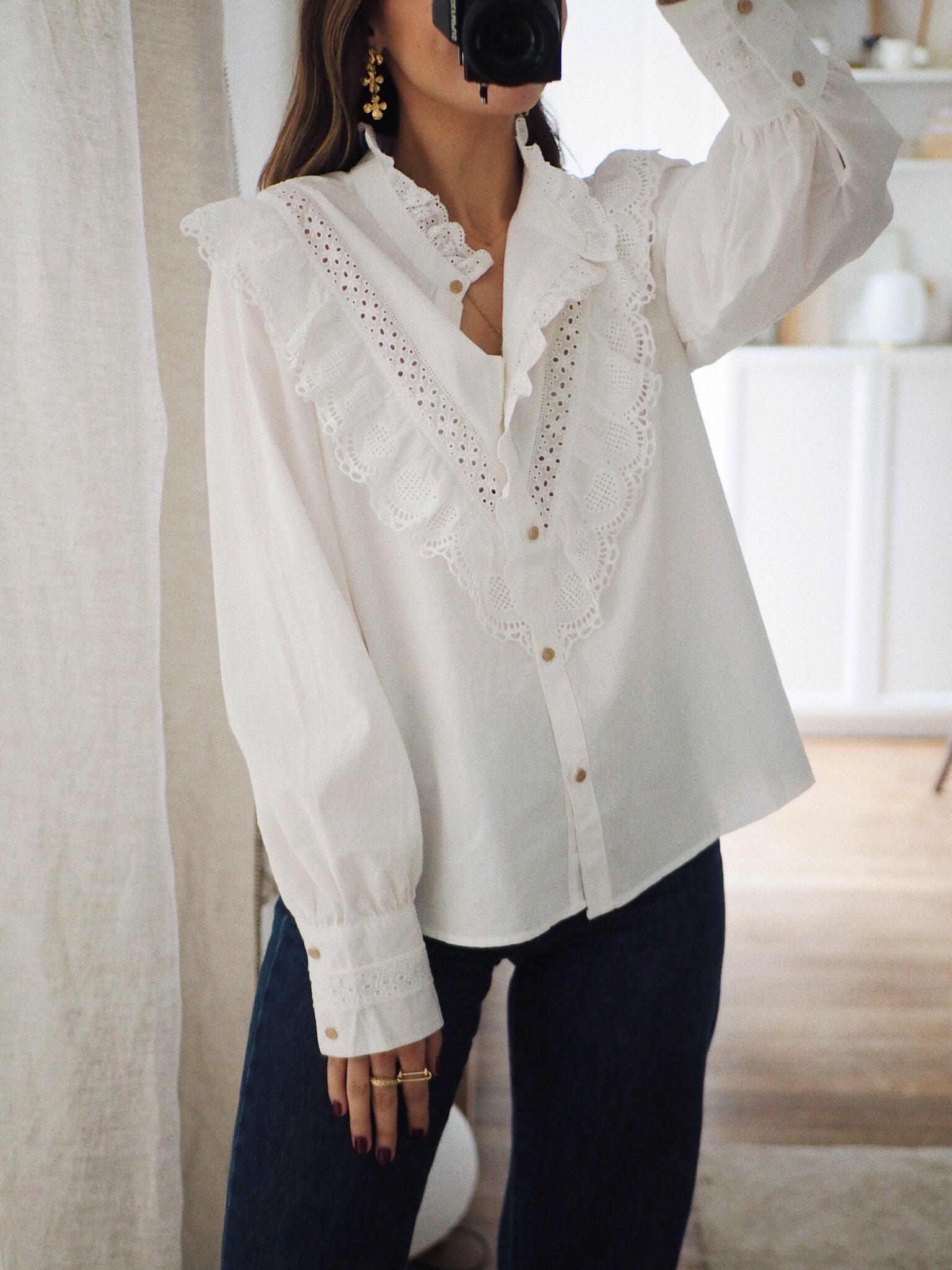 – Chemise en coton au style raffiné – Coloris blanc uni – Coupe droite – Col montant volanté avec détails brodés – Empiècement poitrine orné de dentelle ajourée – Fermeture boutonnée sur le devant – Manches longues avec double boutonnage – Une pièce délicate, romantique, idéale pour un look bohème chic