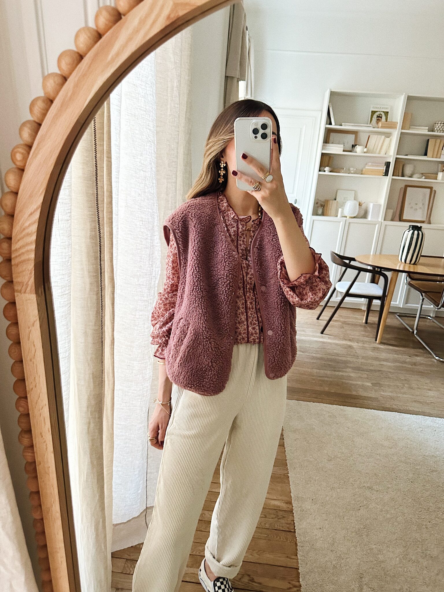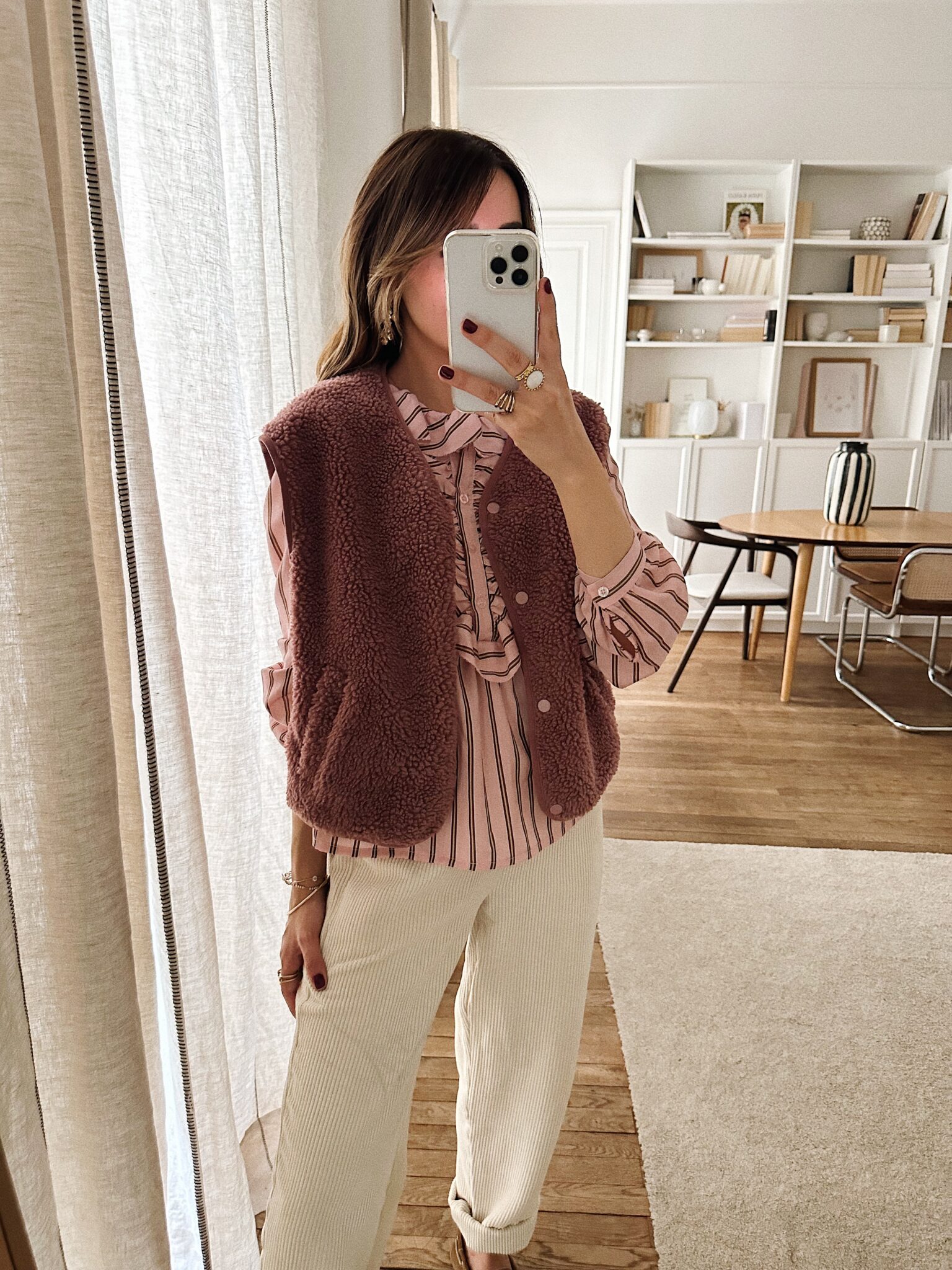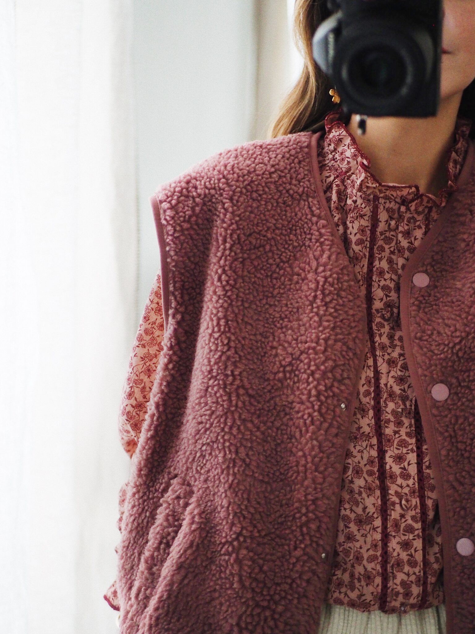 – Gilet sans manches effet sherpa – Coloris vieux rose foncé chaleureux et original – Coupe droite et courte facile à superposer – Encolure en V – Larges emmanchures – Fermeture par bouton-pression sur le devant – Deux poches raglan – Finitions biais, douces et confortables – La touche cosy qui réchauffe vos looks de saison