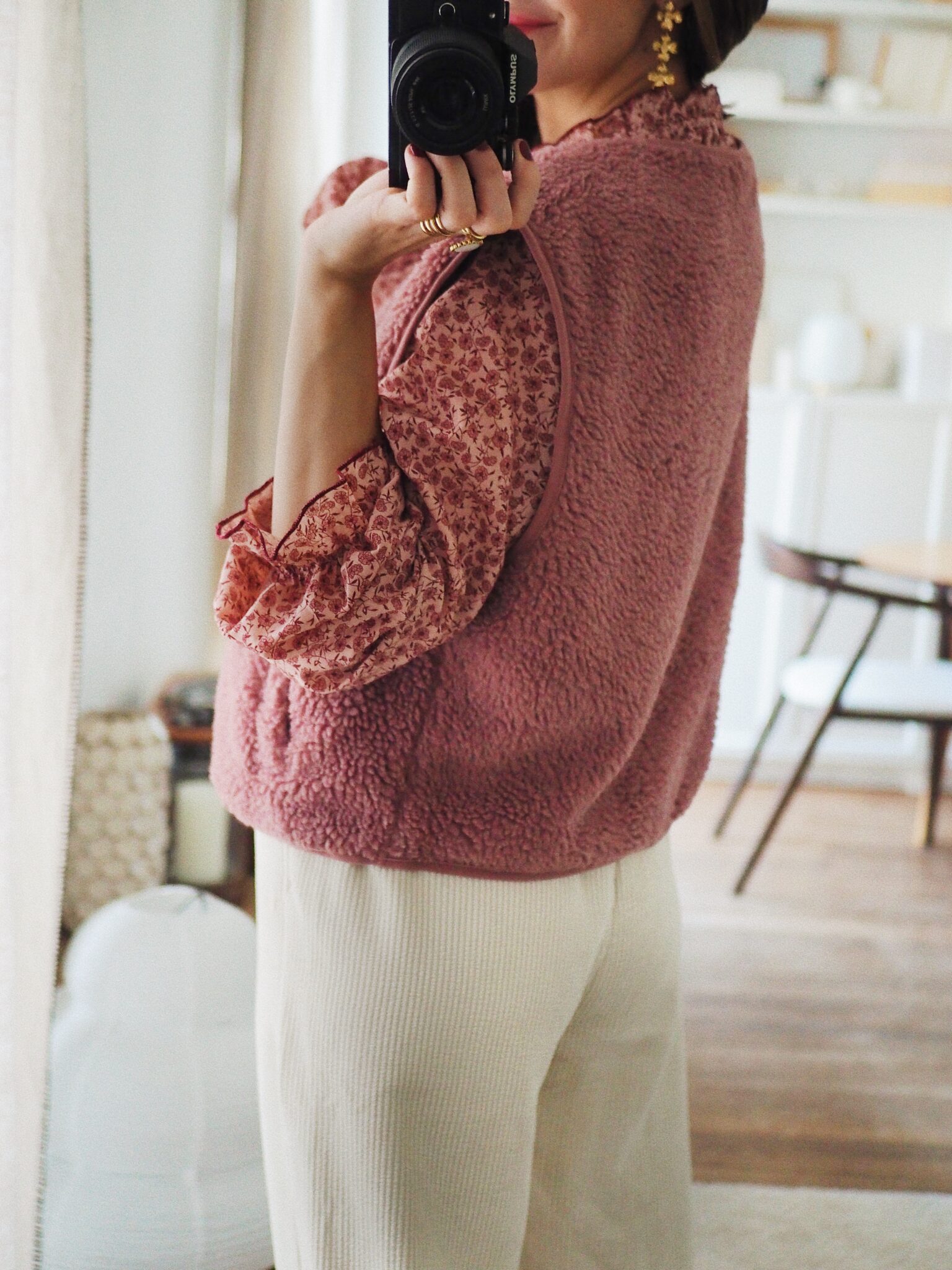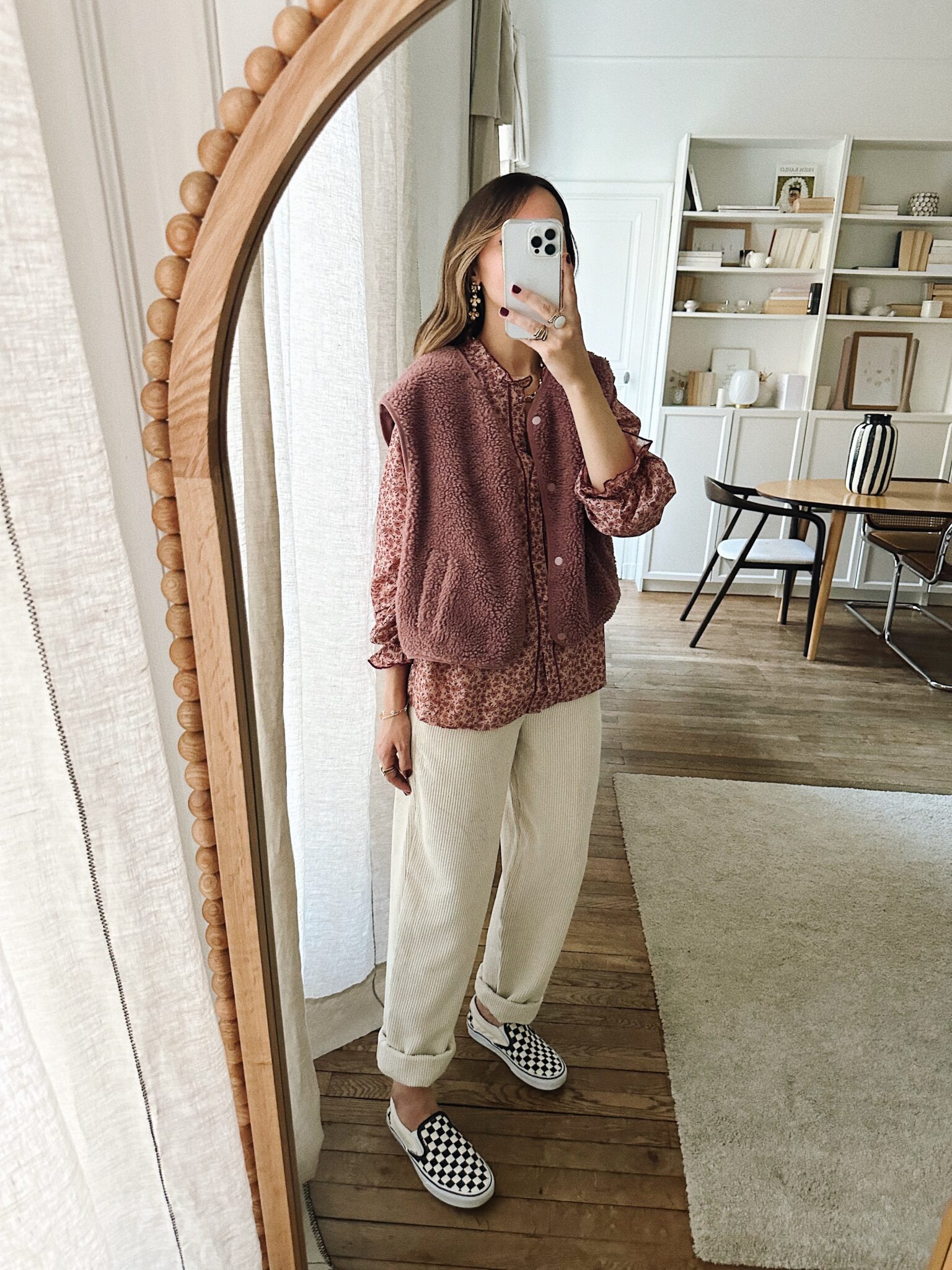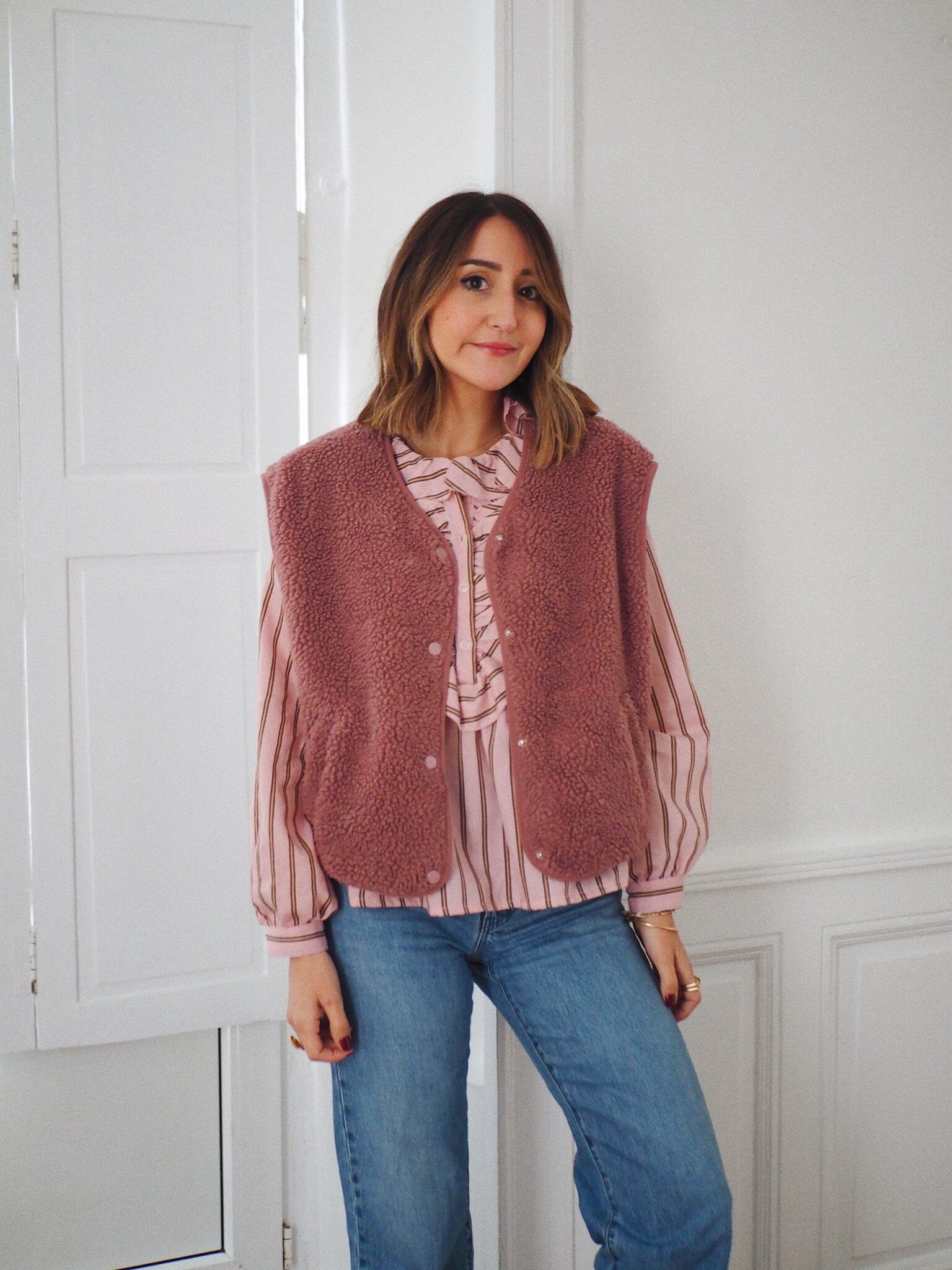 – Gilet sans manches effet sherpa – Coloris vieux rose foncé chaleureux et original – Coupe droite et courte facile à superposer – Encolure en V – Larges emmanchures – Fermeture par bouton-pression sur le devant – Deux poches raglan – Finitions biais, douces et confortables – La touche cosy qui réchauffe vos looks de saison