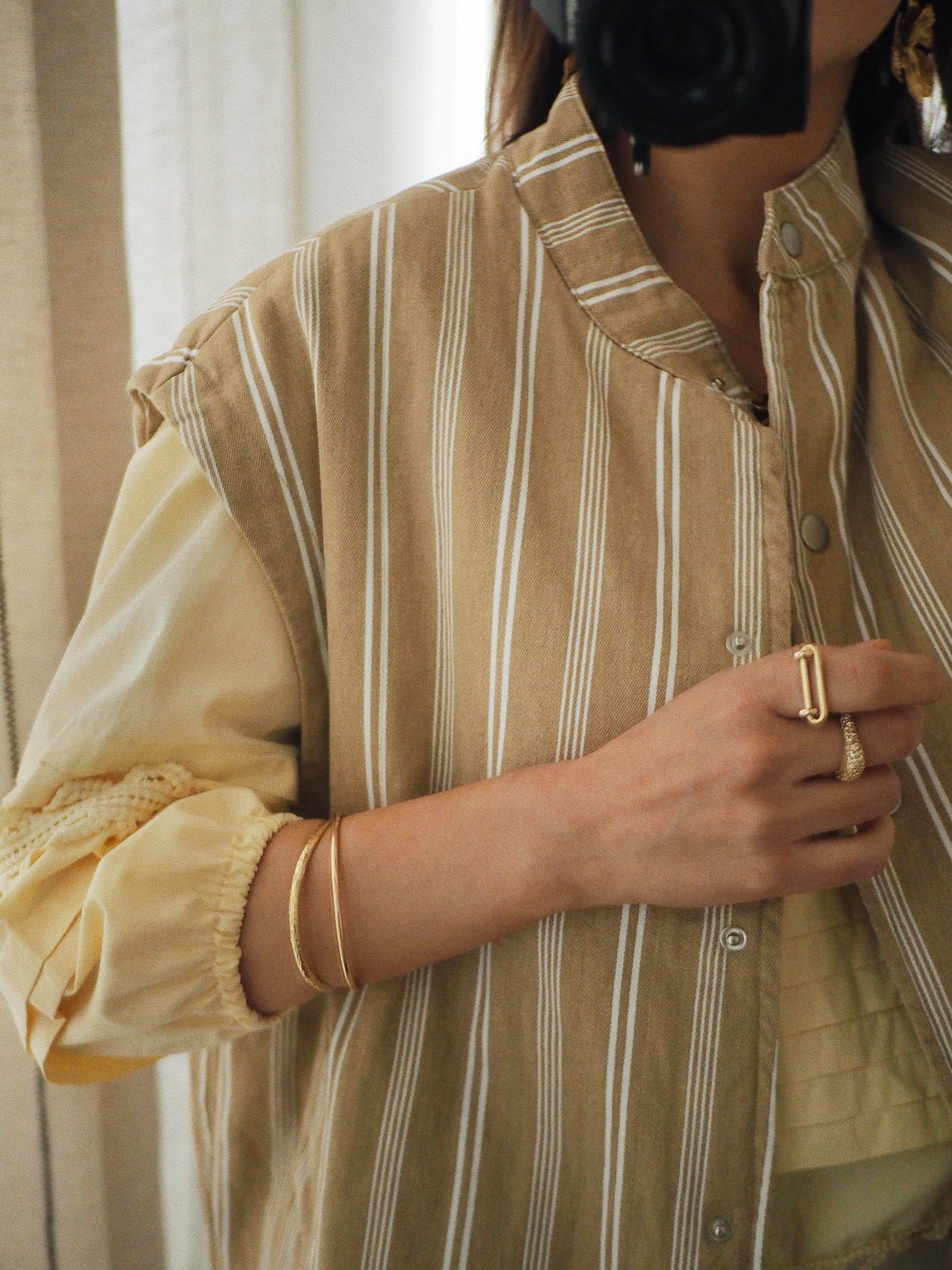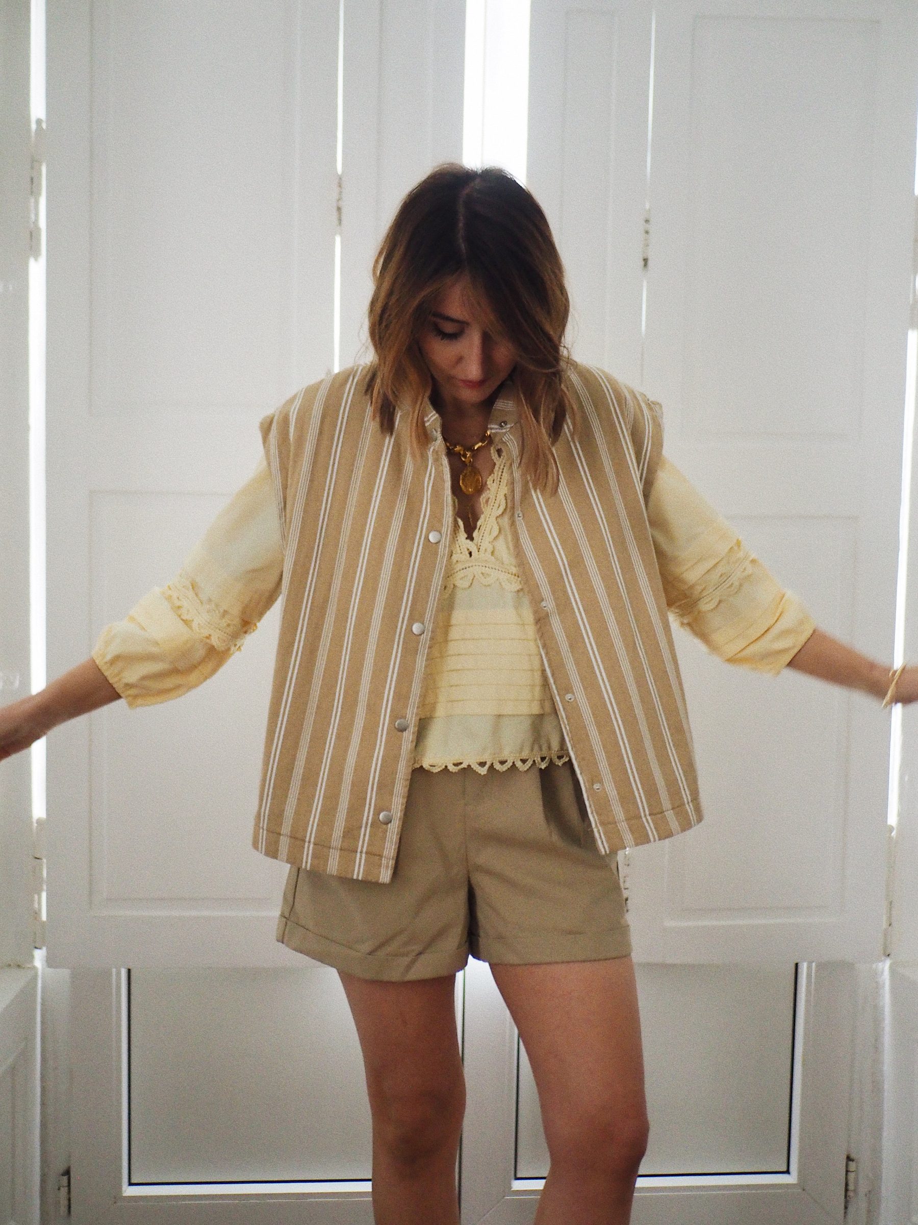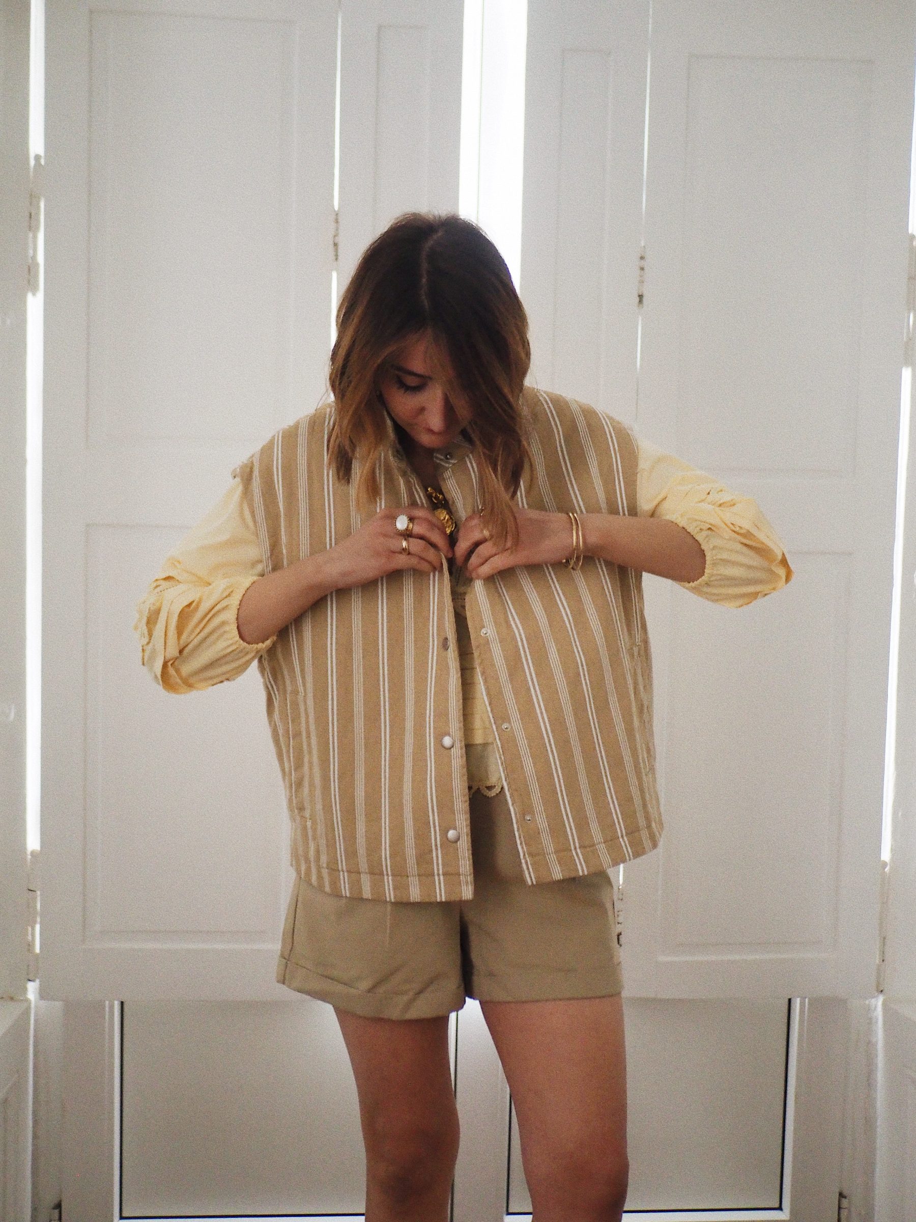 – Une veste sans manches au charme naturel, animé par un jeu de rayures délicates – Coloris beige et écru aux tonalités douces et lumineuses – Matière matelassée en coton – Coupe droite légèrement ample – Encolure ronde – Fermeture pressionnée sur le devant – Deux poches latérales discrètes – Epaules légèrement couvrantes pour une ligne plus douce – Entièrement doublé – La pièce idéale pour jouer les superpositions avec justesse
