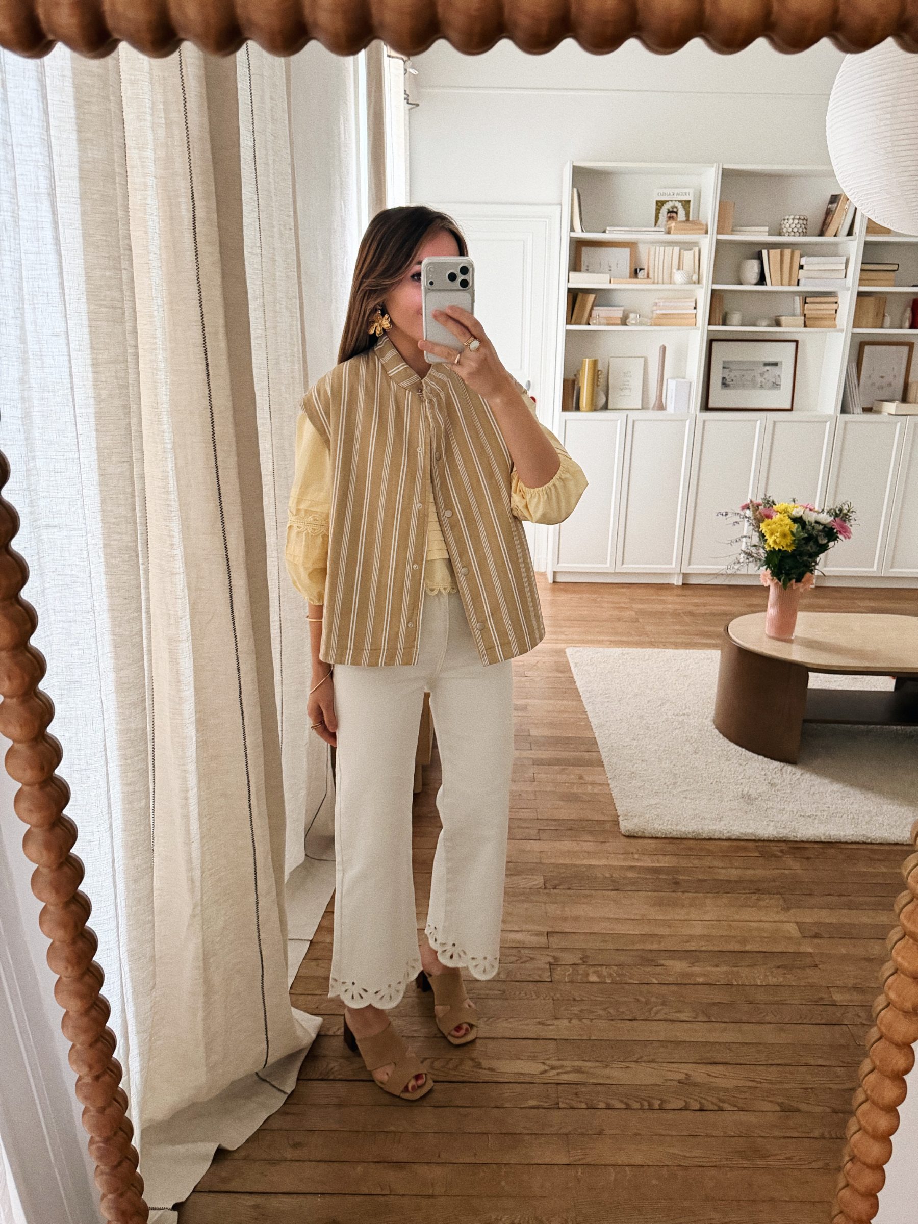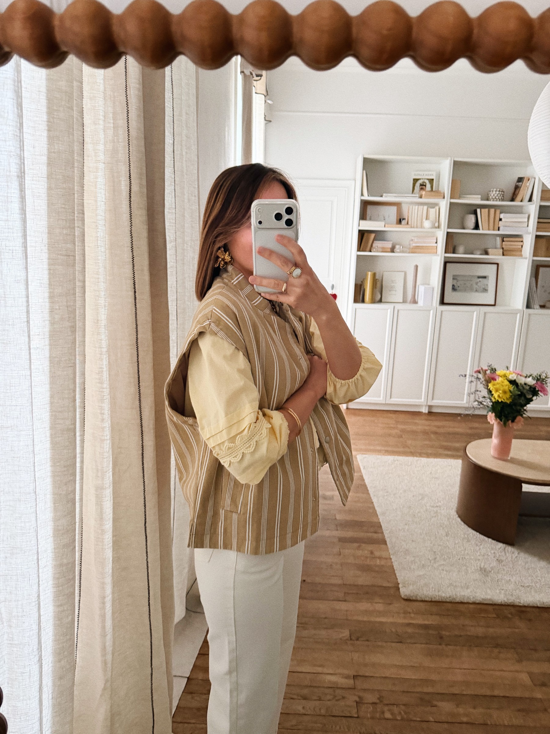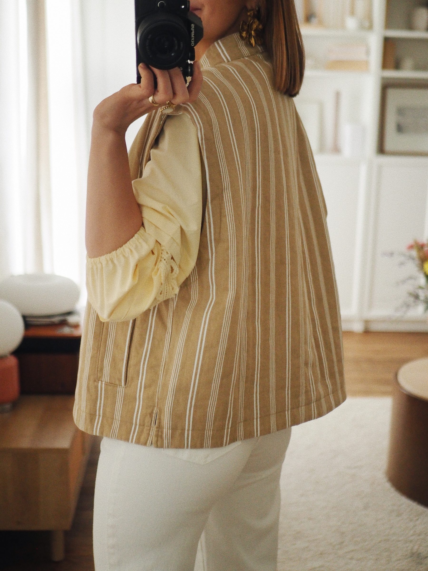 – Une veste sans manches au charme naturel, animé par un jeu de rayures délicates – Coloris beige et écru aux tonalités douces et lumineuses – Matière matelassée en coton – Coupe droite légèrement ample – Encolure ronde – Fermeture pressionnée sur le devant – Deux poches latérales discrètes – Epaules légèrement couvrantes pour une ligne plus douce – Entièrement doublé – La pièce idéale pour jouer les superpositions avec justesse