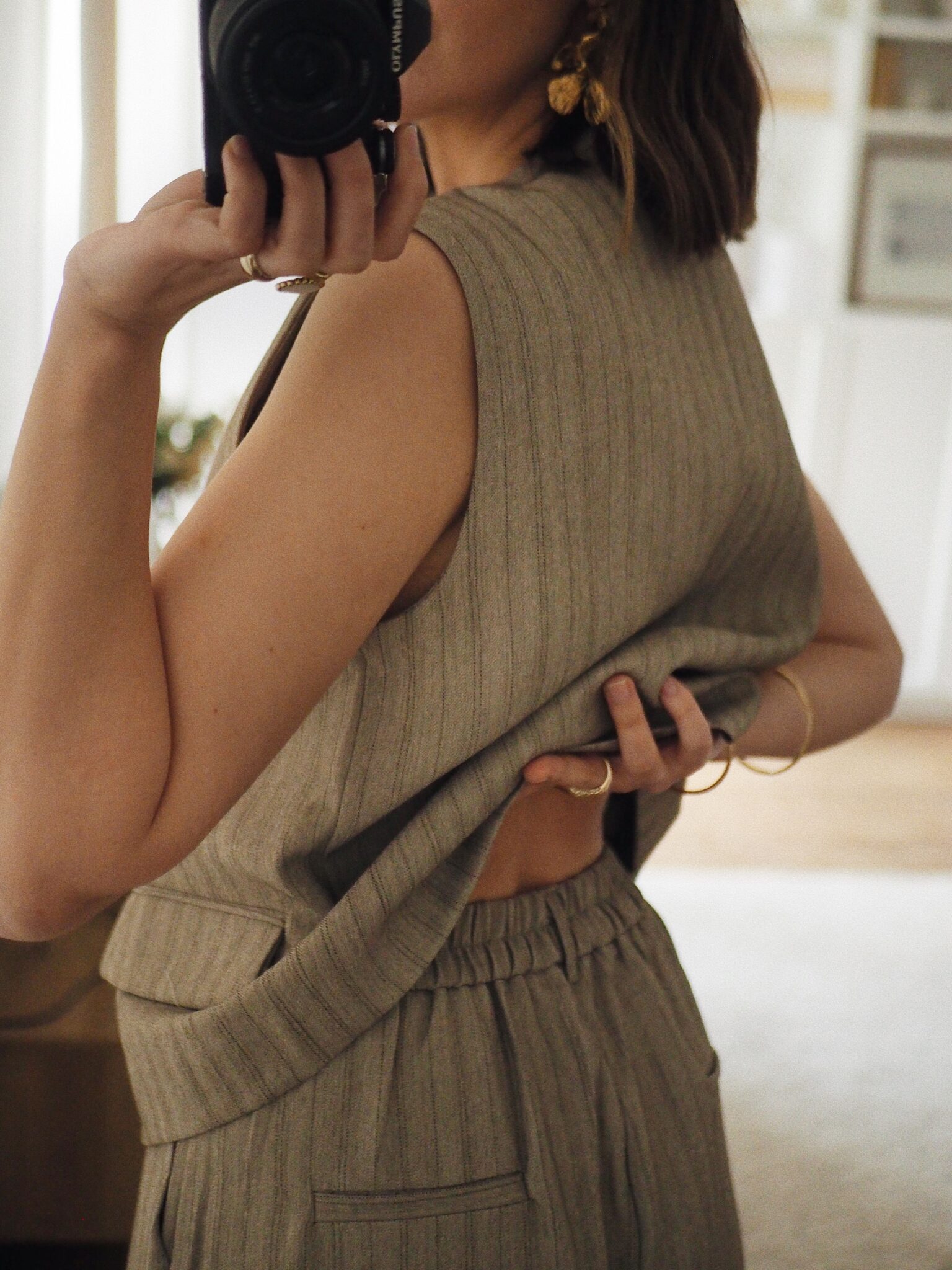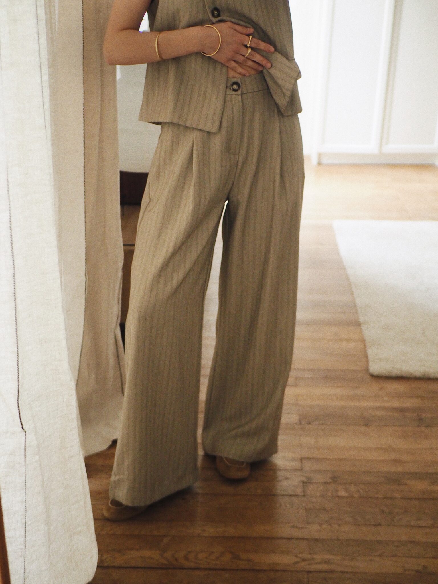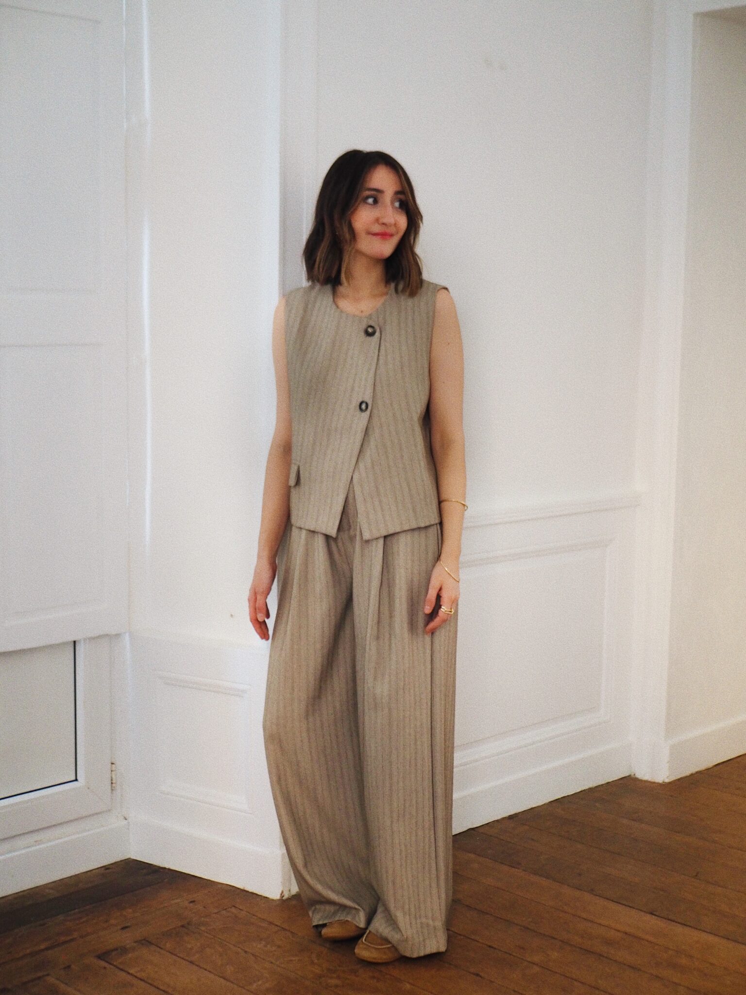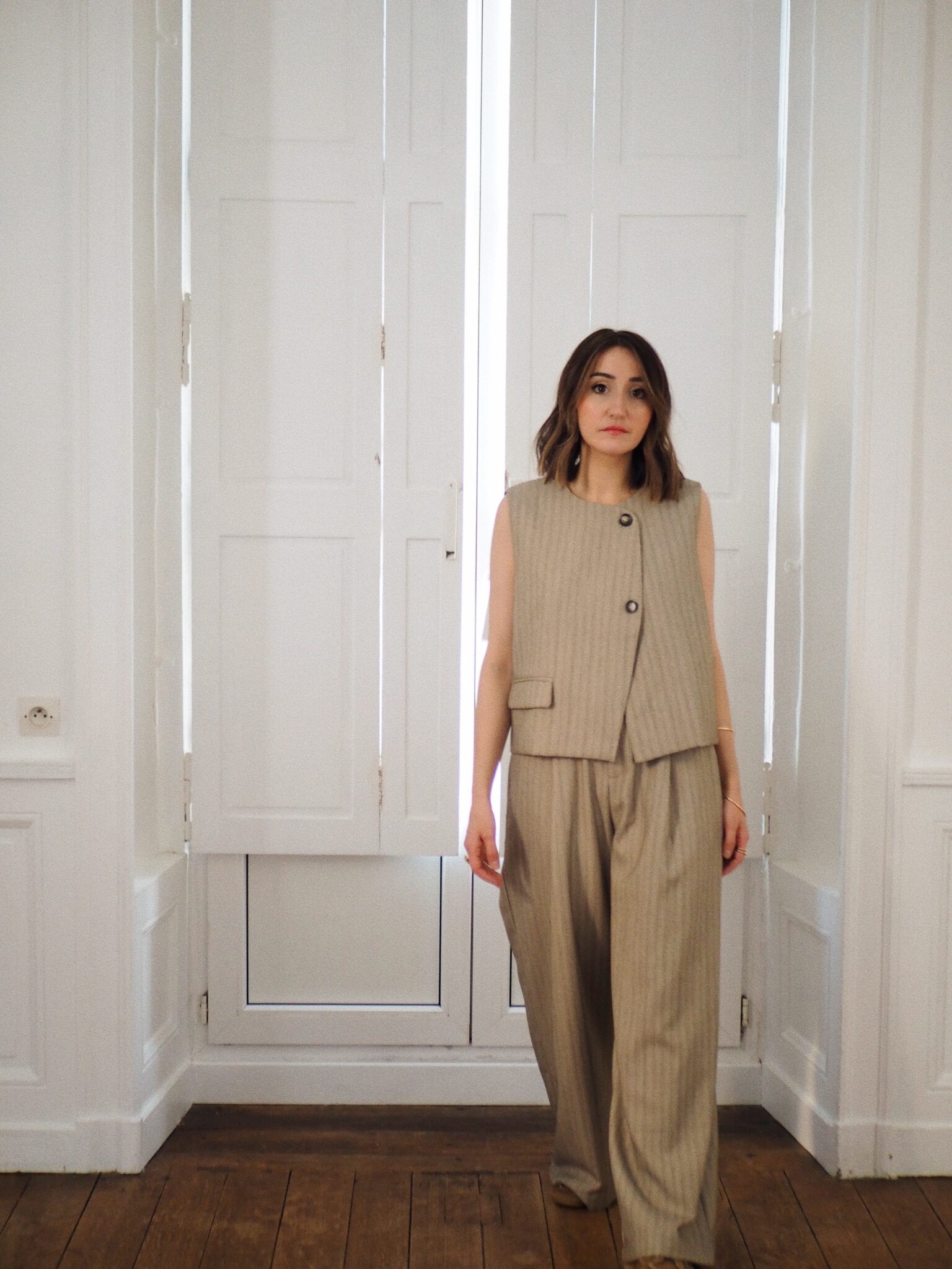 – Pantalon à pinces à fines rayures verticales, au tombé impeccable – Coloris grège doux – Coupe large au tombé fluide et structuré – Taille haute et fermeture zippée discrète – Ceinture qui conjugue allure et confort: plate devant, élastiquée au dos – Deux poches raglan sur le devant, deux poches passepoilées à l’arrière – Légèrement stretch, au toucher souple – À porter seul ou à associer au gilet Elton pour une silhouette coordonnée – Une pièce forte à l’élégance évidente