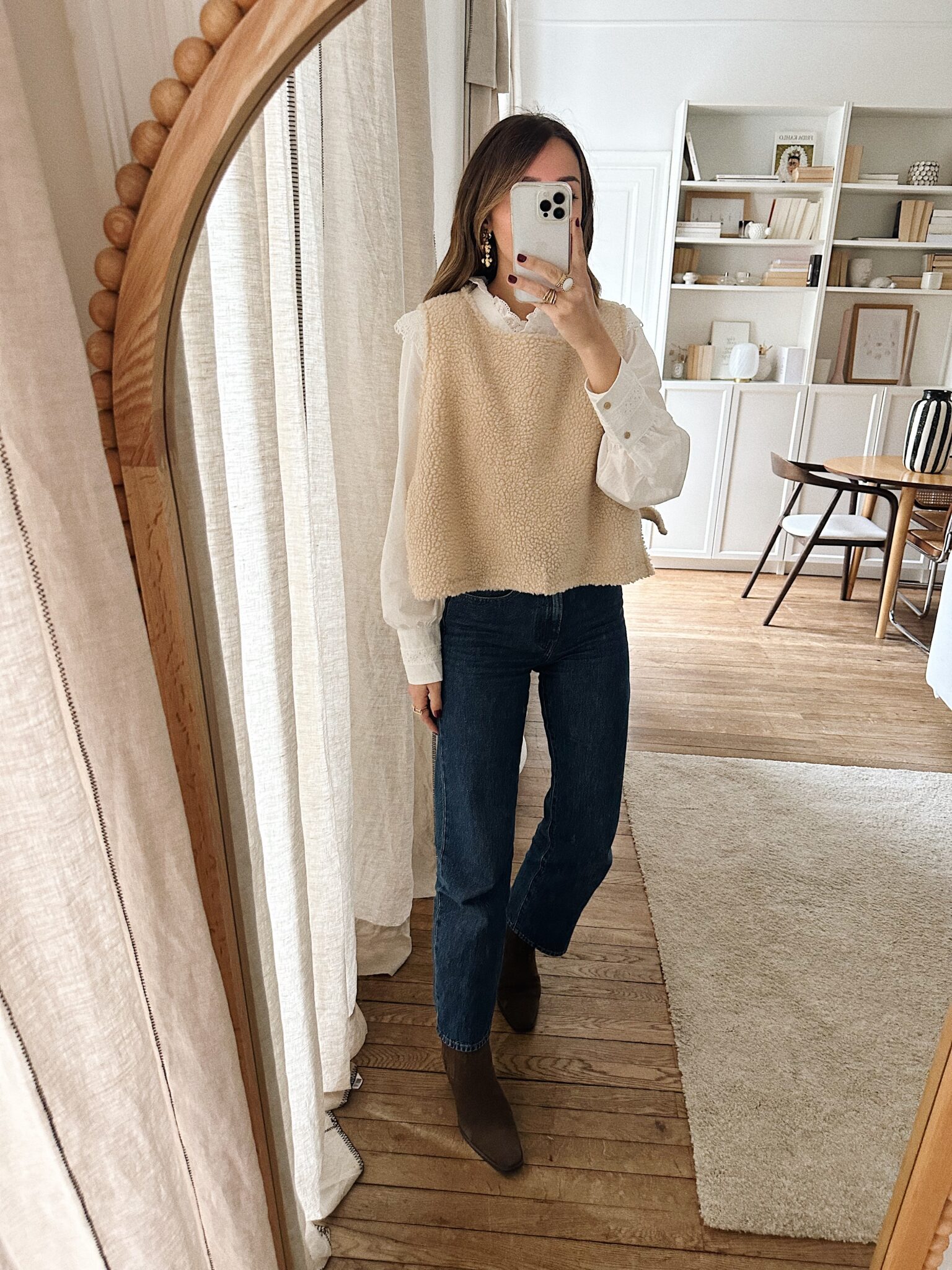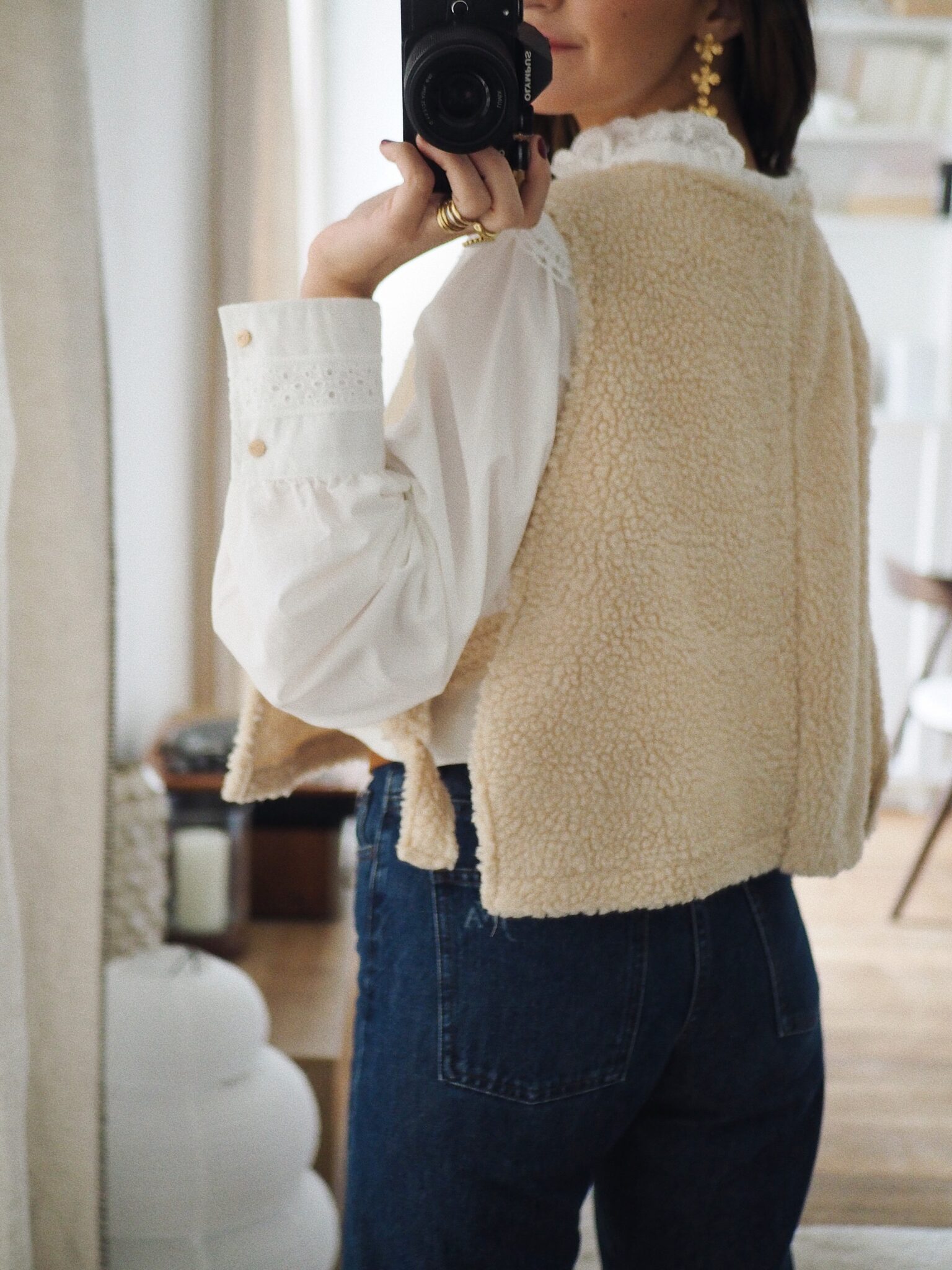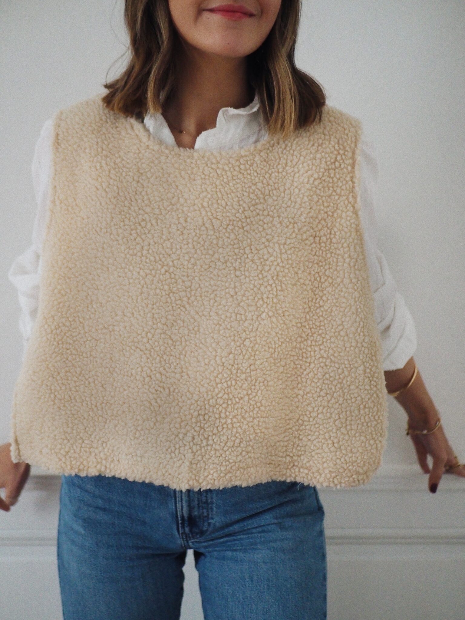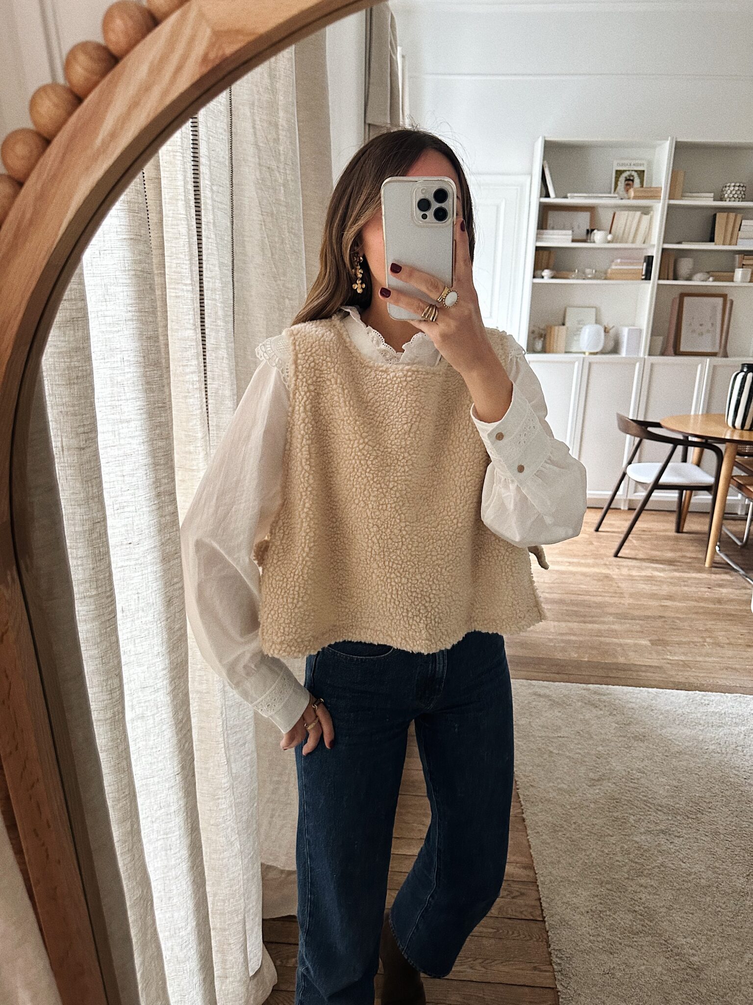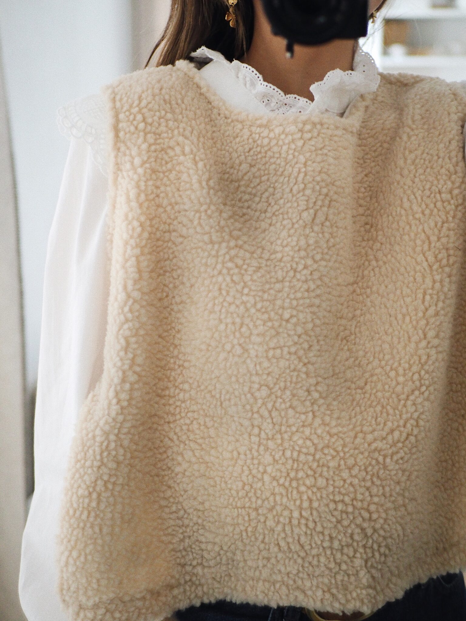 – Pull sans manches effet sherpa tout doux – Coloris beige clair lumineux – Coupe droite légèrement ample – Encolure ronde dégagée – Liens à nouer sur les côtés – Une pièce originale, idéale à superposer sur une chemise, un col claudine ou un sous-pull
